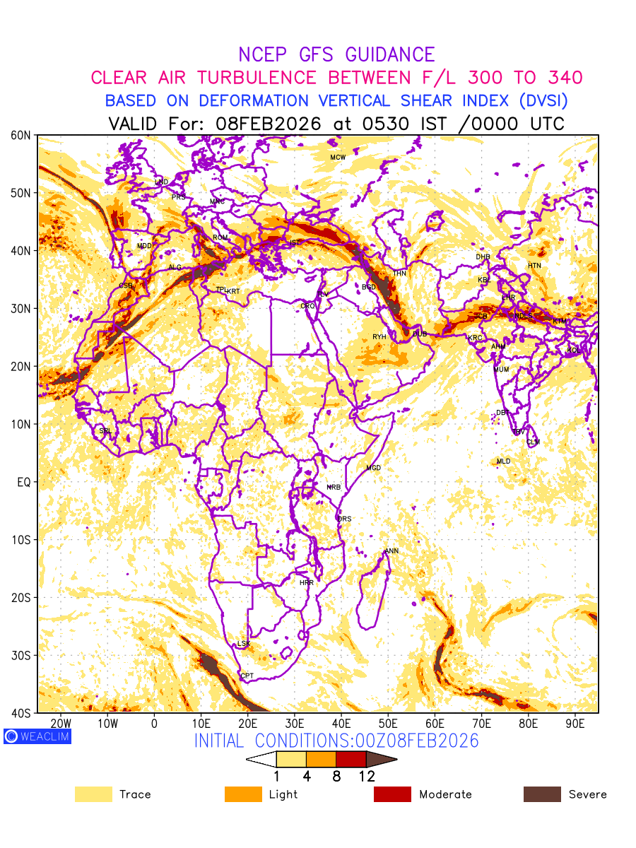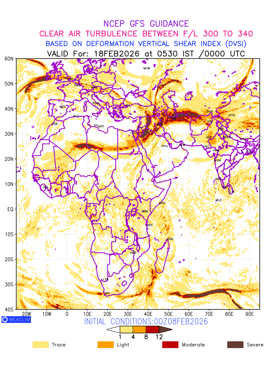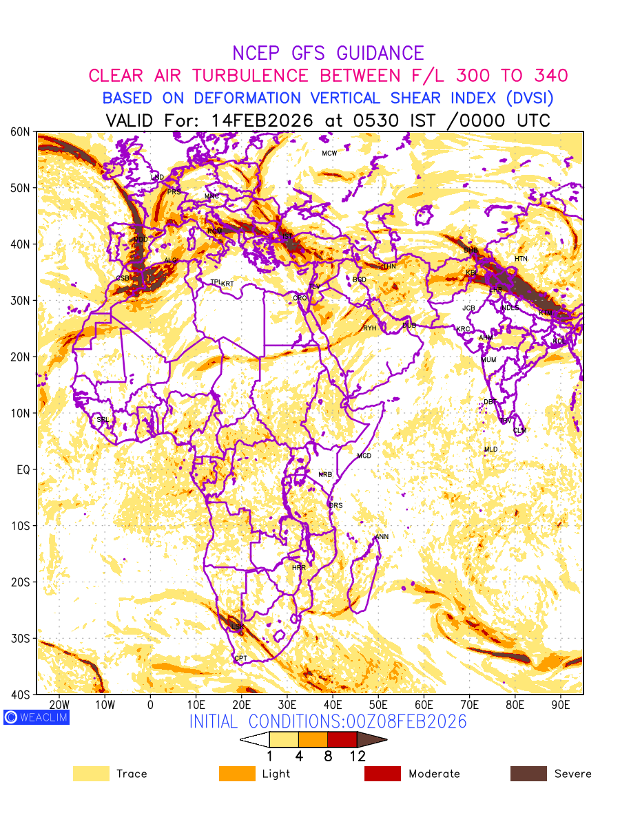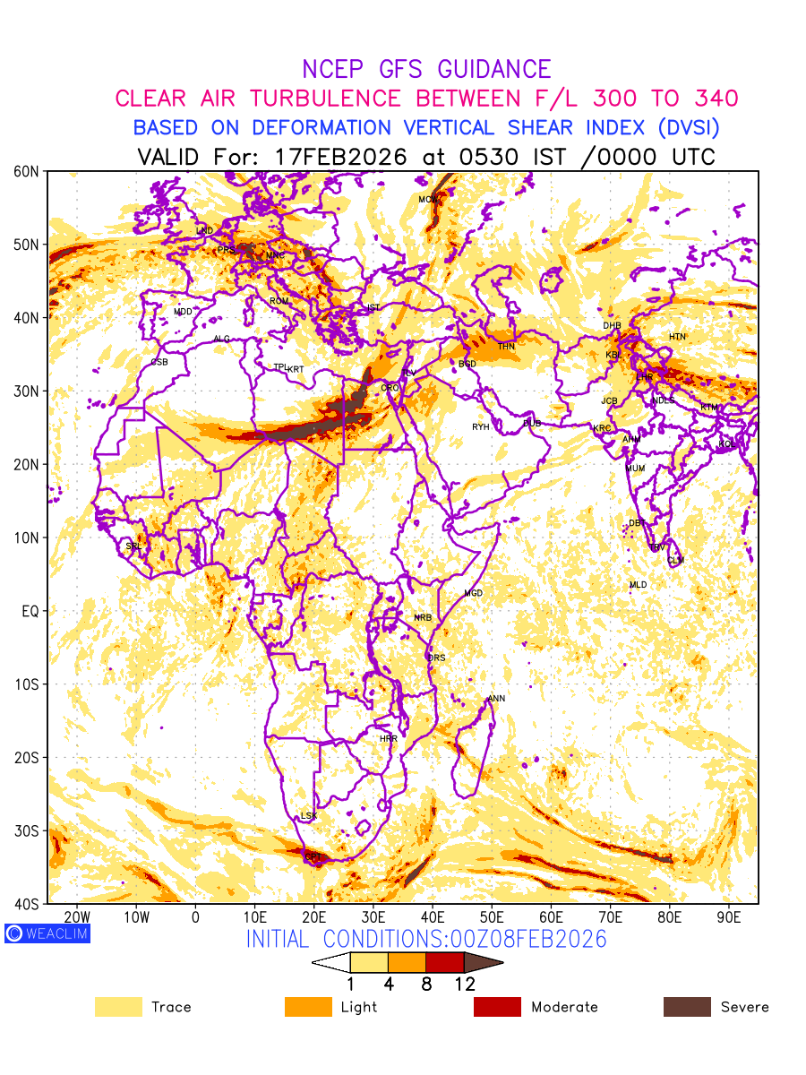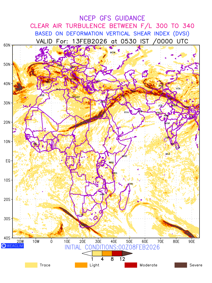 Clear Air Turbulence (CAT) is sudden severe turbulence occurring in cloudless regions that causes violent buffeting of aircraft. CAT is commonly applied to higher altitude turbulence associated with wind shear. It is caused by patches of air swirling chaotically within the world’s jet streams—strong air currents that circle the globe from west to east and that we see on weather maps as wide, wavy lines that bend around low- and high-pressure centre. It is prominent between 500hPa to 200hPa. Shown here are the CAT Conditions at 300hPa for the African Region for the next ten days.