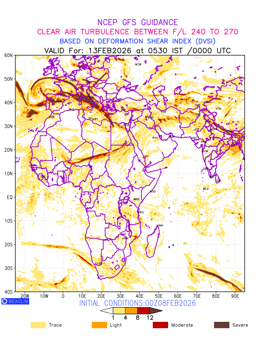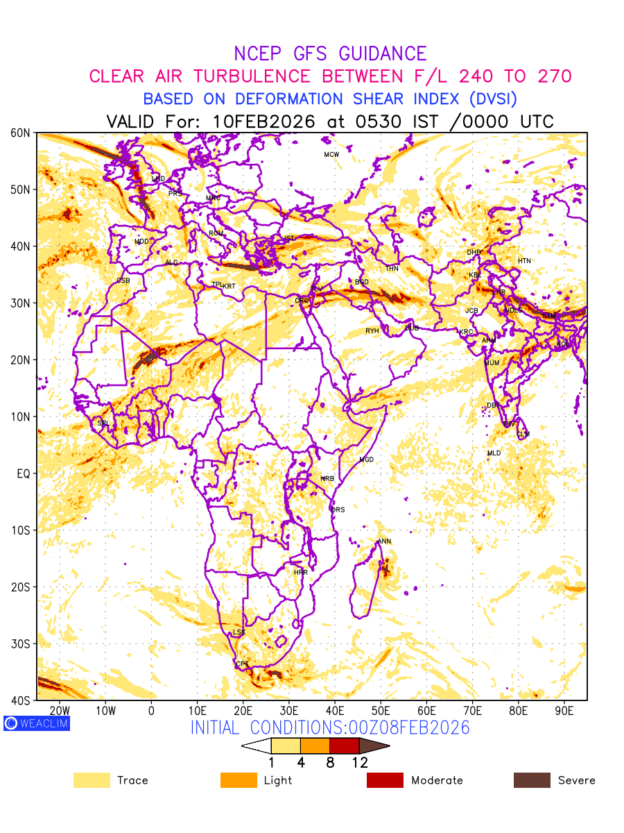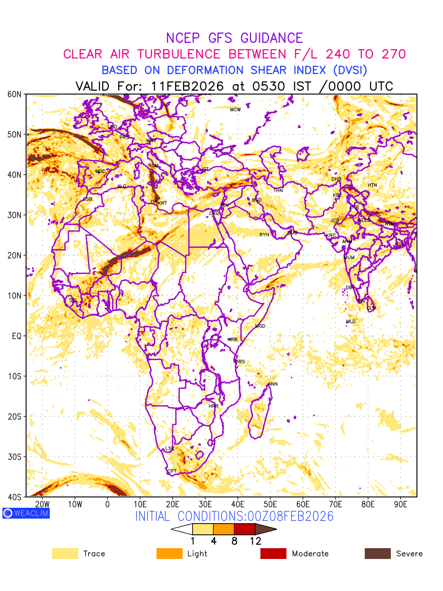 Clear Air Turbulence (CAT) is sudden severe turbulence occurring in cloudless regions that causes violent buffeting of aircraft. CAT is commonly applied to higher altitude turbulence associated with wind shear. It is caused by patches of air swirling chaotically within the world’s jet streams—strong air currents that circle the globe from west to east and that we see on weather maps as wide, wavy lines that bend around low- and high-pressure centre. It is prominent between 500hPa to 200hPa. Shown here are the CAT Conditions at 400hPa for the African Region for the next ten days.