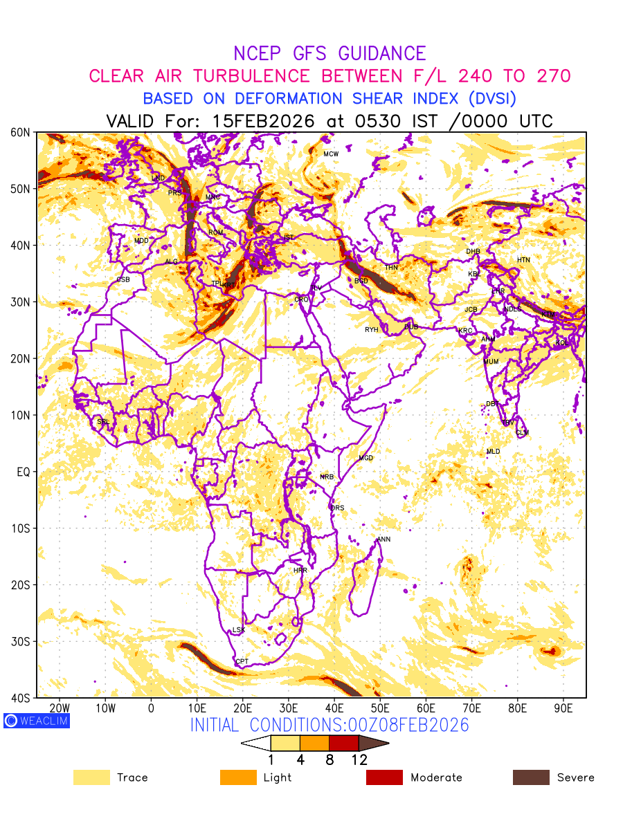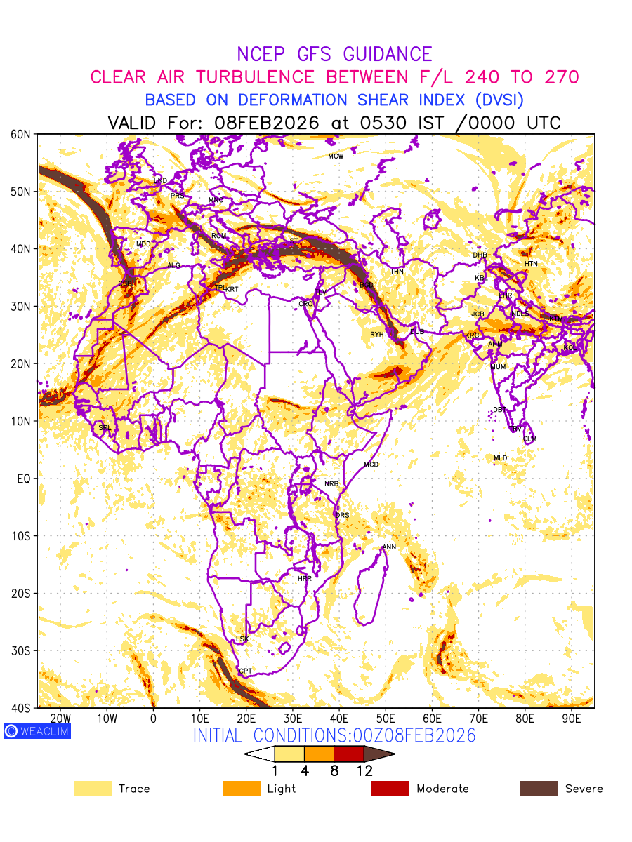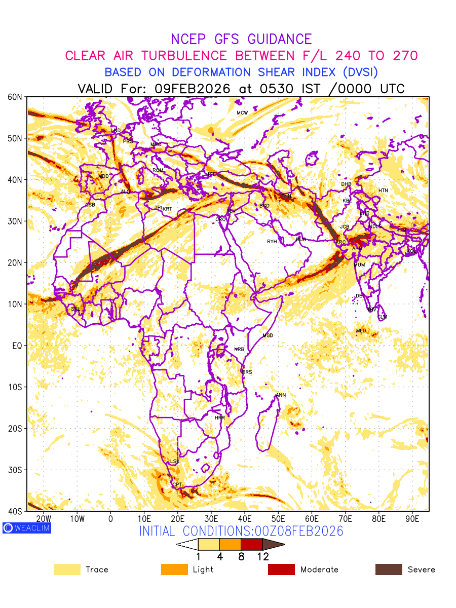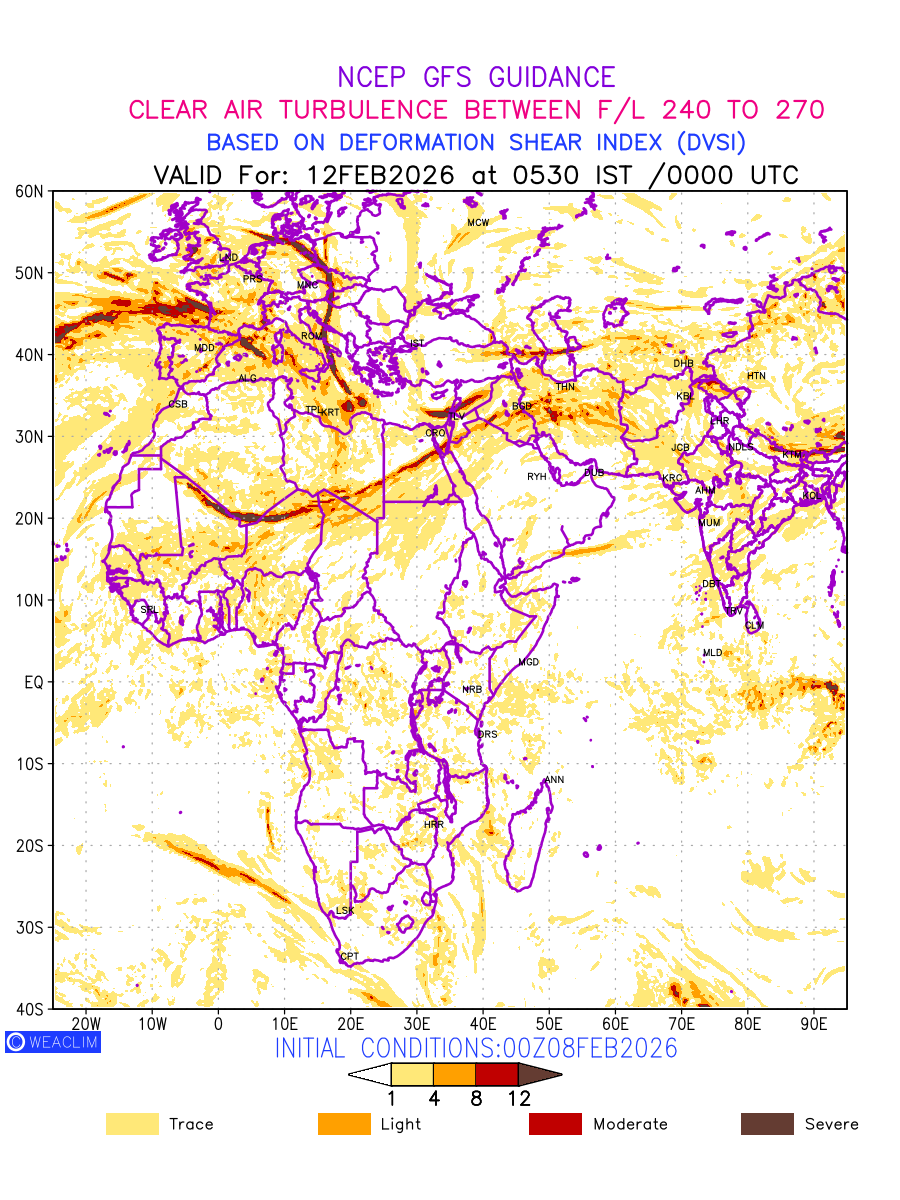 Clear Air Turbulence (CAT) is sudden severe turbulence occurring in cloudless regions that causes violent buffeting of aircraft. CAT is commonly applied to higher altitude turbulence associated with wind shear. It is caused by patches of air swirling chaotically within the world’s jet streams—strong air currents that circle the globe from west to east and that we see on weather maps as wide, wavy lines that bend around low- and high-pressure centre. It is prominent between 500hPa to 200hPa. Shown here are the CAT Conditions at 400hPa for the African Region for the next ten days.