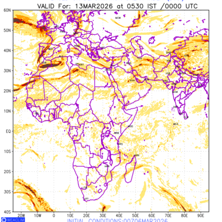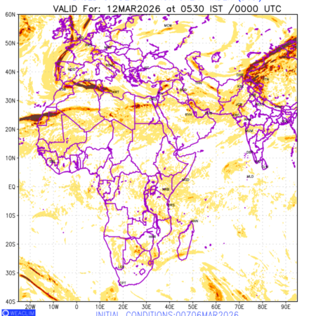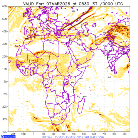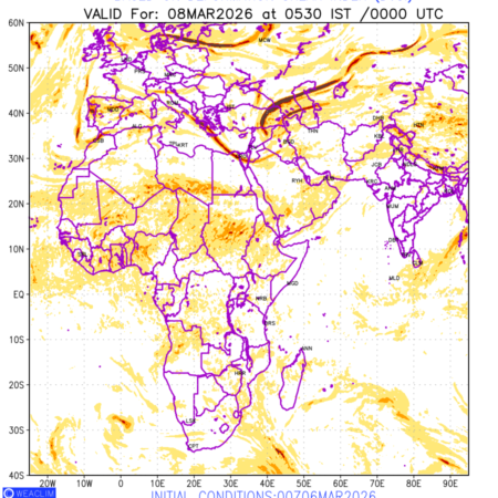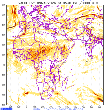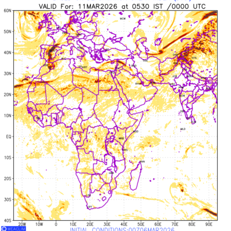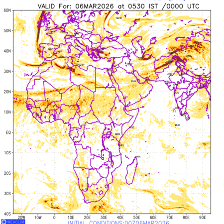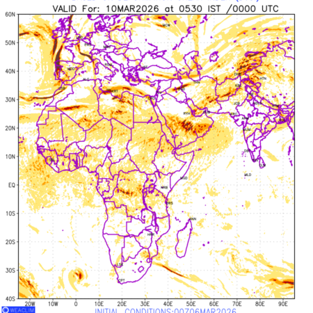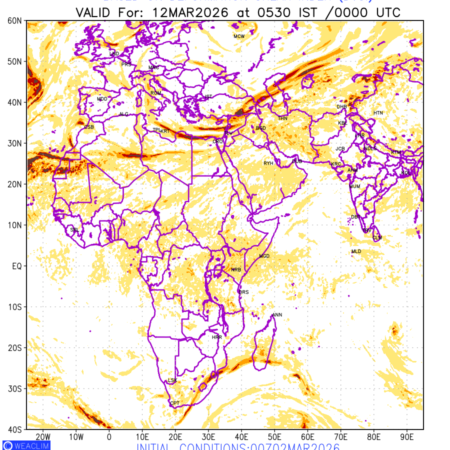 Clear Air Turbulence (CAT) is sudden severe turbulence occurring in cloudless regions that causes violent buffeting of aircraft. CAT is commonly applied to higher altitude turbulence associated with wind shear. It is caused by patches of air swirling chaotically within the world’s jet streams—strong air currents that circle the globe from west to east and that we see on weather maps as wide, wavy lines that bend around low- and high-pressure centre. It is prominent between 500hPa to 200hPa. Shown here are the CAT Conditions at 400hPa for the African Region for the next ten days.