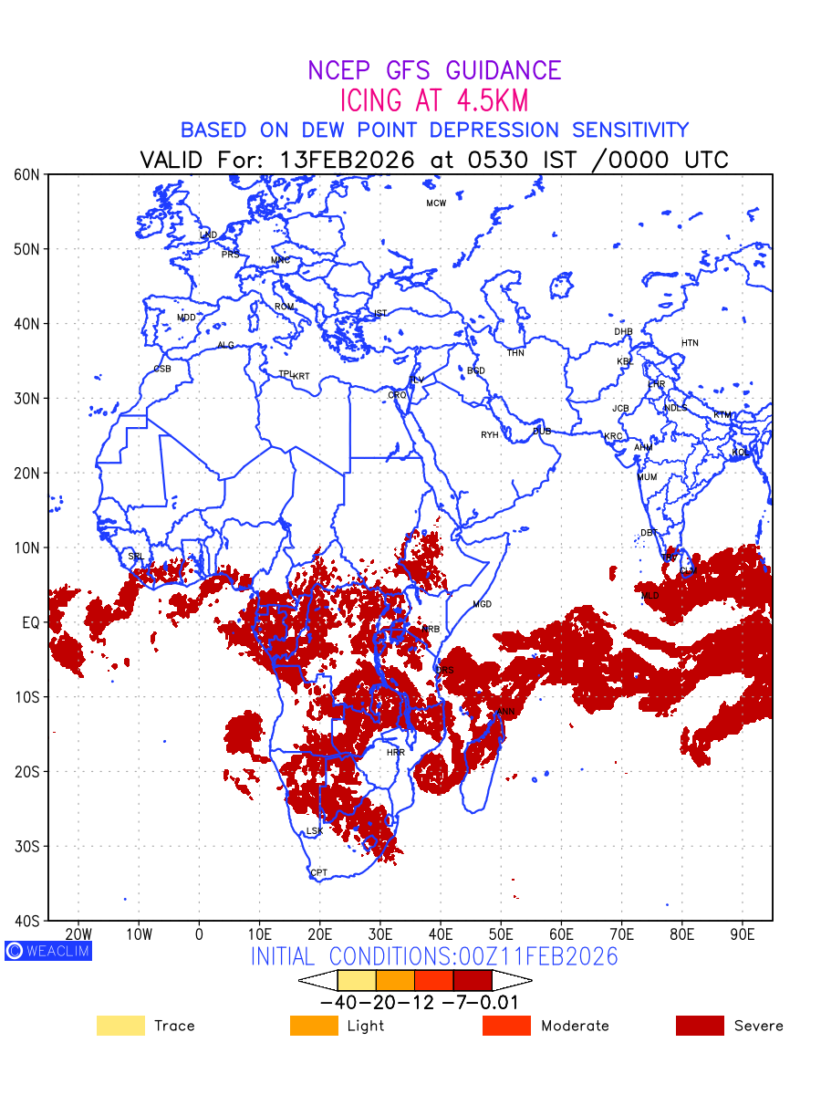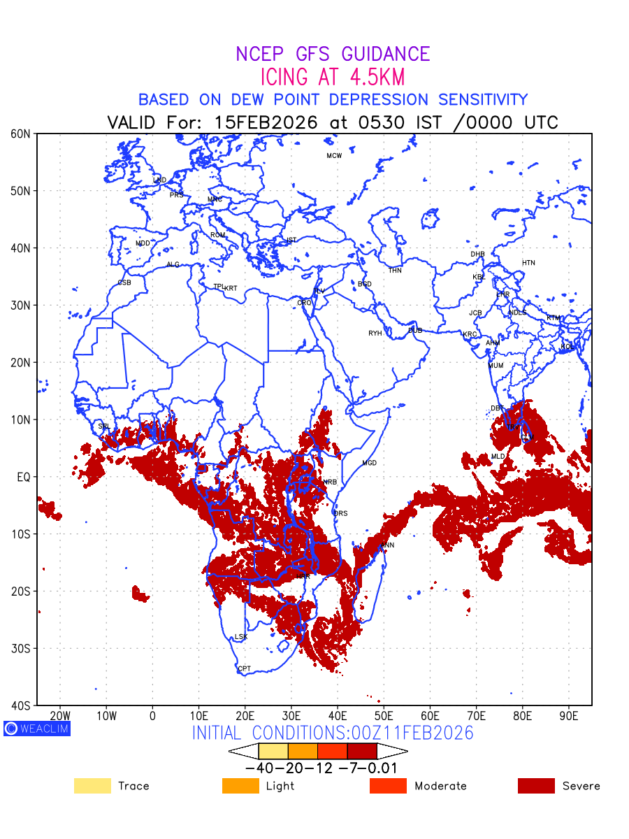 Known icing conditions exist when visible moisture or high relative humidity combines with temperatures near or below freezing. Icing conditions are only present in temperatures between 0ºC and -40ºC, with the highest risk occurring between 0ºC and -15ºC. The size and temperature of the supercooled water droplets that impact on the aircraft determine the category of ice that is formed. Icing is prominent between 600hPa to 700hPa level. Shown here is the icing condition at 600hPa level for the African Region for the next ten days.
