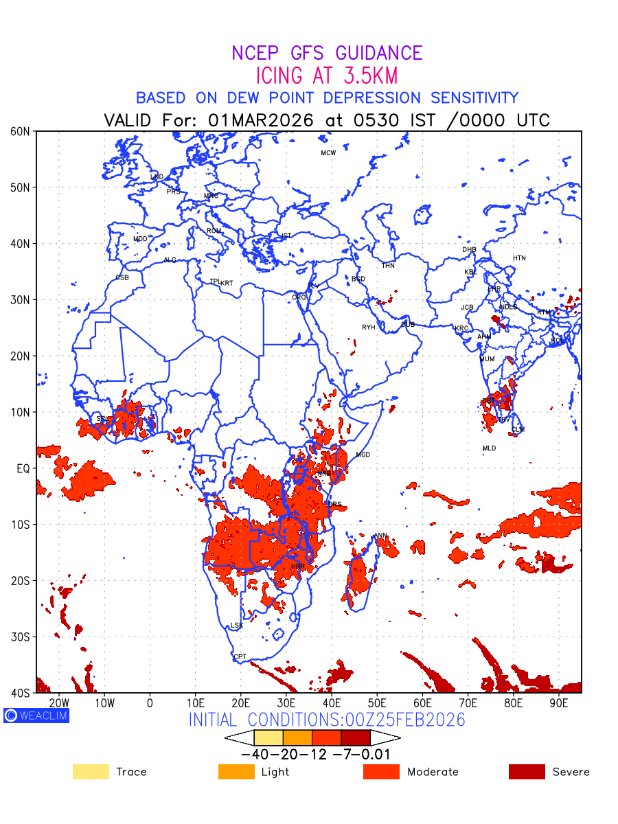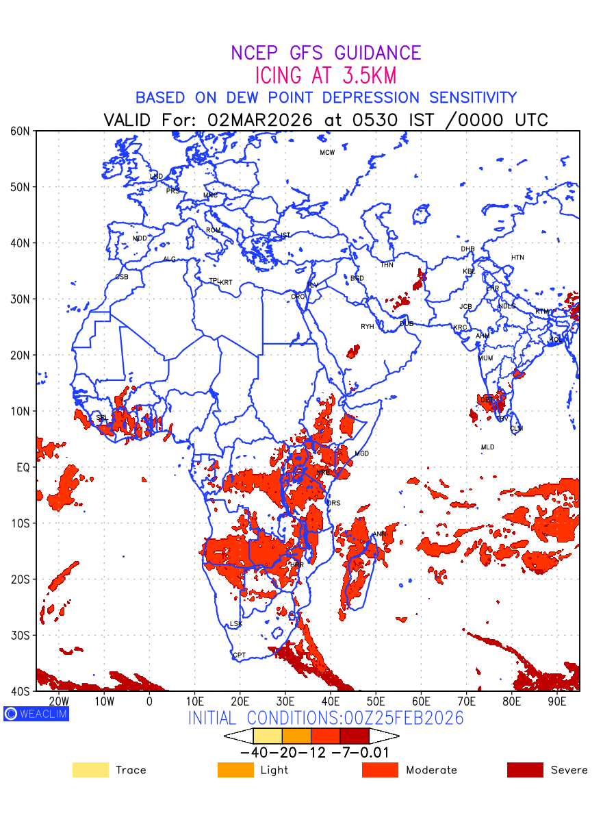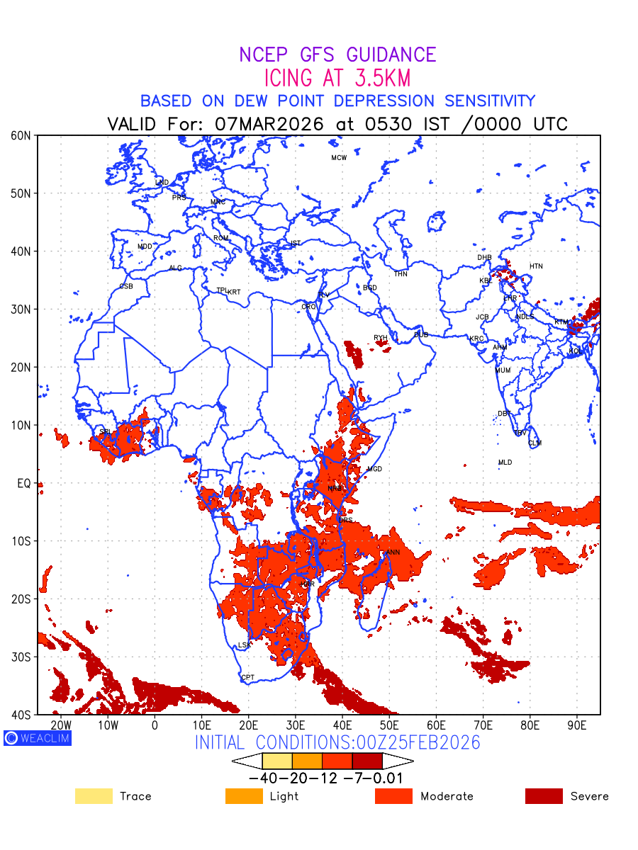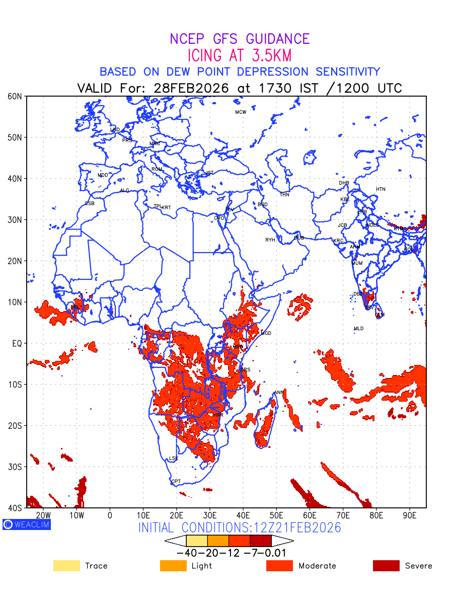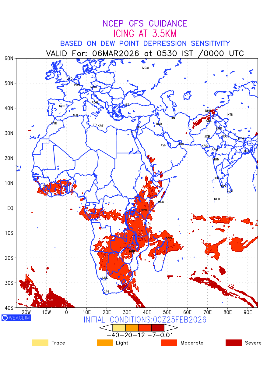 Known icing conditions exist when visible moisture or high relative humidity combines with temperatures near or below freezing. Icing conditions are only present in temperatures between 0ºC and -40ºC, with the highest risk occurring between 0ºC and -15ºC. The size and temperature of the supercooled water droplets that impact on the aircraft determine the category of ice that is formed. Icing is prominent between 600hPa to 700hPa level. Shown here is the icing condition at 700hPa level for the African Region for the next ten days.