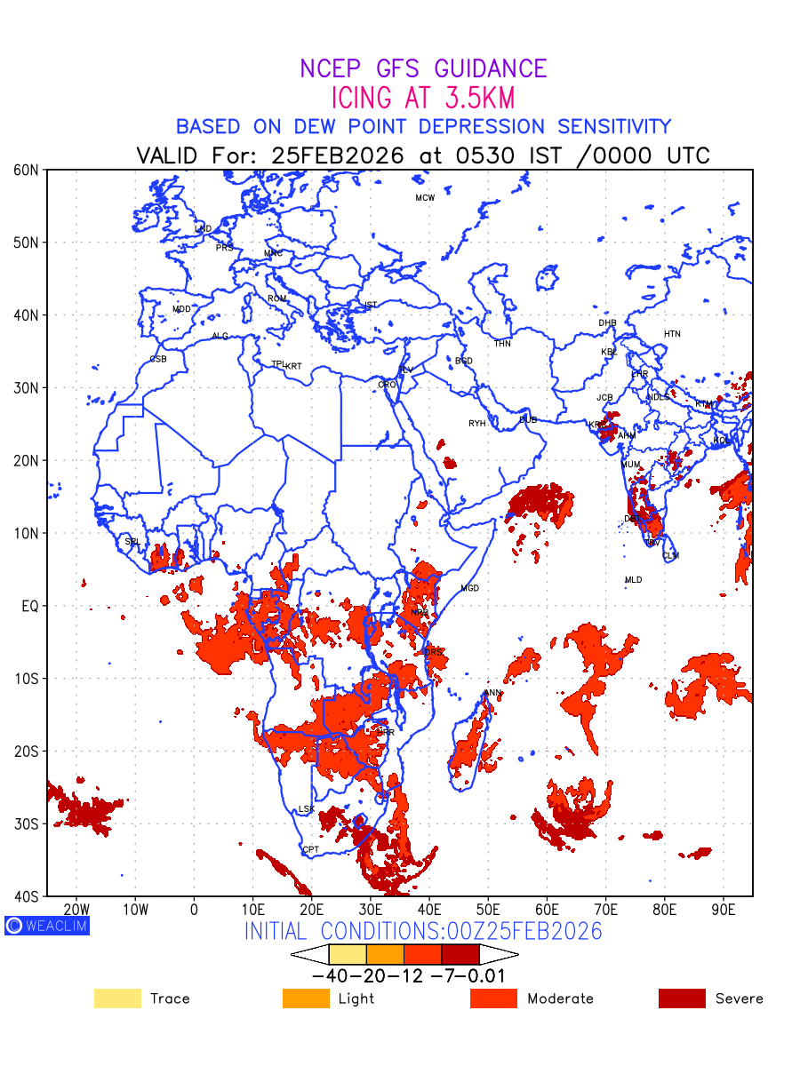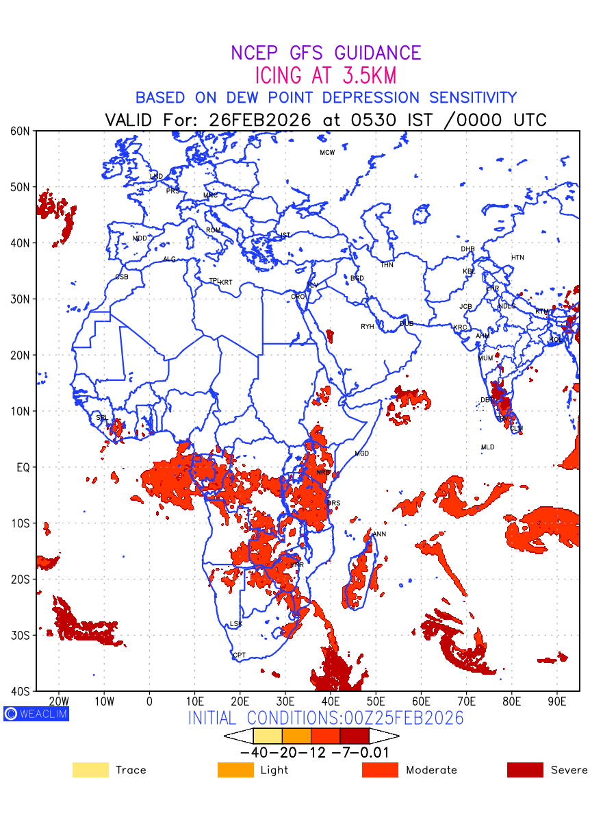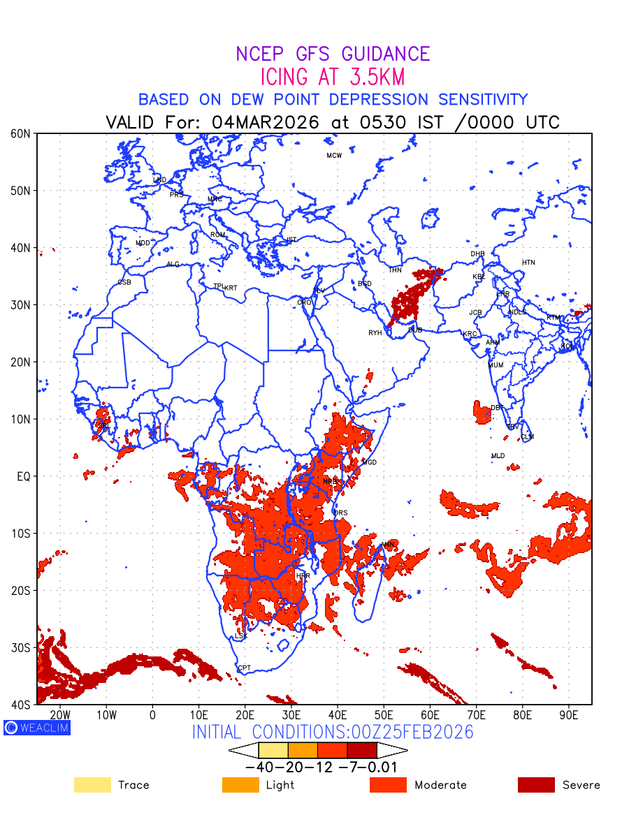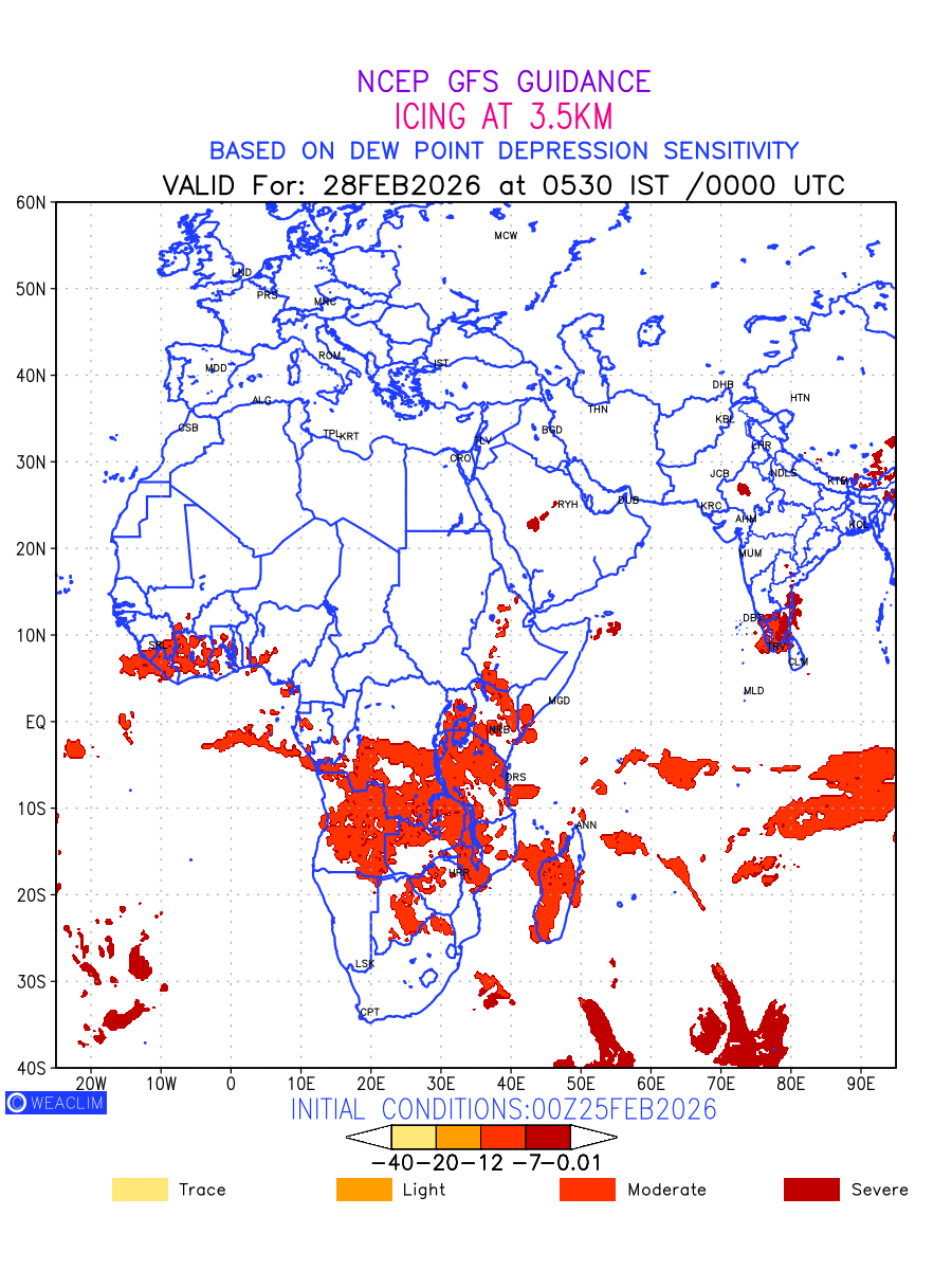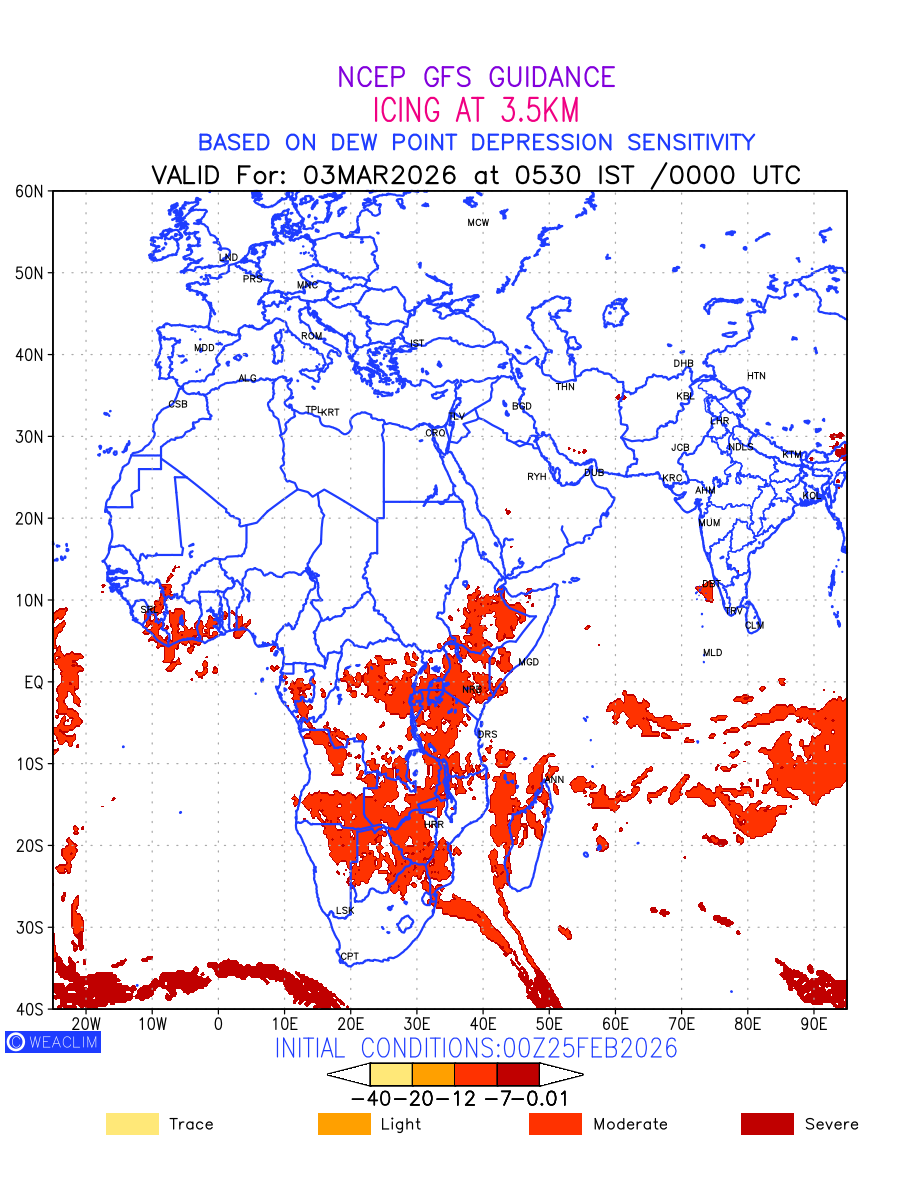 Known icing conditions exist when visible moisture or high relative humidity combines with temperatures near or below freezing. Icing conditions are only present in temperatures between 0ºC and -40ºC, with the highest risk occurring between 0ºC and -15ºC. The size and temperature of the supercooled water droplets that impact on the aircraft determine the category of ice that is formed. Icing is prominent between 600hPa to 700hPa level. Shown here is the icing condition at 700hPa level for the African Region for the next ten days.