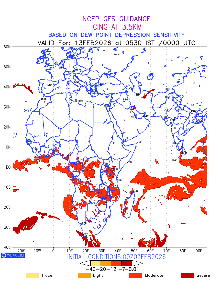 Known icing conditions exist when visible moisture or high relative humidity combines with temperatures near or below freezing. Icing conditions are only present in temperatures between 0ºC and -40ºC, with the highest risk occurring between 0ºC and -15ºC. The size and temperature of the supercooled water droplets that impact on the aircraft determine the category of ice that is formed. Icing is prominent between 600hPa to 700hPa level. Shown here is the icing condition at 700hPa level for the African Region for the next ten days.