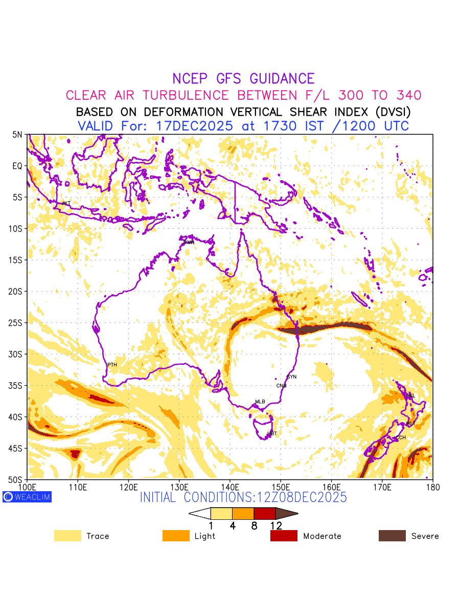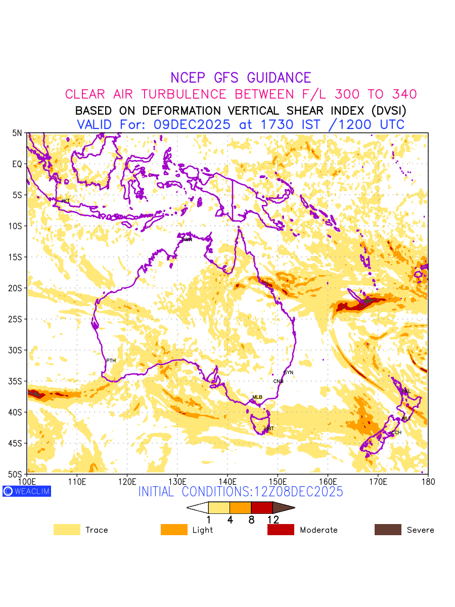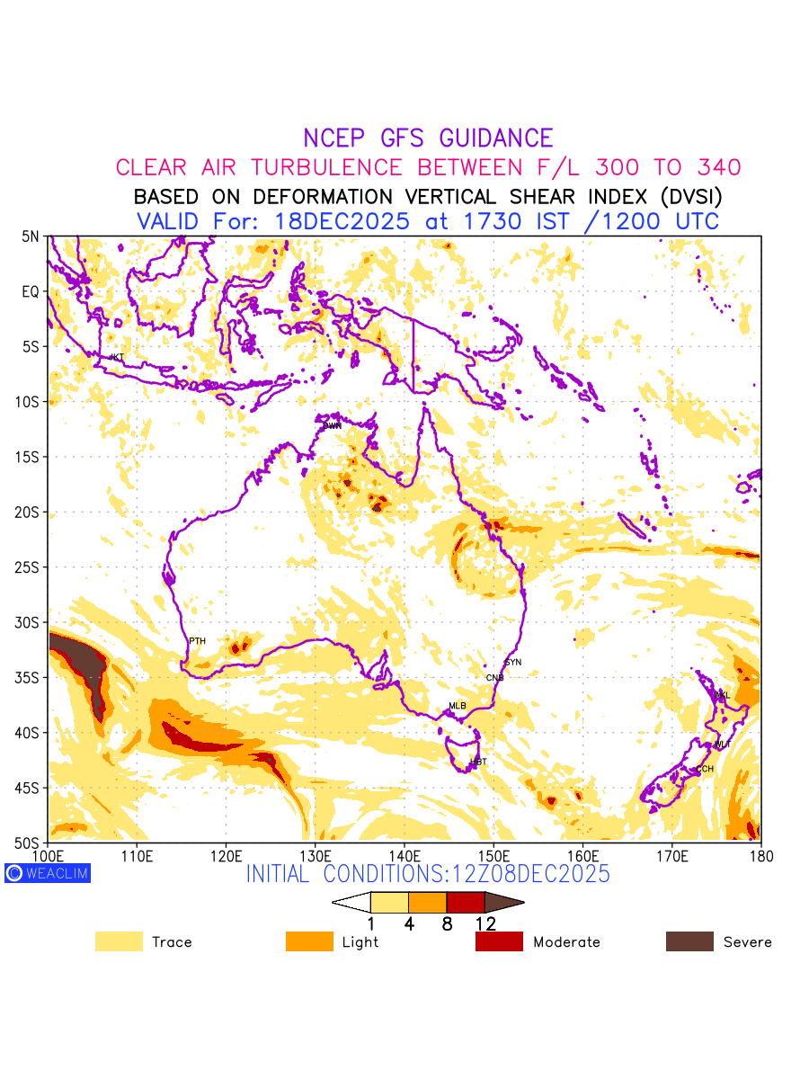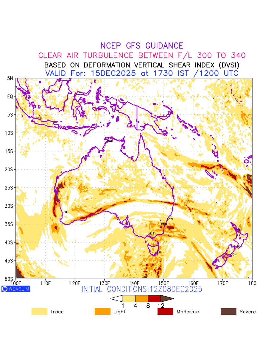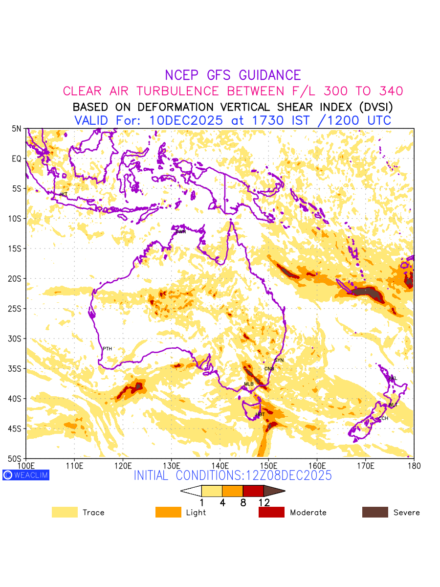 Clear Air Turbulence (CAT) is sudden severe turbulence occurring in cloudless regions that causes violent buffeting of aircraft. CAT is commonly applied to higher altitude turbulence associated with wind shear. It is caused by patches of air swirling chaotically within the world’s jet streams—strong air currents that circle the globe from west to east and that we see on weather maps as wide, wavy lines that bend around low- and high-pressure centre. It is prominent between 500hPa to 200hPa. Shown here are the CAT Conditions at 300hPa for the Australian Region for the next ten days.