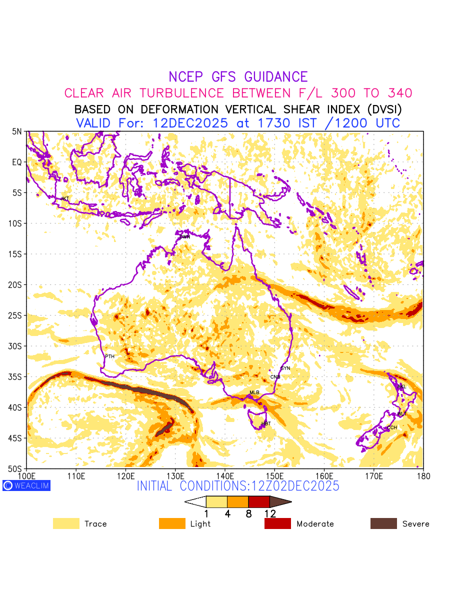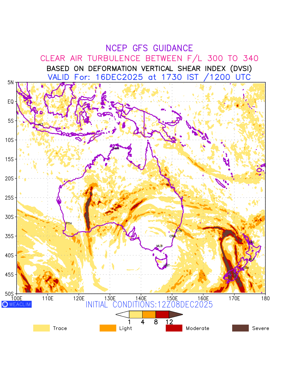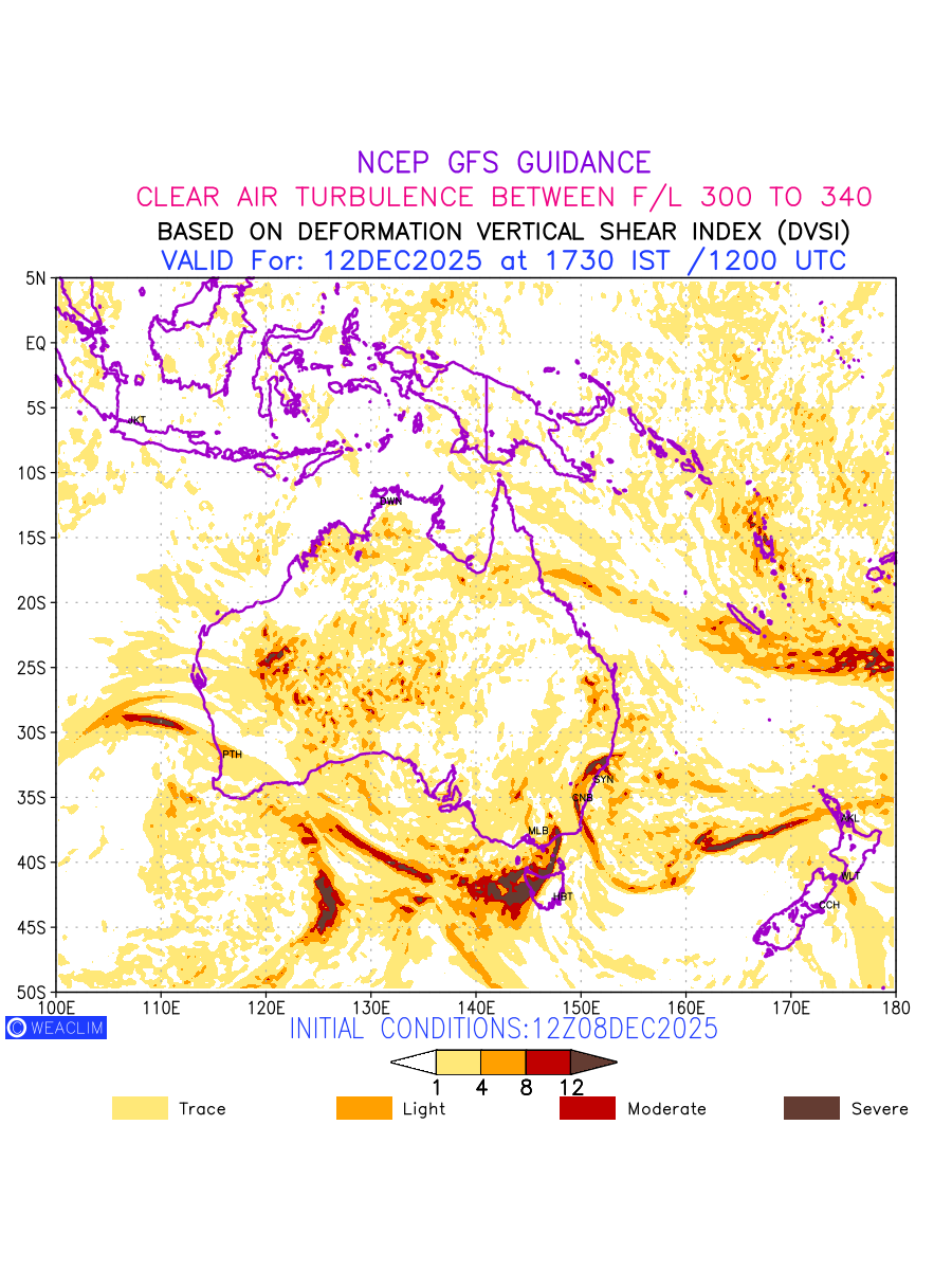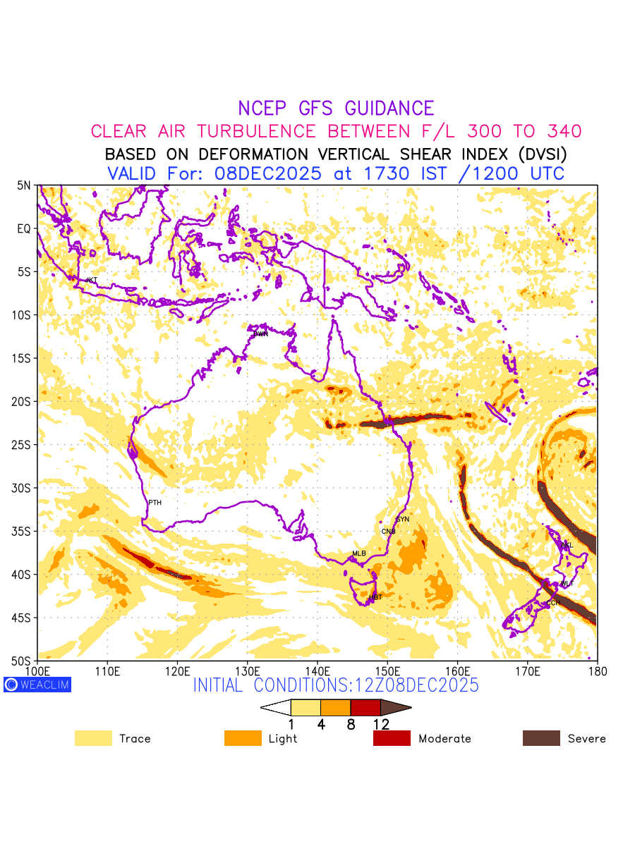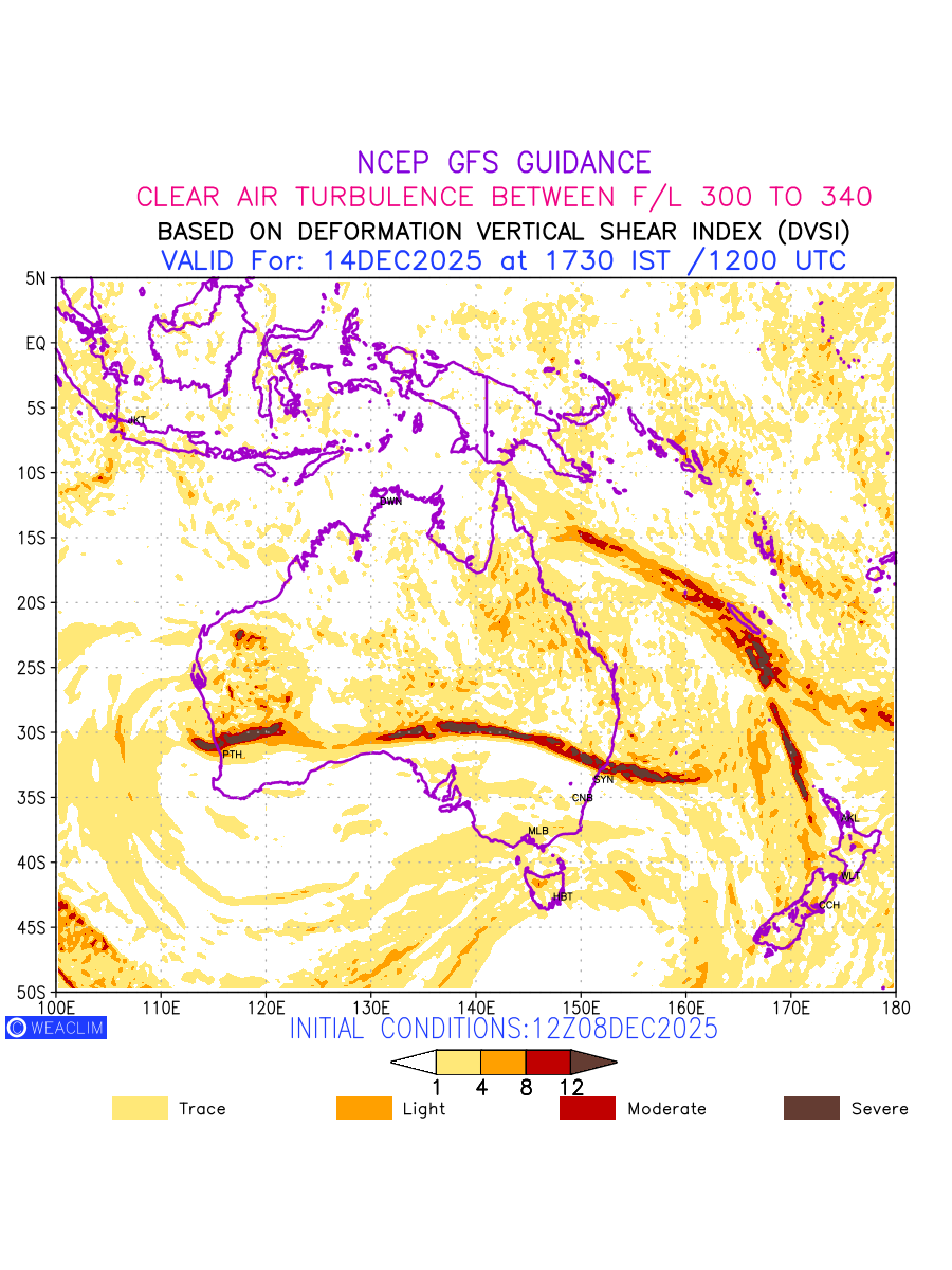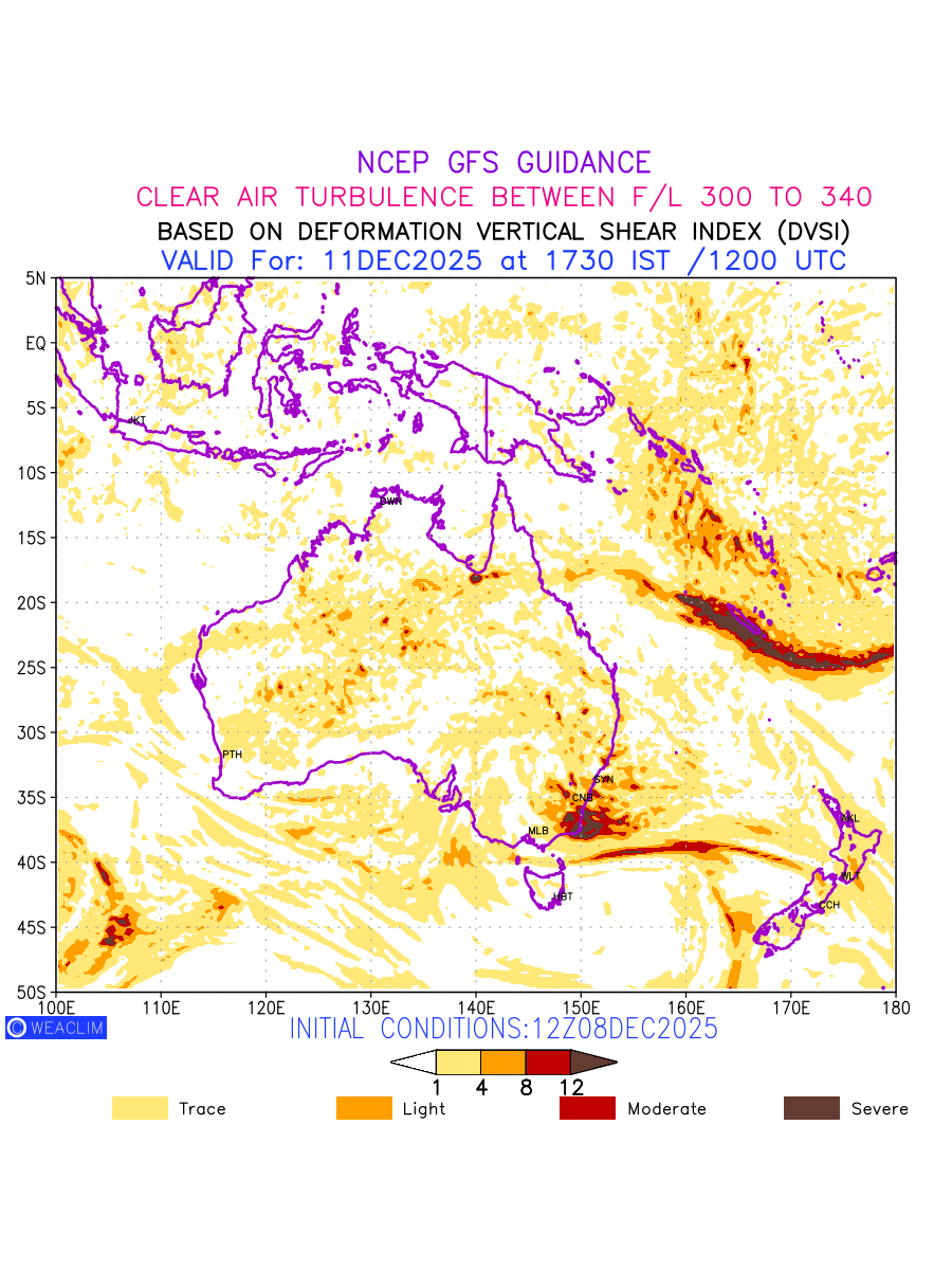 Clear Air Turbulence (CAT) is sudden severe turbulence occurring in cloudless regions that causes violent buffeting of aircraft. CAT is commonly applied to higher altitude turbulence associated with wind shear. It is caused by patches of air swirling chaotically within the world’s jet streams—strong air currents that circle the globe from west to east and that we see on weather maps as wide, wavy lines that bend around low- and high-pressure centre. It is prominent between 500hPa to 200hPa. Shown here are the CAT Conditions at 300hPa for the Australian Region for the next ten days.