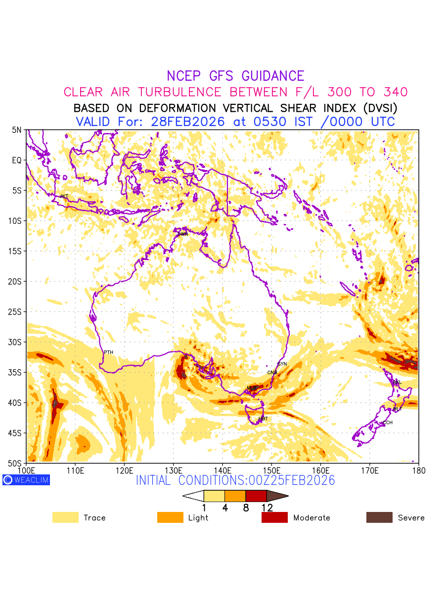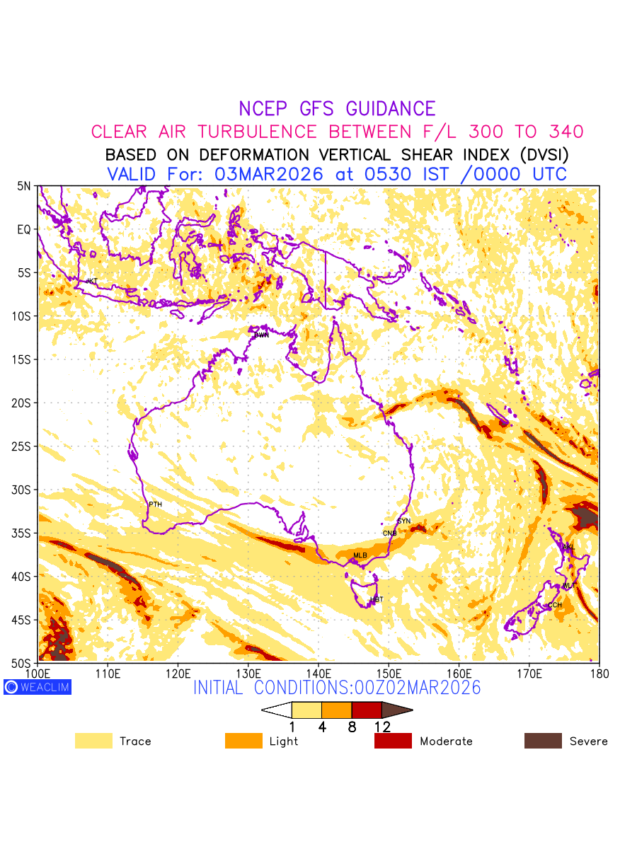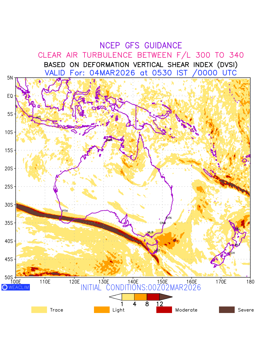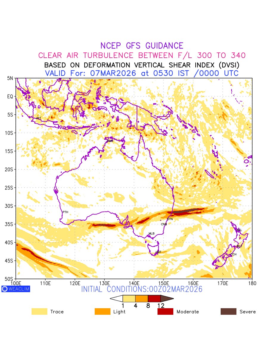 Clear Air Turbulence (CAT) is sudden severe turbulence occurring in cloudless regions that causes violent buffeting of aircraft. CAT is commonly applied to higher altitude turbulence associated with wind shear. It is caused by patches of air swirling chaotically within the world’s jet streams—strong air currents that circle the globe from west to east and that we see on weather maps as wide, wavy lines that bend around low- and high-pressure centre. It is prominent between 500hPa to 200hPa. Shown here are the CAT Conditions at 300hPa for the Australian Region for the next ten days.