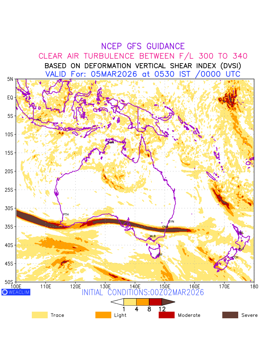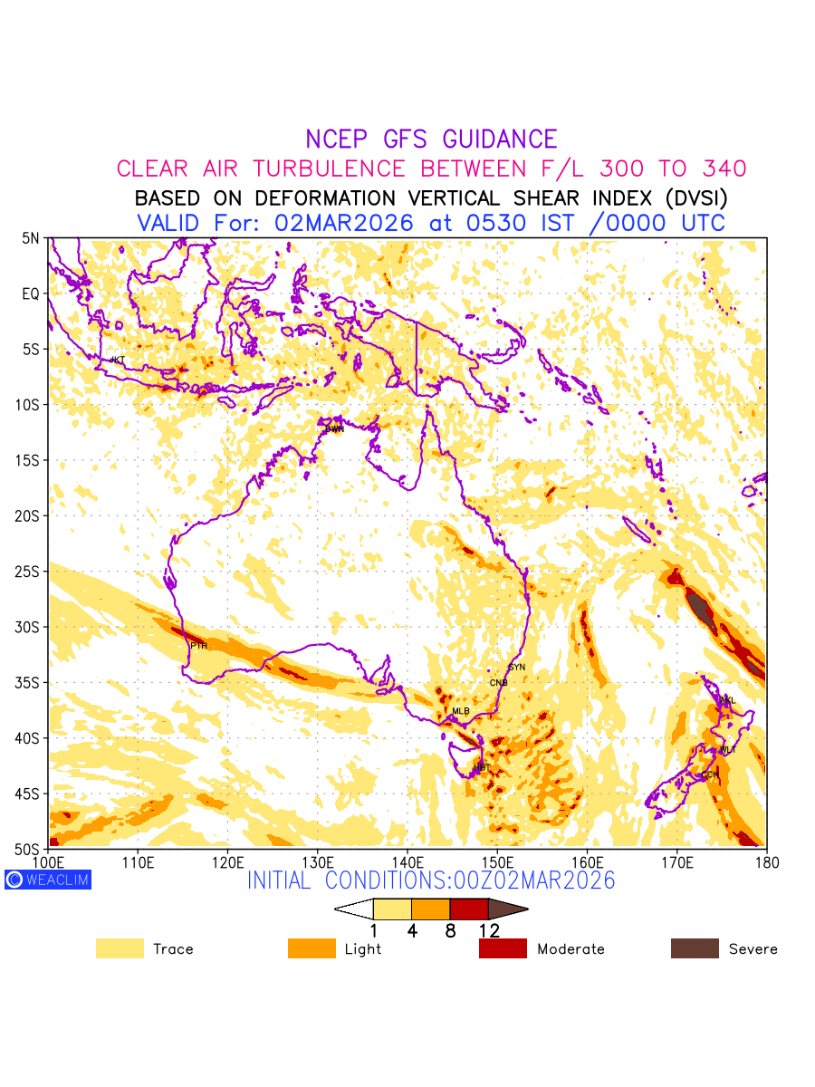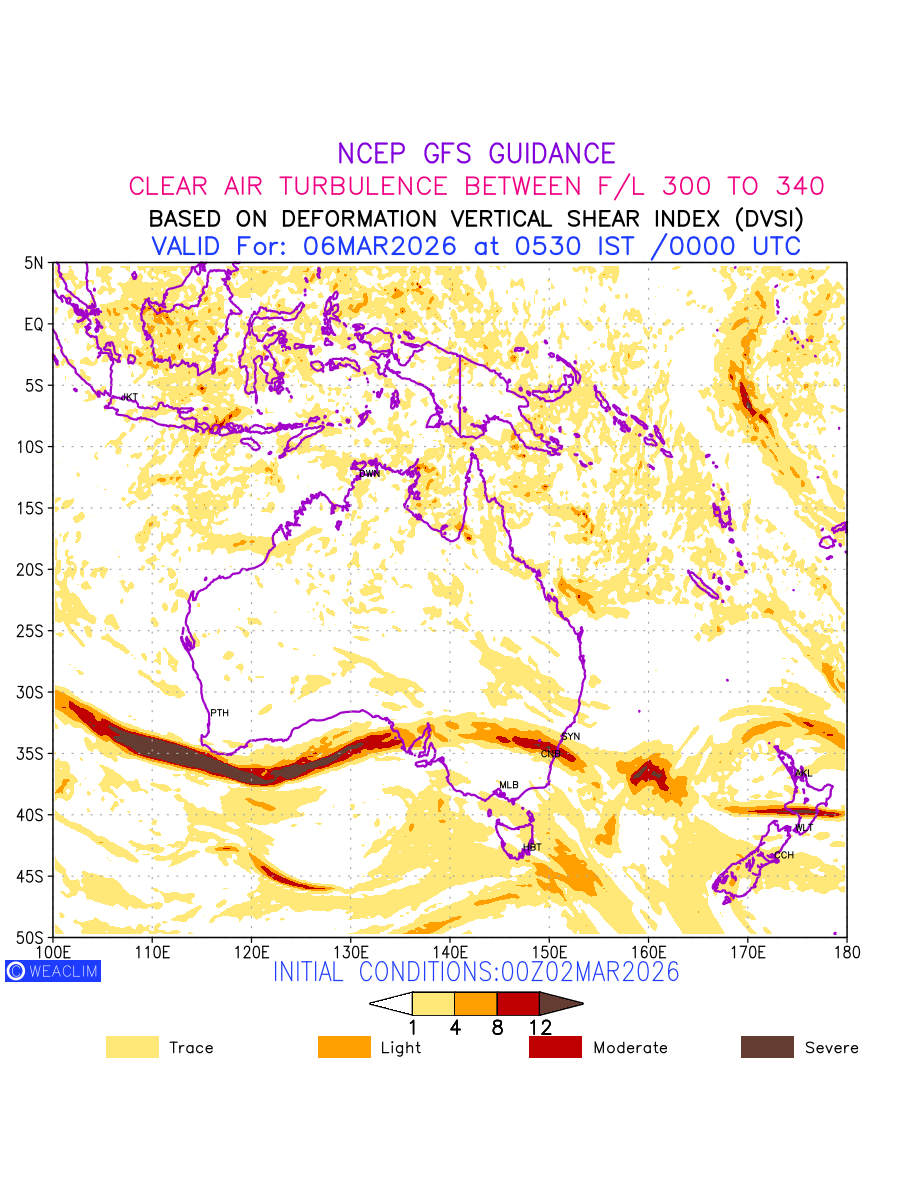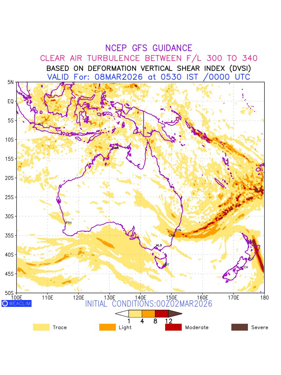 Clear Air Turbulence (CAT) is sudden severe turbulence occurring in cloudless regions that causes violent buffeting of aircraft. CAT is commonly applied to higher altitude turbulence associated with wind shear. It is caused by patches of air swirling chaotically within the world’s jet streams—strong air currents that circle the globe from west to east and that we see on weather maps as wide, wavy lines that bend around low- and high-pressure centre. It is prominent between 500hPa to 200hPa. Shown here are the CAT Conditions at 300hPa for the Australian Region for the next ten days.