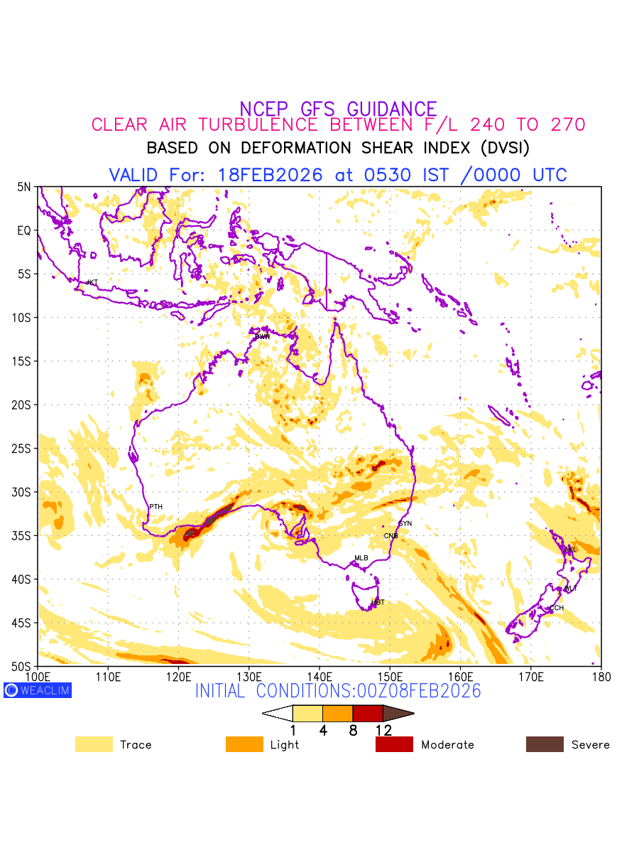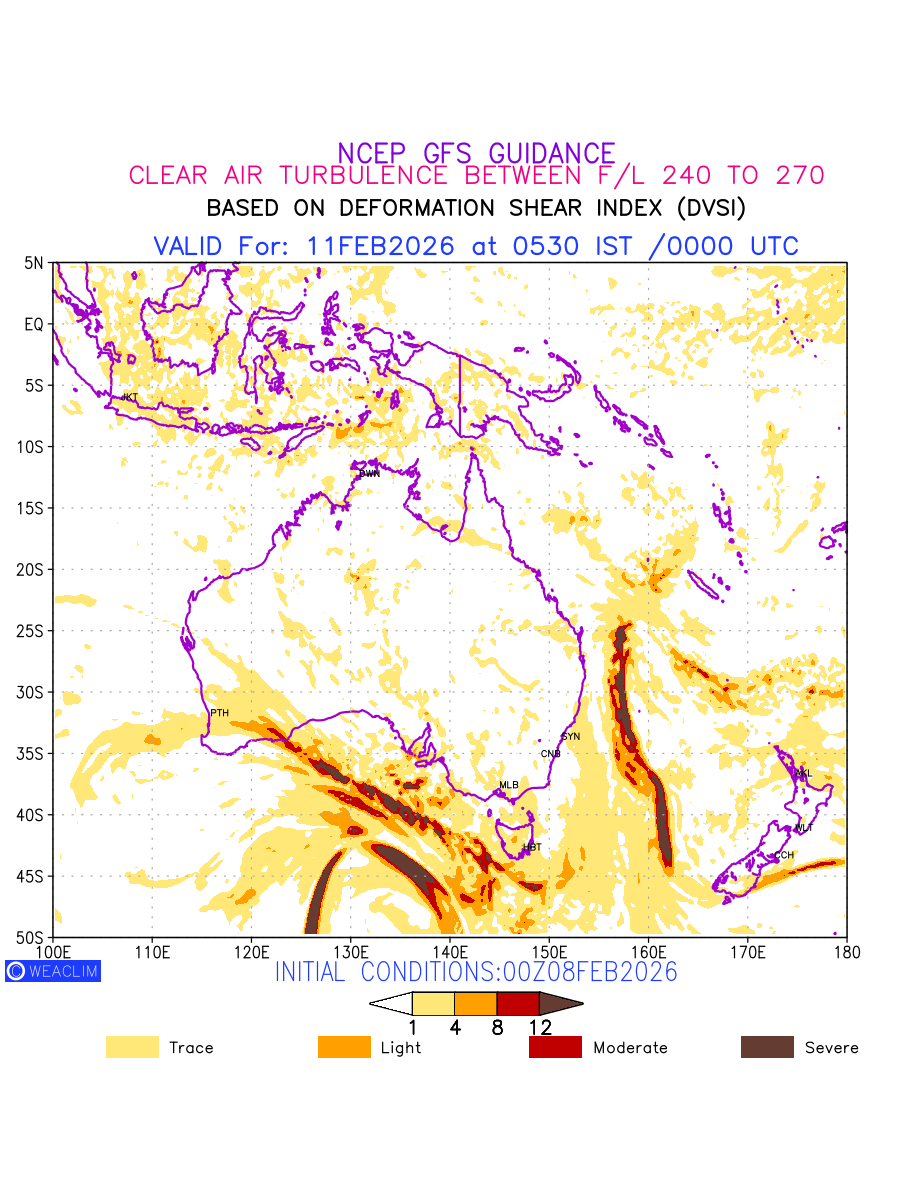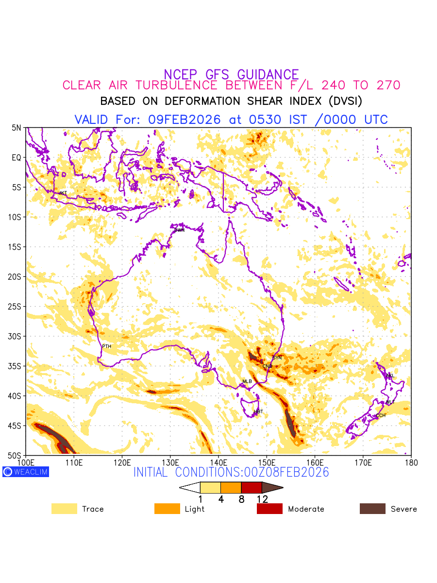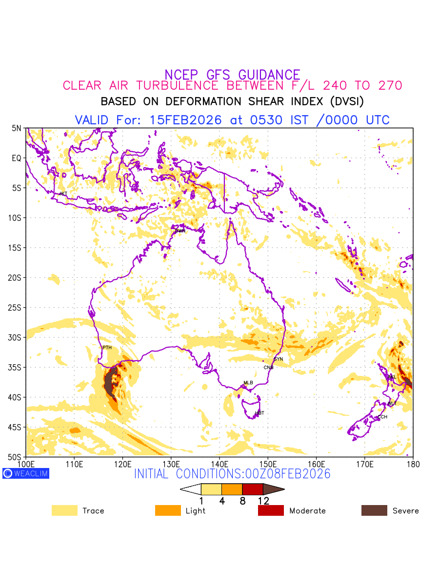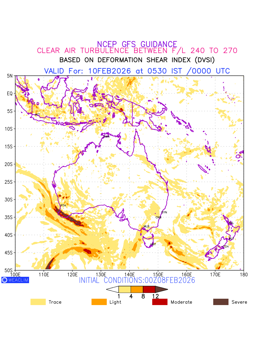 Clear Air Turbulence (CAT) is sudden severe turbulence occurring in cloudless regions that causes violent buffeting of aircraft. CAT is commonly applied to higher altitude turbulence associated with wind shear. It is caused by patches of air swirling chaotically within the world’s jet streams—strong air currents that circle the globe from west to east and that we see on weather maps as wide, wavy lines that bend around low- and high-pressure centre. It is prominent between 500hPa to 200hPa. Shown here are the CAT Conditions at 400hPa for the Australian Region for the next ten days.