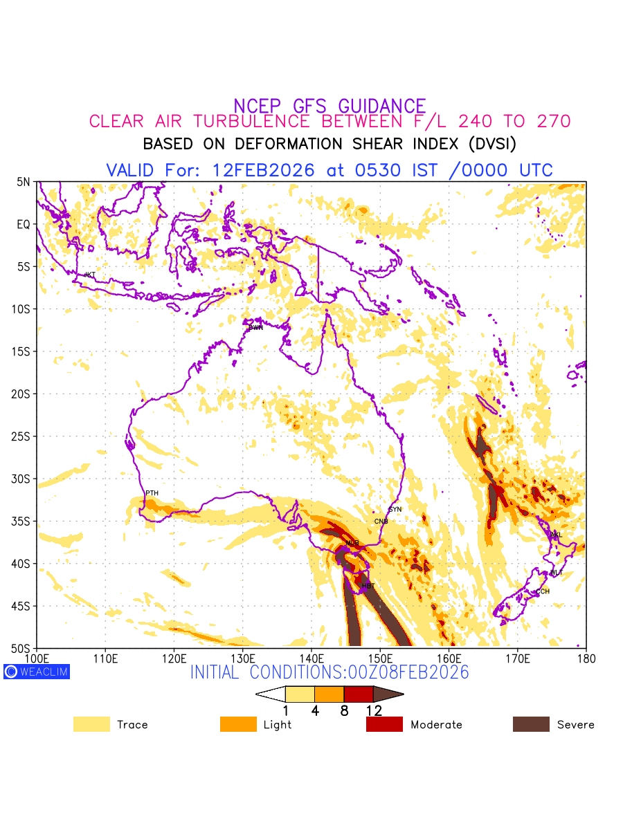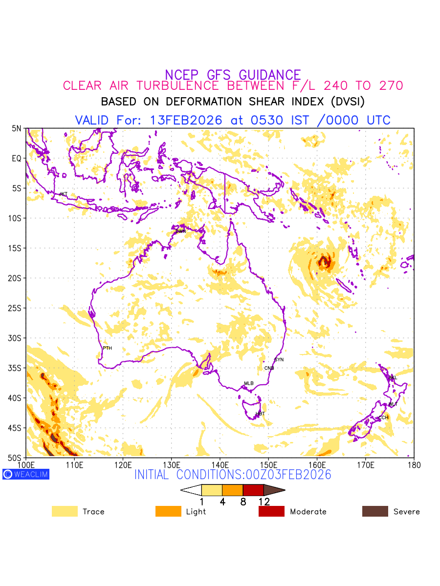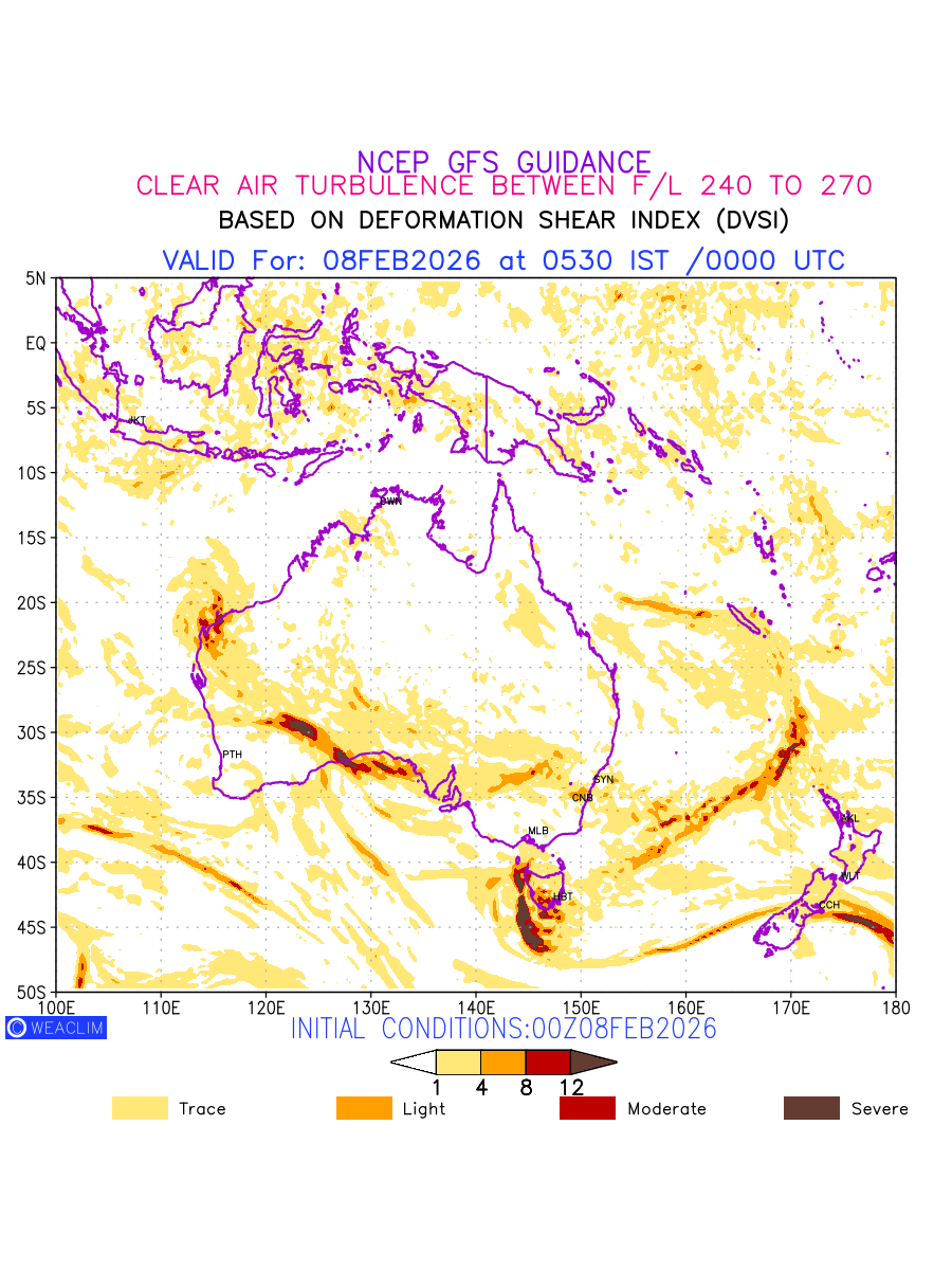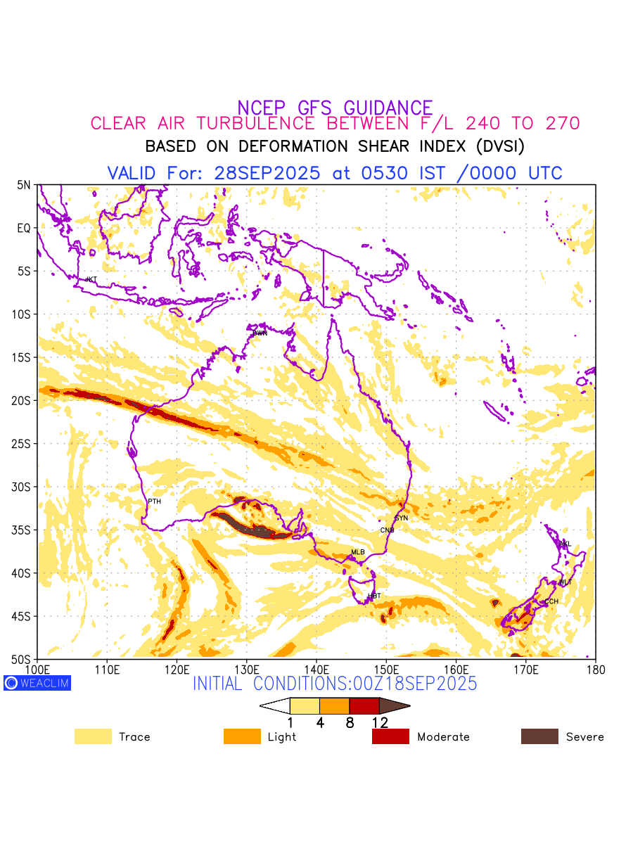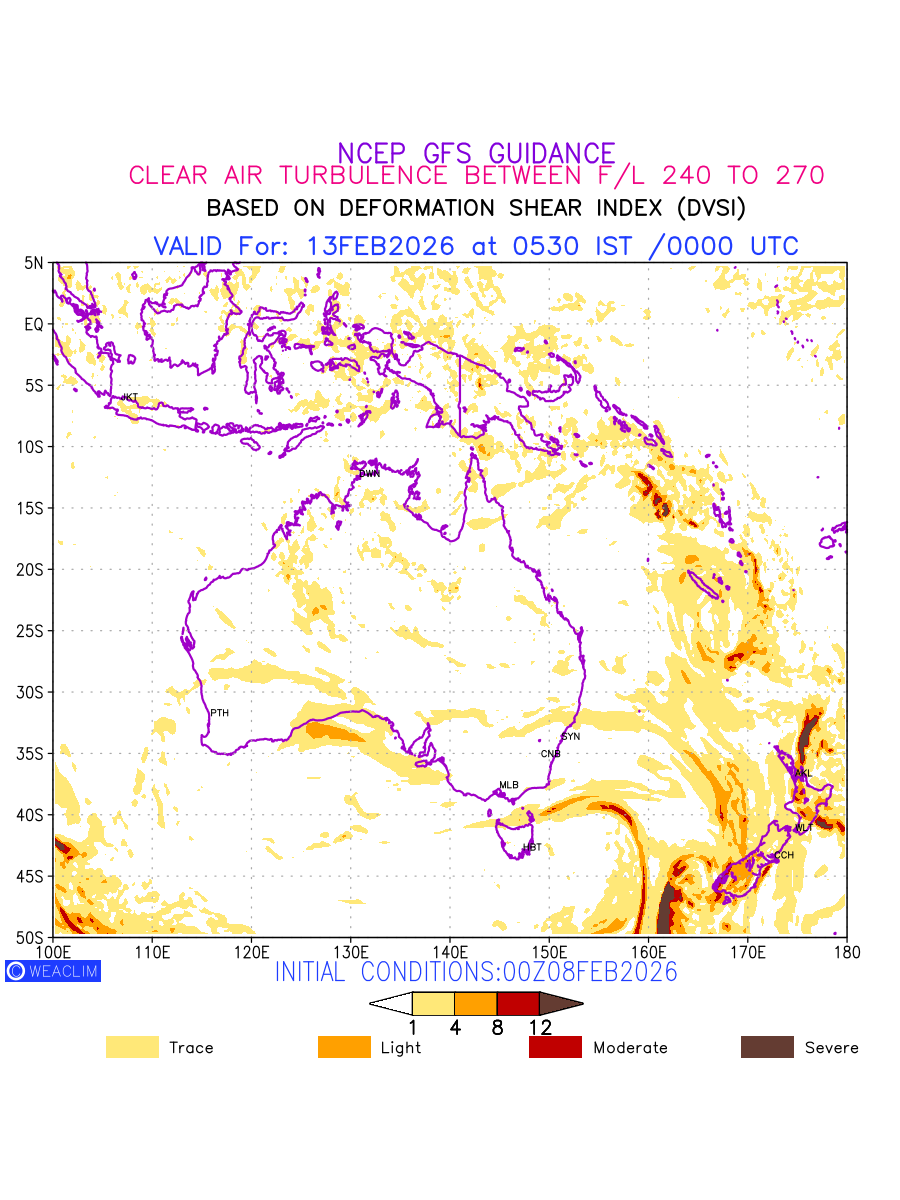 Clear Air Turbulence (CAT) is sudden severe turbulence occurring in cloudless regions that causes violent buffeting of aircraft. CAT is commonly applied to higher altitude turbulence associated with wind shear. It is caused by patches of air swirling chaotically within the world’s jet streams—strong air currents that circle the globe from west to east and that we see on weather maps as wide, wavy lines that bend around low- and high-pressure centre. It is prominent between 500hPa to 200hPa. Shown here are the CAT Conditions at 400hPa for the Australian Region for the next ten days.