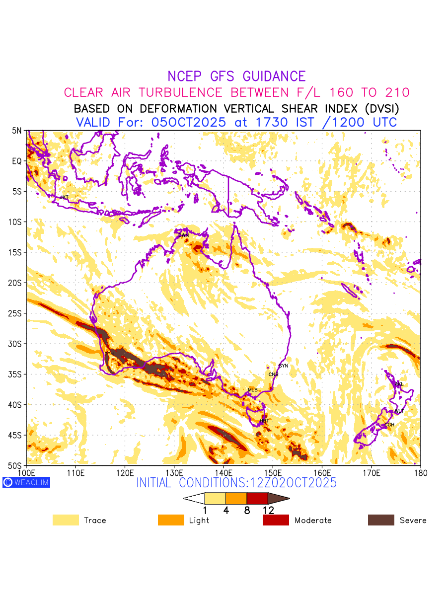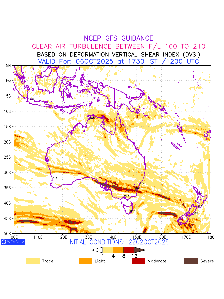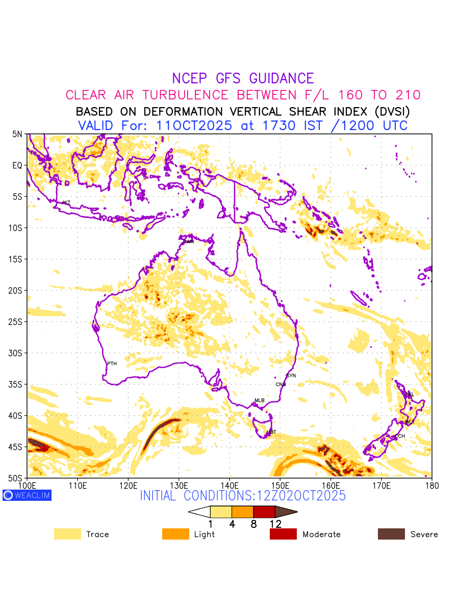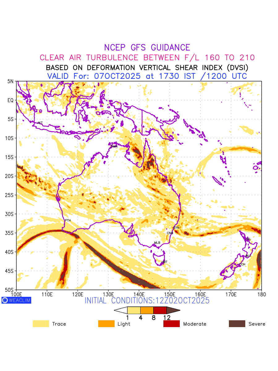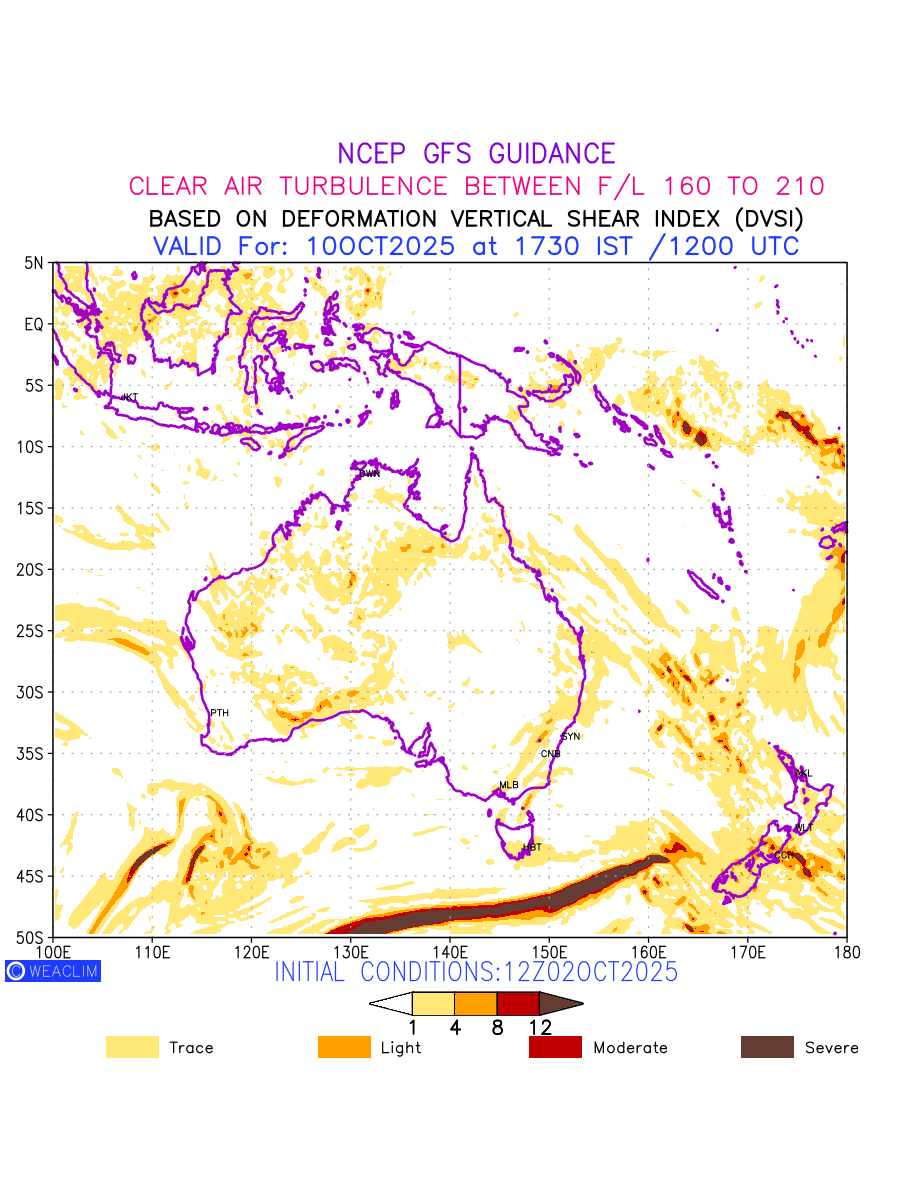 Clear Air Turbulence (CAT) is sudden severe turbulence occurring in cloudless regions that causes violent buffeting of aircraft. CAT is commonly applied to higher altitude turbulence associated with wind shear. It is caused by patches of air swirling chaotically within the world’s jet streams—strong air currents that circle the globe from west to east and that we see on weather maps as wide, wavy lines that bend around low- and high-pressure centre. It is prominent between 500hPa to 200hPa. Shown here are the CAT Conditions at 500hPa for the Australian Region for the next ten days.