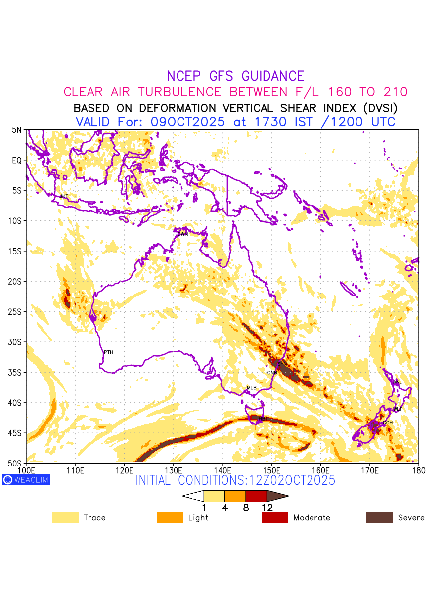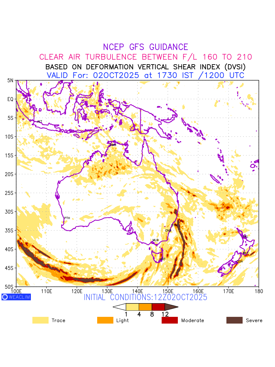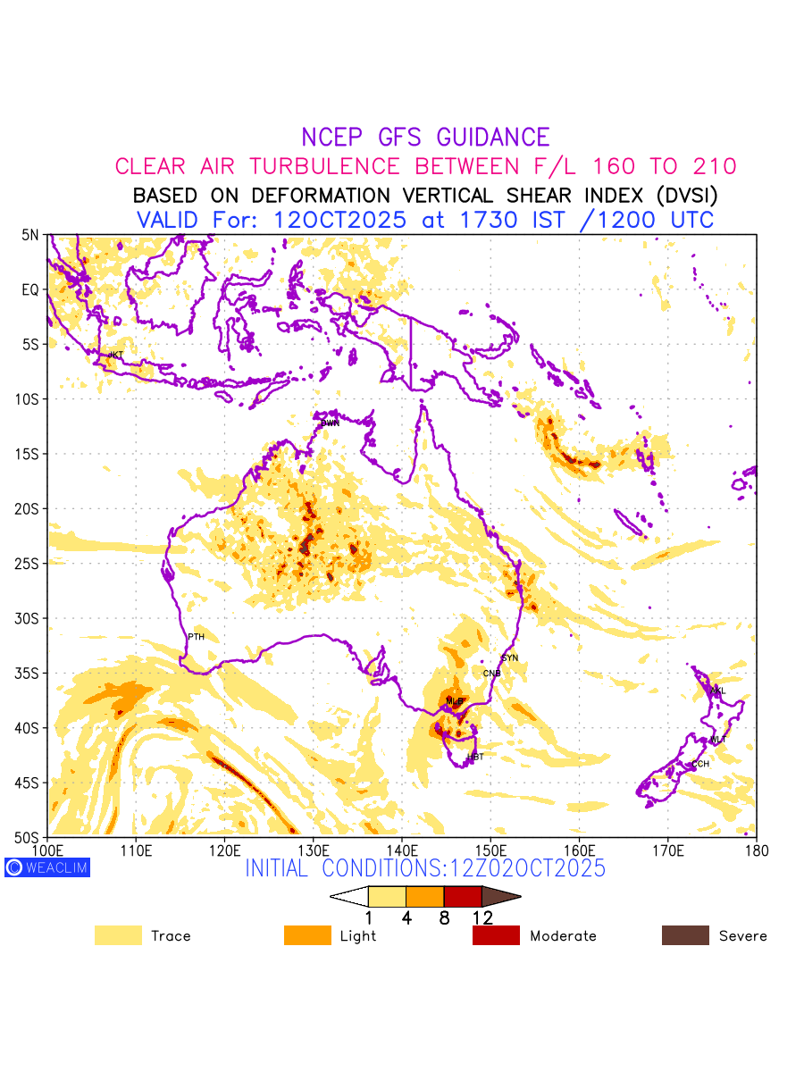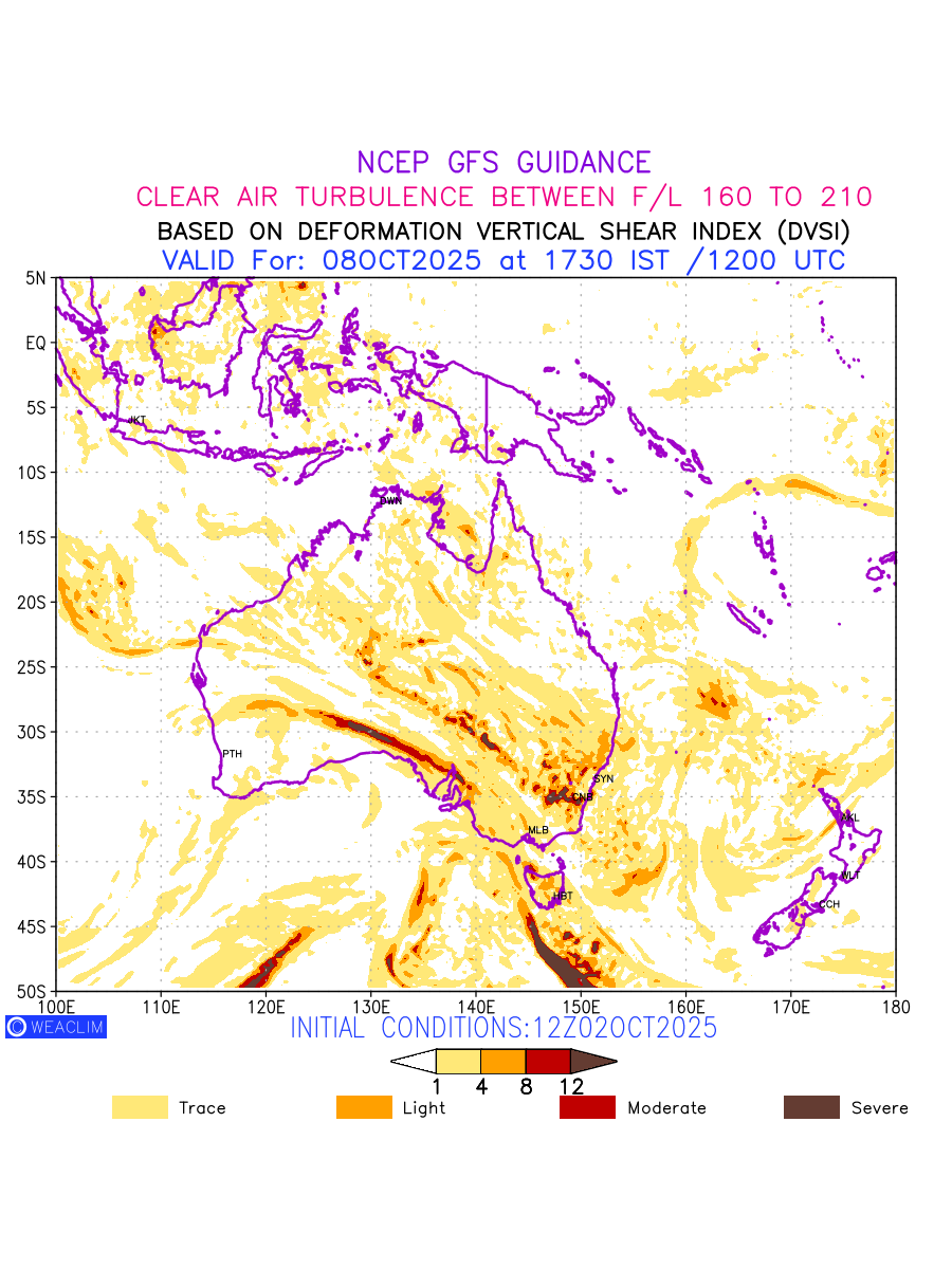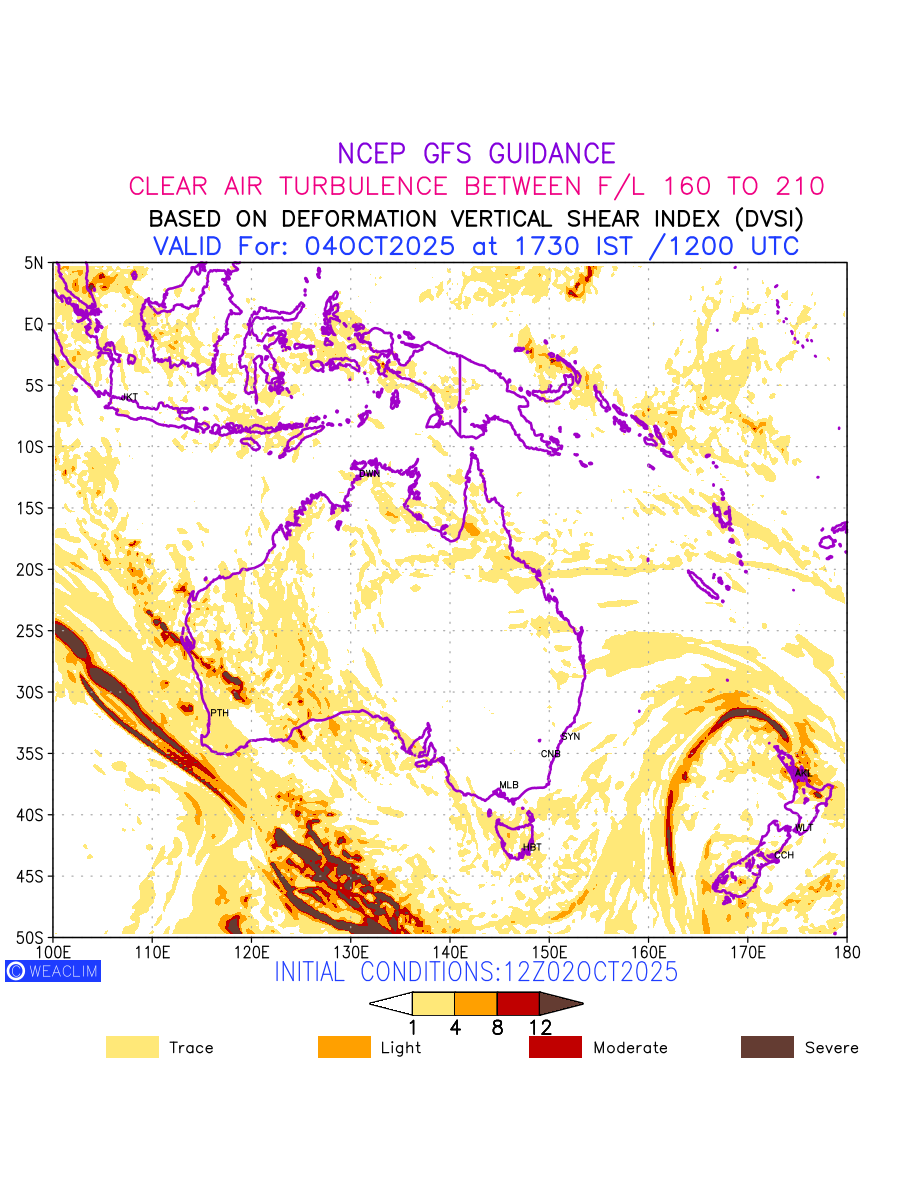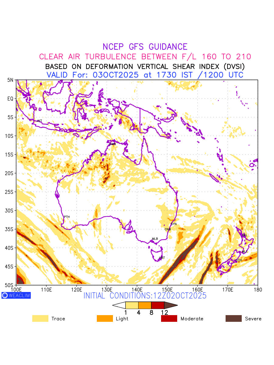 Clear Air Turbulence (CAT) is sudden severe turbulence occurring in cloudless regions that causes violent buffeting of aircraft. CAT is commonly applied to higher altitude turbulence associated with wind shear. It is caused by patches of air swirling chaotically within the world’s jet streams—strong air currents that circle the globe from west to east and that we see on weather maps as wide, wavy lines that bend around low- and high-pressure centre. It is prominent between 500hPa to 200hPa. Shown here are the CAT Conditions at 500hPa for the Australian Region for the next ten days.