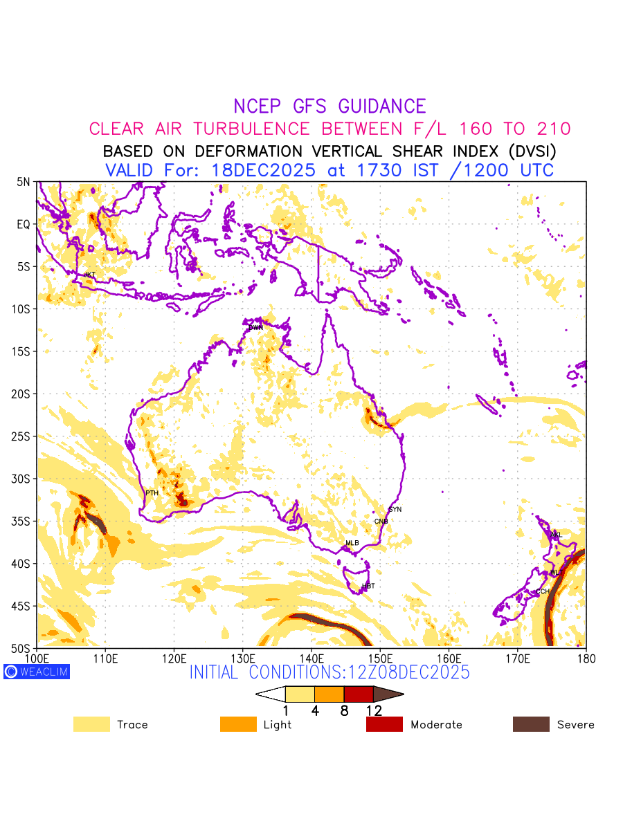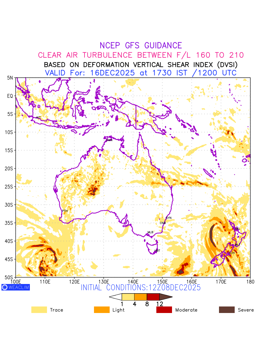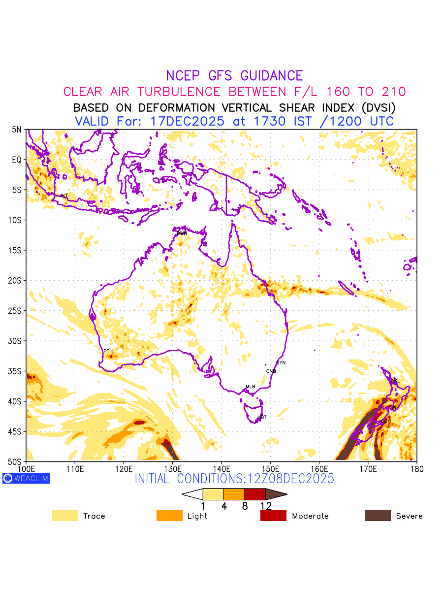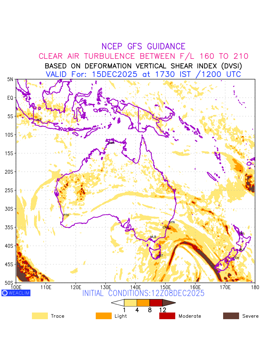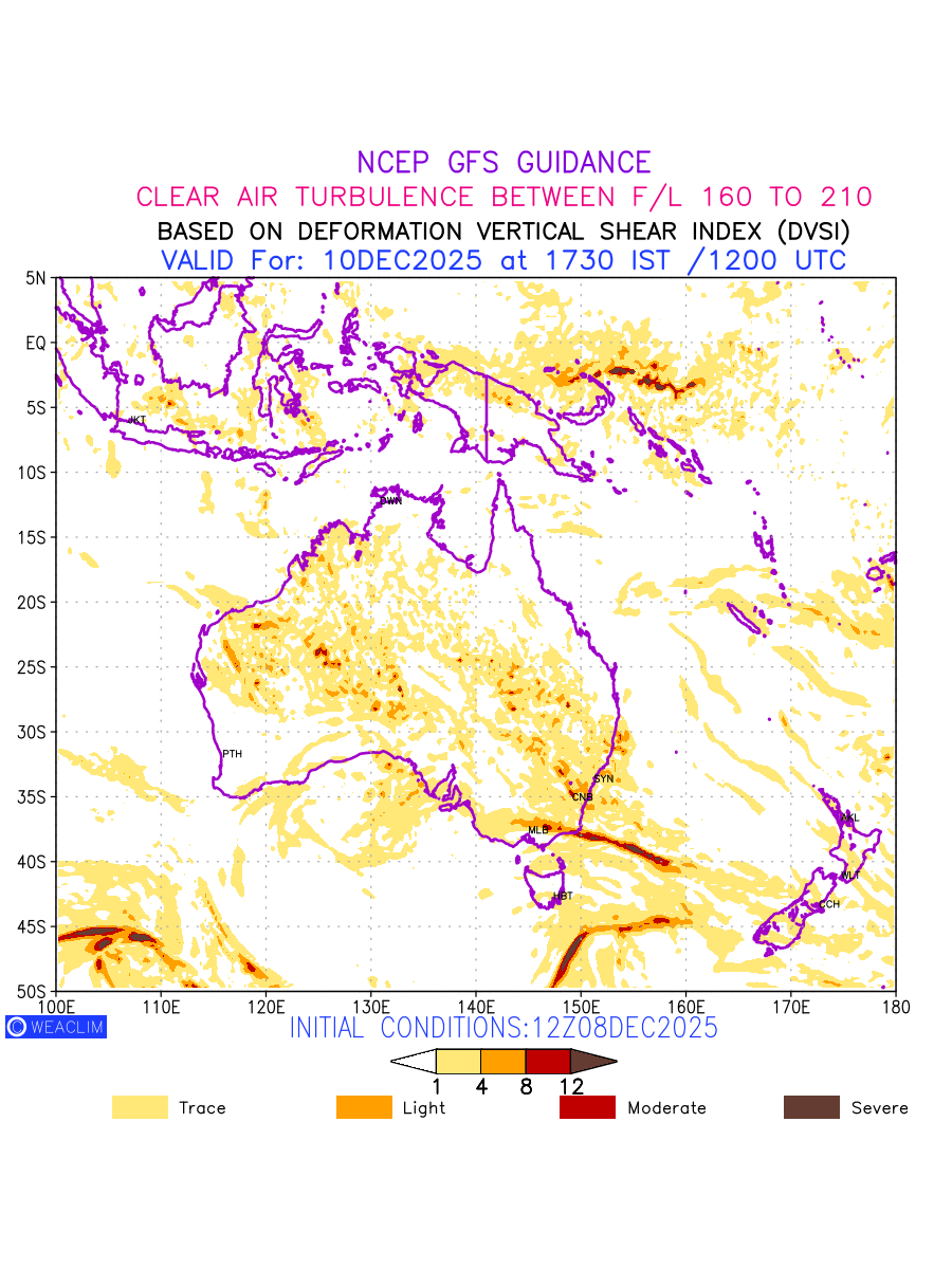 Clear Air Turbulence (CAT) is sudden severe turbulence occurring in cloudless regions that causes violent buffeting of aircraft. CAT is commonly applied to higher altitude turbulence associated with wind shear. It is caused by patches of air swirling chaotically within the world’s jet streams—strong air currents that circle the globe from west to east and that we see on weather maps as wide, wavy lines that bend around low- and high-pressure centre. It is prominent between 500hPa to 200hPa. Shown here are the CAT Conditions at 500hPa for the Australian Region for the next ten days.