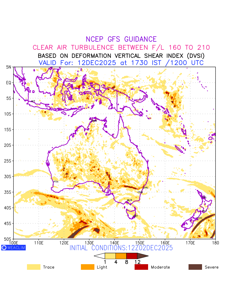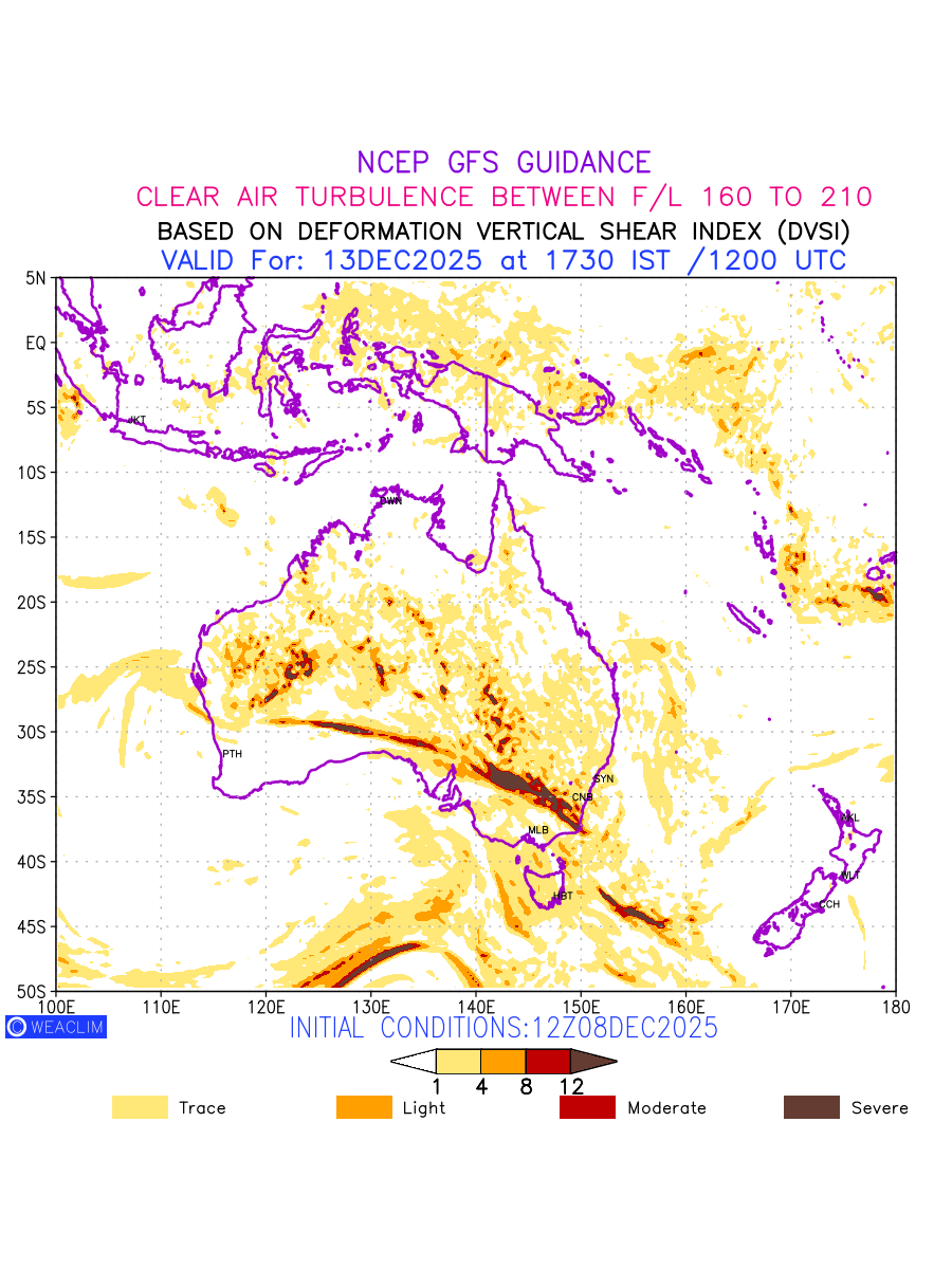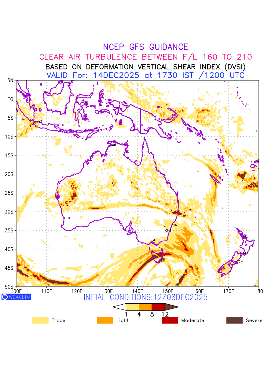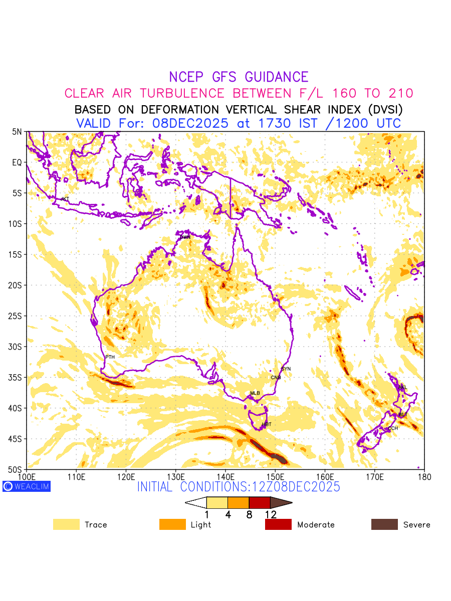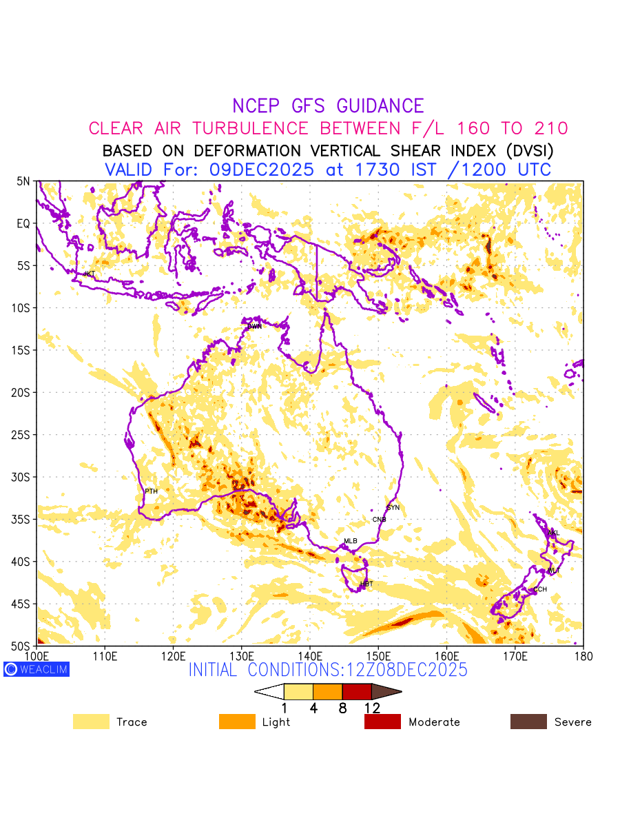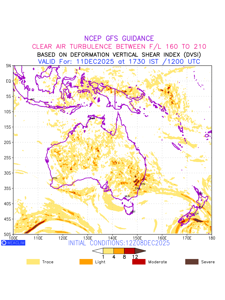 Clear Air Turbulence (CAT) is sudden severe turbulence occurring in cloudless regions that causes violent buffeting of aircraft. CAT is commonly applied to higher altitude turbulence associated with wind shear. It is caused by patches of air swirling chaotically within the world’s jet streams—strong air currents that circle the globe from west to east and that we see on weather maps as wide, wavy lines that bend around low- and high-pressure centre. It is prominent between 500hPa to 200hPa. Shown here are the CAT Conditions at 500hPa for the Australian Region for the next ten days.