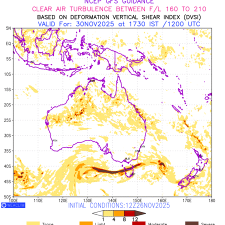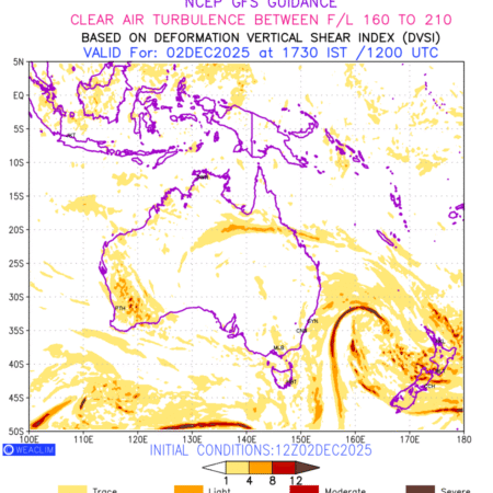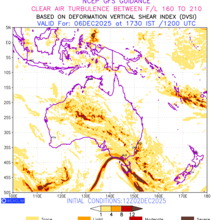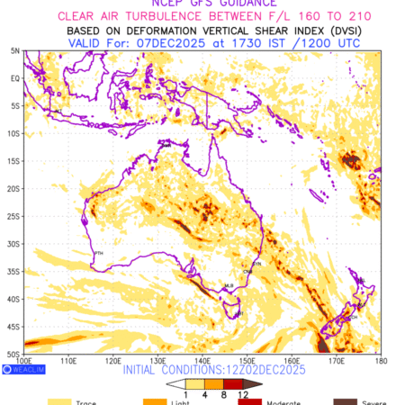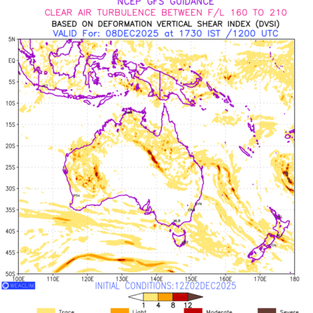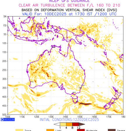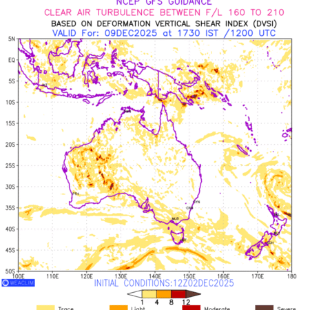 Clear Air Turbulence (CAT) is sudden severe turbulence occurring in cloudless regions that causes violent buffeting of aircraft. CAT is commonly applied to higher altitude turbulence associated with wind shear. It is caused by patches of air swirling chaotically within the world’s jet streams—strong air currents that circle the globe from west to east and that we see on weather maps as wide, wavy lines that bend around low- and high-pressure centre. It is prominent between 500hPa to 200hPa. Shown here are the CAT Conditions at 500hPa for the Australian Region for the next ten days.