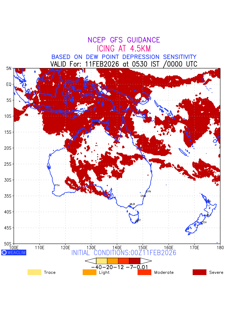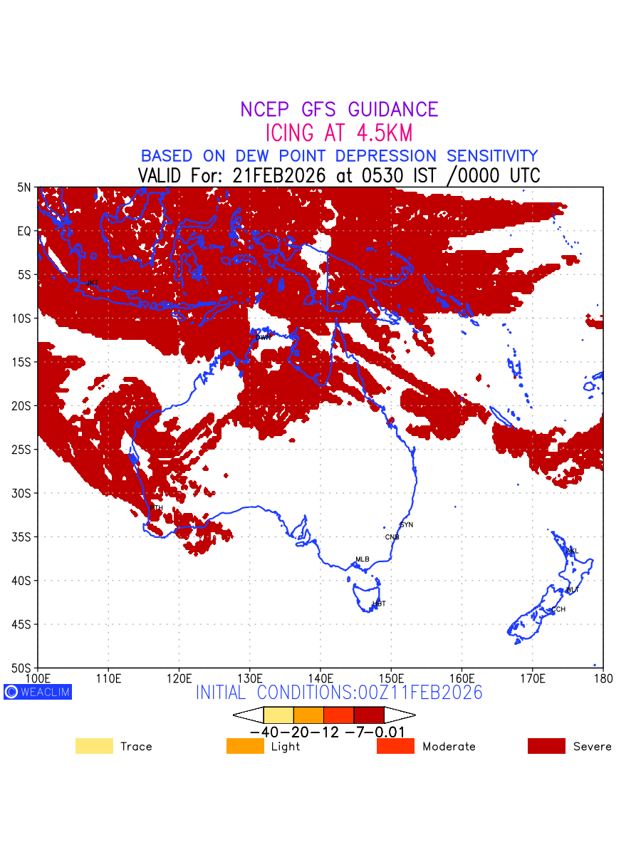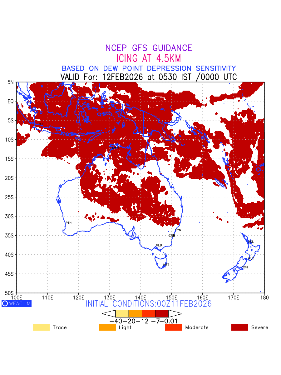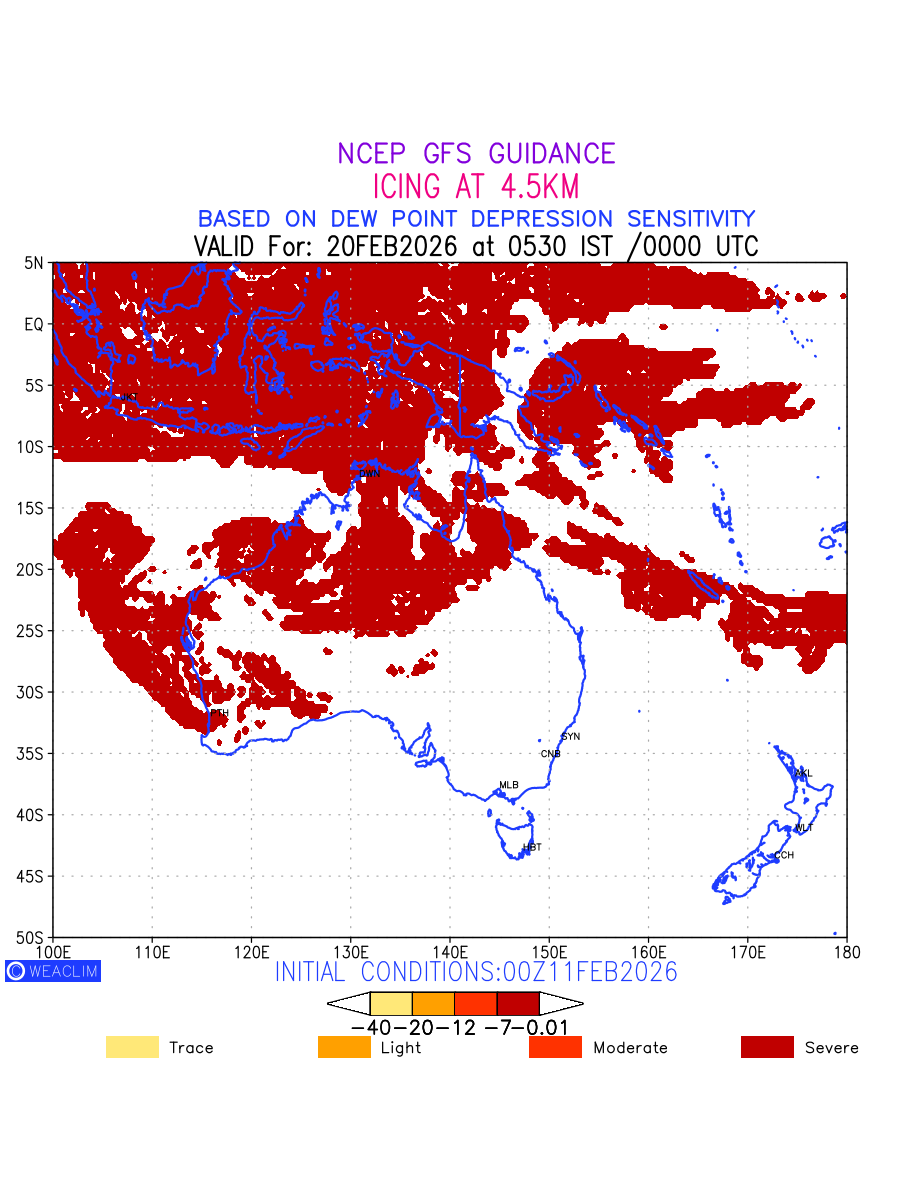 Known icing conditions exist when visible moisture or high relative humidity combines with temperatures near or below freezing. Icing conditions are only present in temperatures between 0ºC and -40ºC, with the highest risk occurring between 0ºC and -15ºC. The size and temperature of the supercooled water droplets that impact on the aircraft determine the category of ice that is formed. Icing is prominent between 600hPa to 700hPa level. Shown here is the icing condition at 600hPa level for the Australian Region for the next ten days.