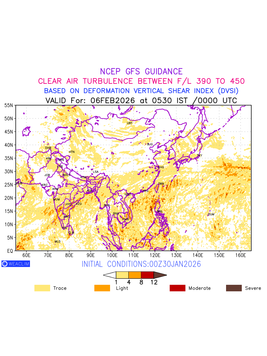 Clear Air Turbulence (CAT) is sudden severe turbulence occurring in cloudless regions that causes violent buffeting of aircraft. CAT is commonly applied to higher altitude turbulence associated with wind shear. It is caused by patches of air swirling chaotically within the world’s jet streams—strong air currents that circle the globe from west to east and that we see on weather maps as wide, wavy lines that bend around low- and high-pressure centre. It is prominent between 500hPa to 200hPa. Shown here are the CAT Conditions at 200hPa for the East Asian Region for the next ten days.