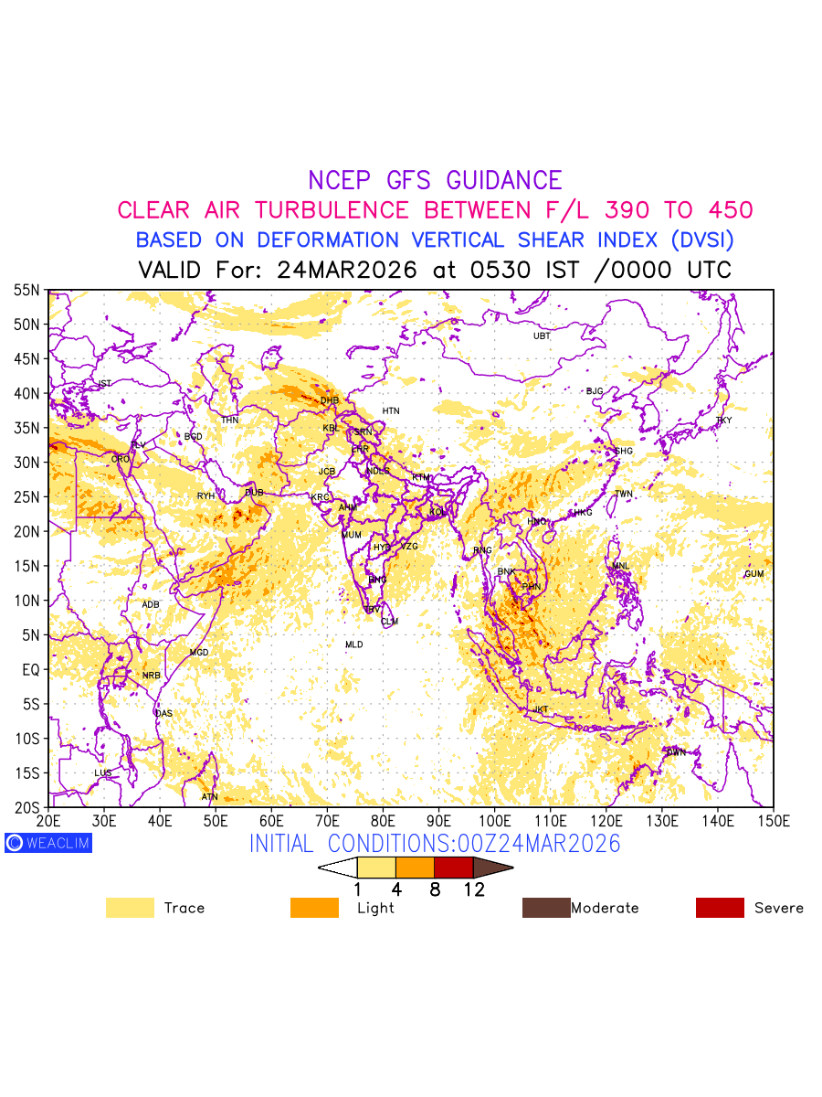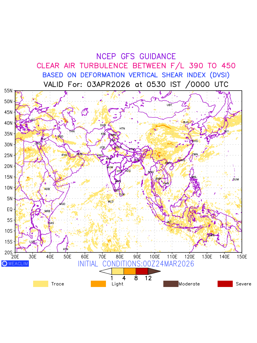 Clear Air Turbulence (CAT) is sudden severe turbulence occurring in cloudless regions that causes violent buffeting of aircraft. CAT is commonly applied to higher altitude turbulence associated with wind shear. It is caused by patches of air swirling chaotically within the world’s jet streams—strong air currents that circle the globe from west to east and that we see on weather maps as wide, wavy lines that bend around low- and high-pressure centre. It is prominent between 500hPa to 200hPa. Shown here are the CAT Conditions at 200hPa for the Eurasian Region for the next ten days.