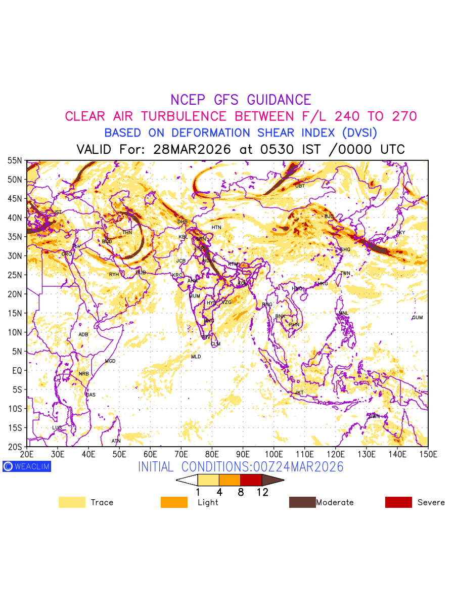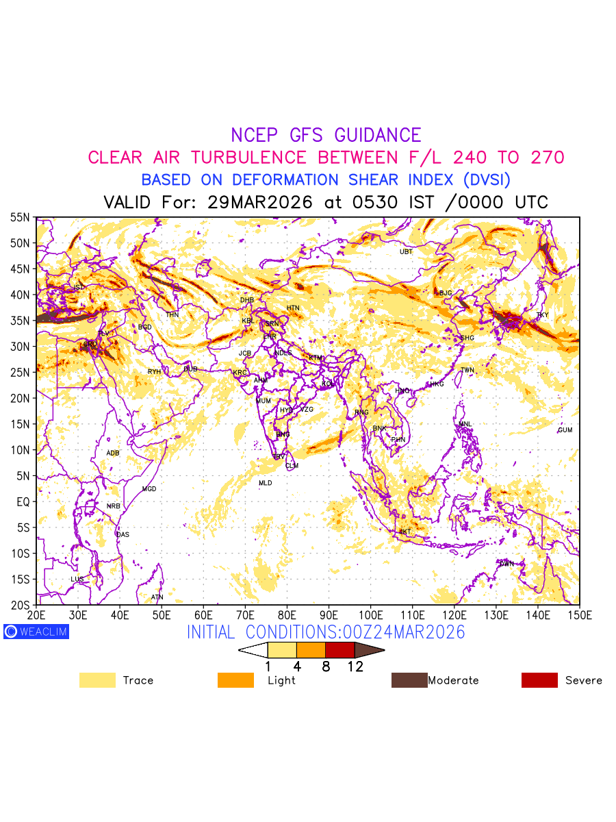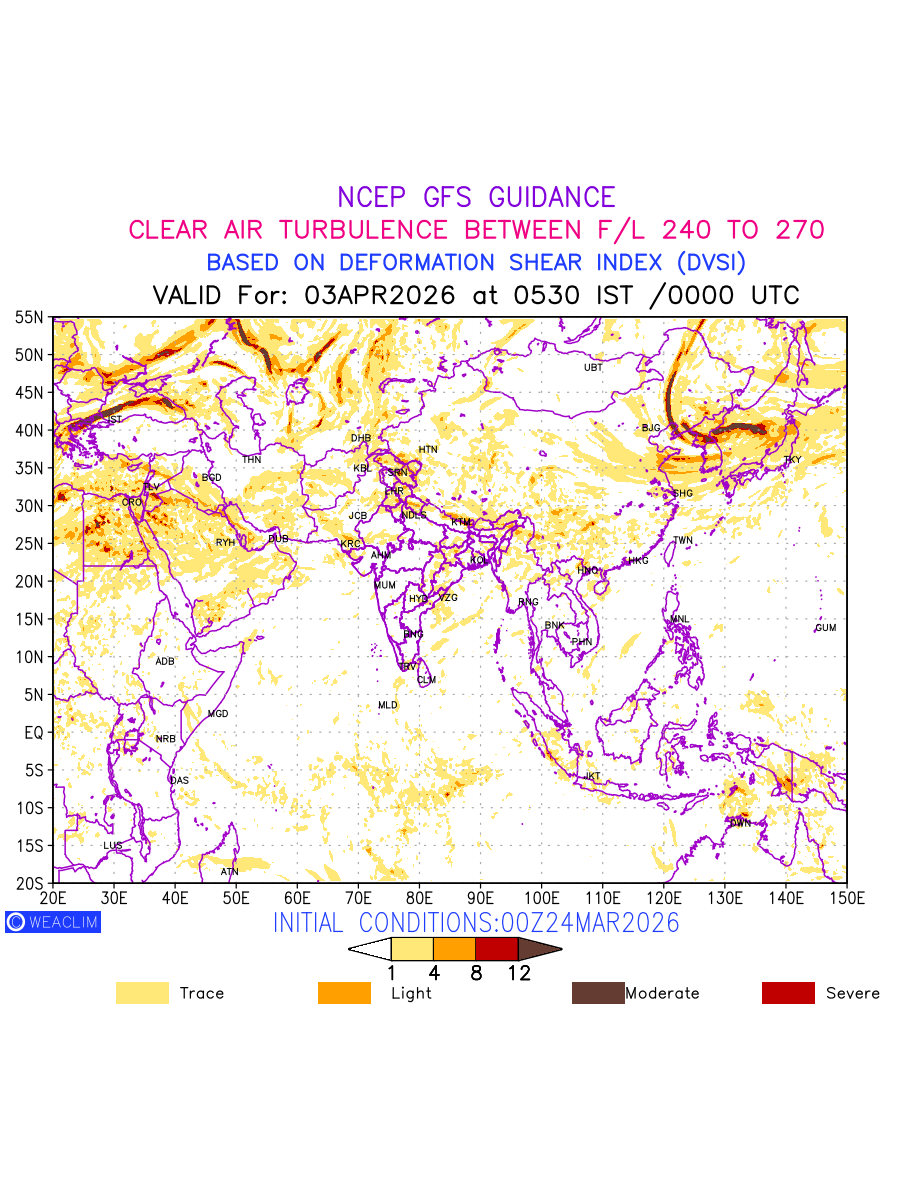 Clear Air Turbulence (CAT) is sudden severe turbulence occurring in cloudless regions that causes violent buffeting of aircraft. CAT is commonly applied to higher altitude turbulence associated with wind shear. It is caused by patches of air swirling chaotically within the world’s jet streams—strong air currents that circle the globe from west to east and that we see on weather maps as wide, wavy lines that bend around low- and high-pressure centre. It is prominent between 500hPa to 200hPa. Shown here are the CAT Conditions at 400hPa for the Eurasian Region for the next ten days.