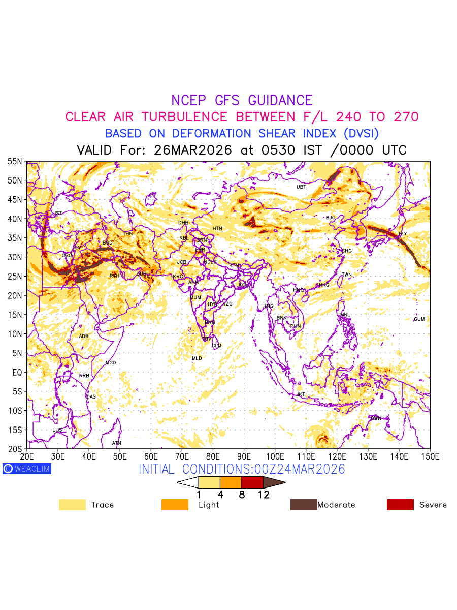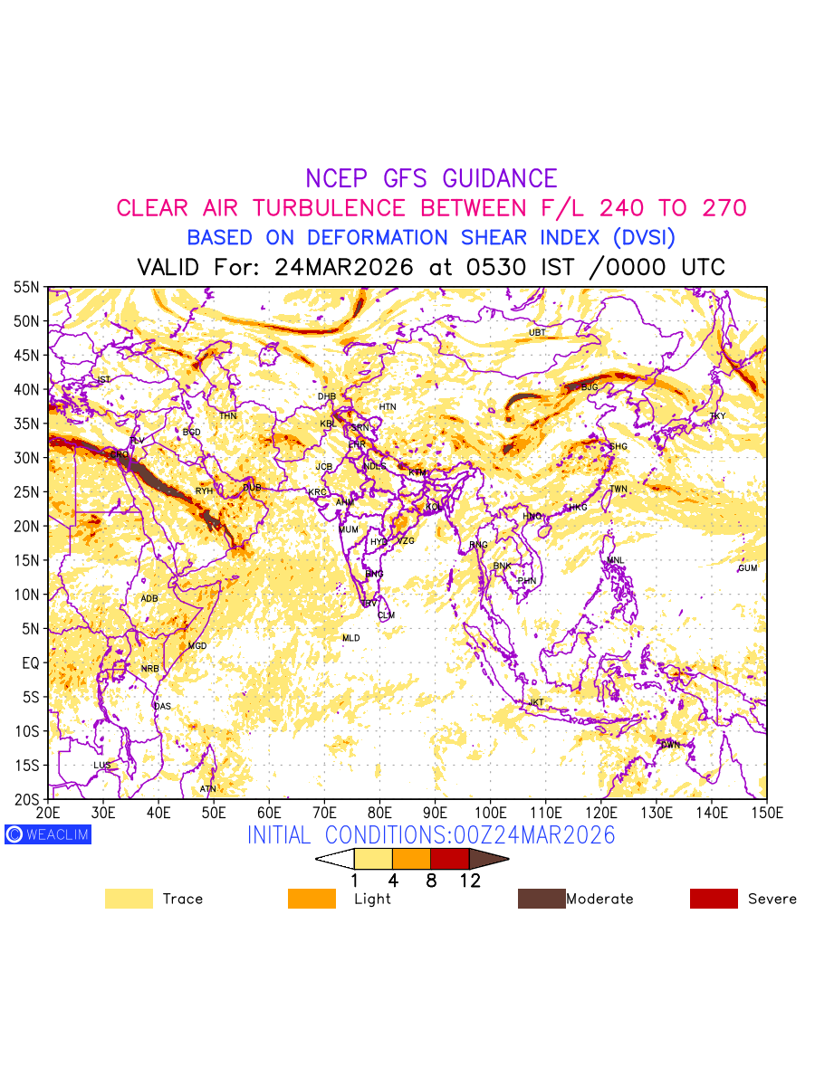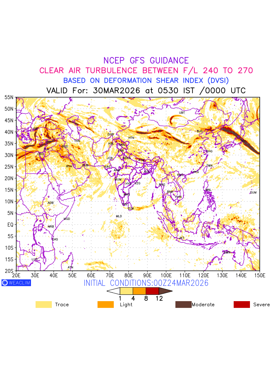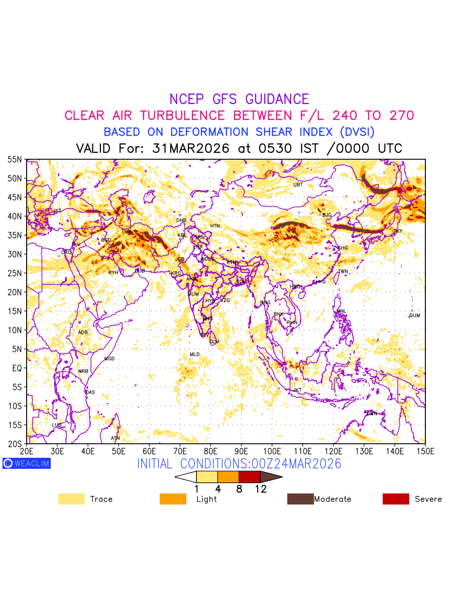 Clear Air Turbulence (CAT) is sudden severe turbulence occurring in cloudless regions that causes violent buffeting of aircraft. CAT is commonly applied to higher altitude turbulence associated with wind shear. It is caused by patches of air swirling chaotically within the world’s jet streams—strong air currents that circle the globe from west to east and that we see on weather maps as wide, wavy lines that bend around low- and high-pressure centre. It is prominent between 500hPa to 200hPa. Shown here are the CAT Conditions at 400hPa for the Eurasian Region for the next ten days.