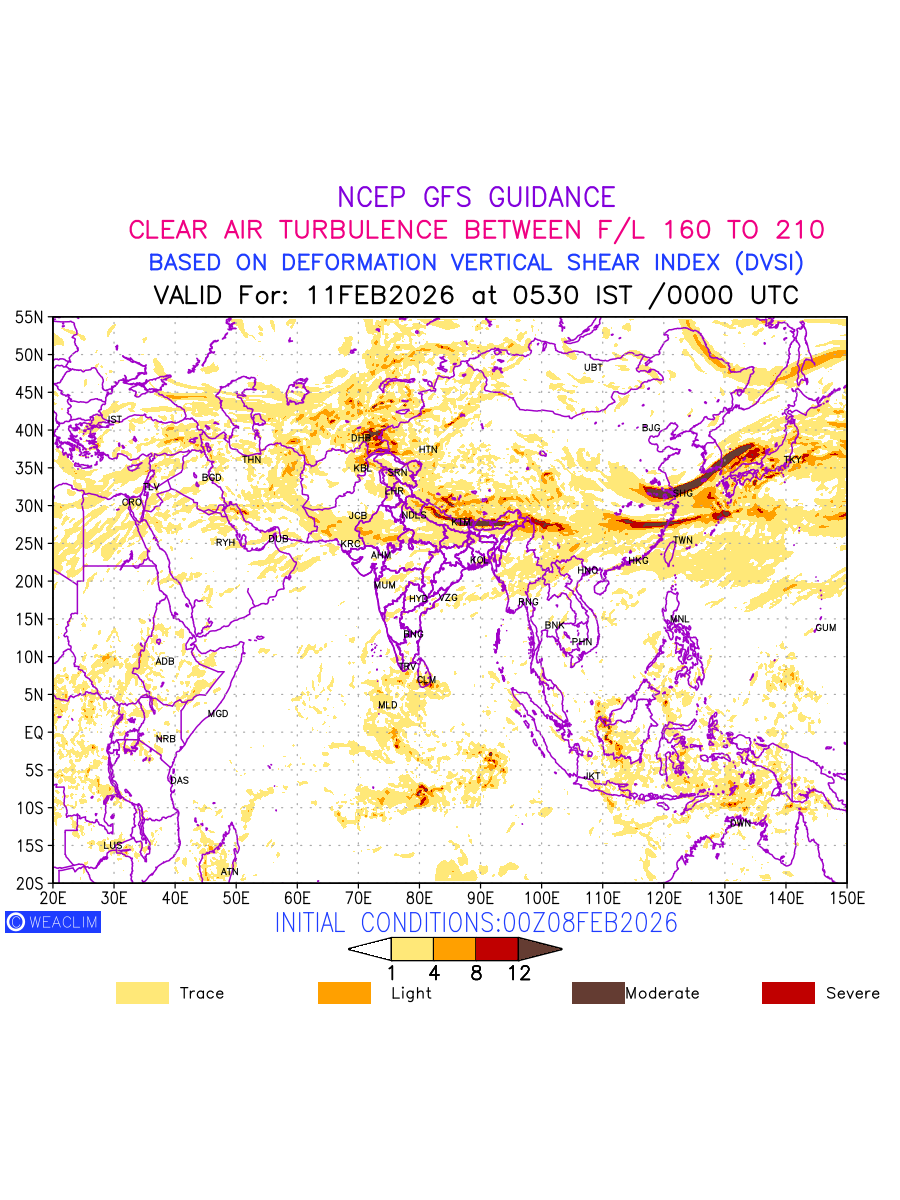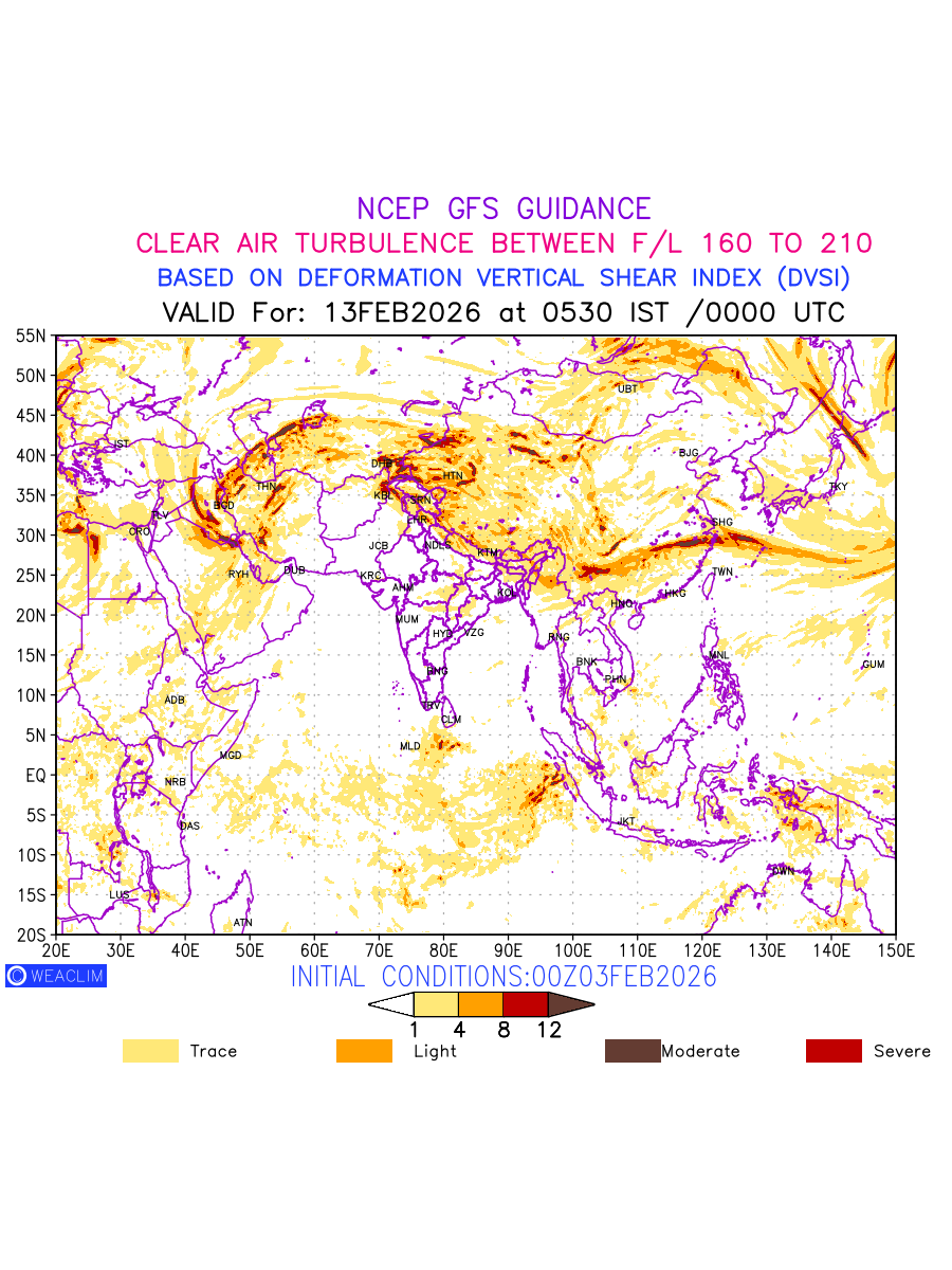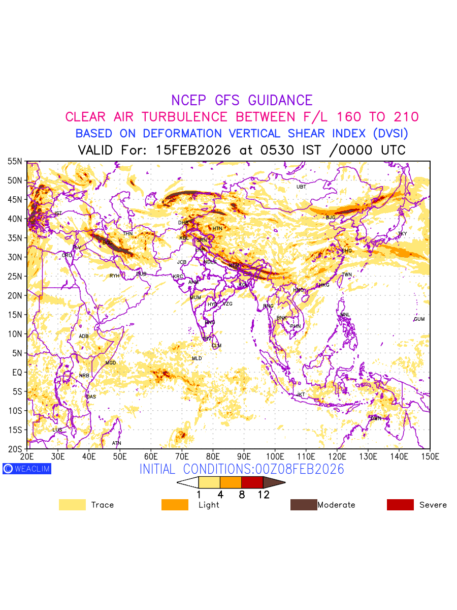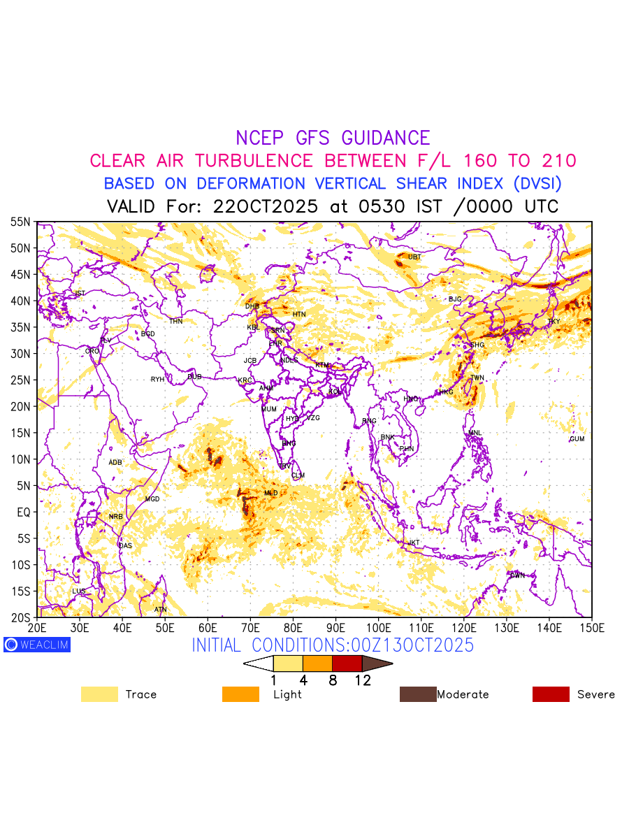 Clear Air Turbulence (CAT) is sudden severe turbulence occurring in cloudless regions that causes violent buffeting of aircraft. CAT is commonly applied to higher altitude turbulence associated with wind shear. It is caused by patches of air swirling chaotically within the world’s jet streams—strong air currents that circle the globe from west to east and that we see on weather maps as wide, wavy lines that bend around low- and high-pressure centre. It is prominent between 500hPa to 200hPa. Shown here are the CAT Conditions at 500hPa for the Eurasian Region for the next ten days.