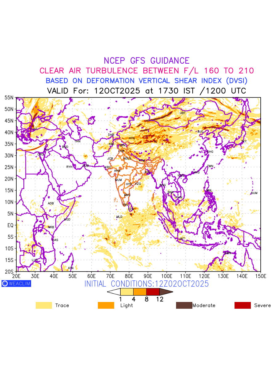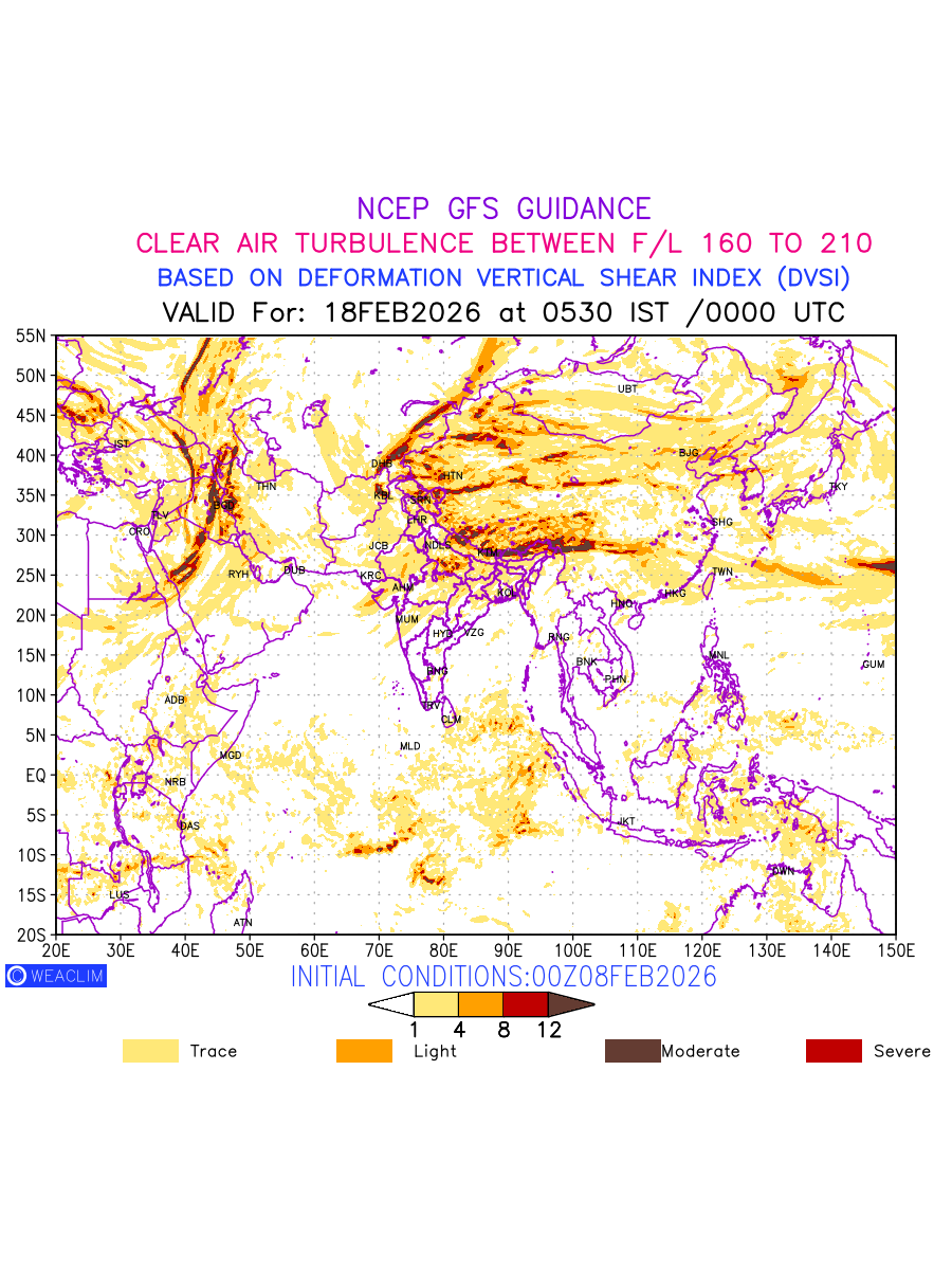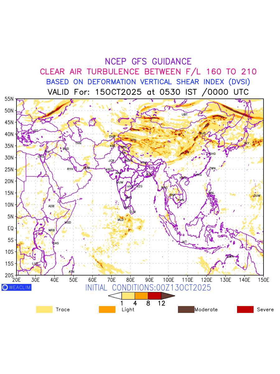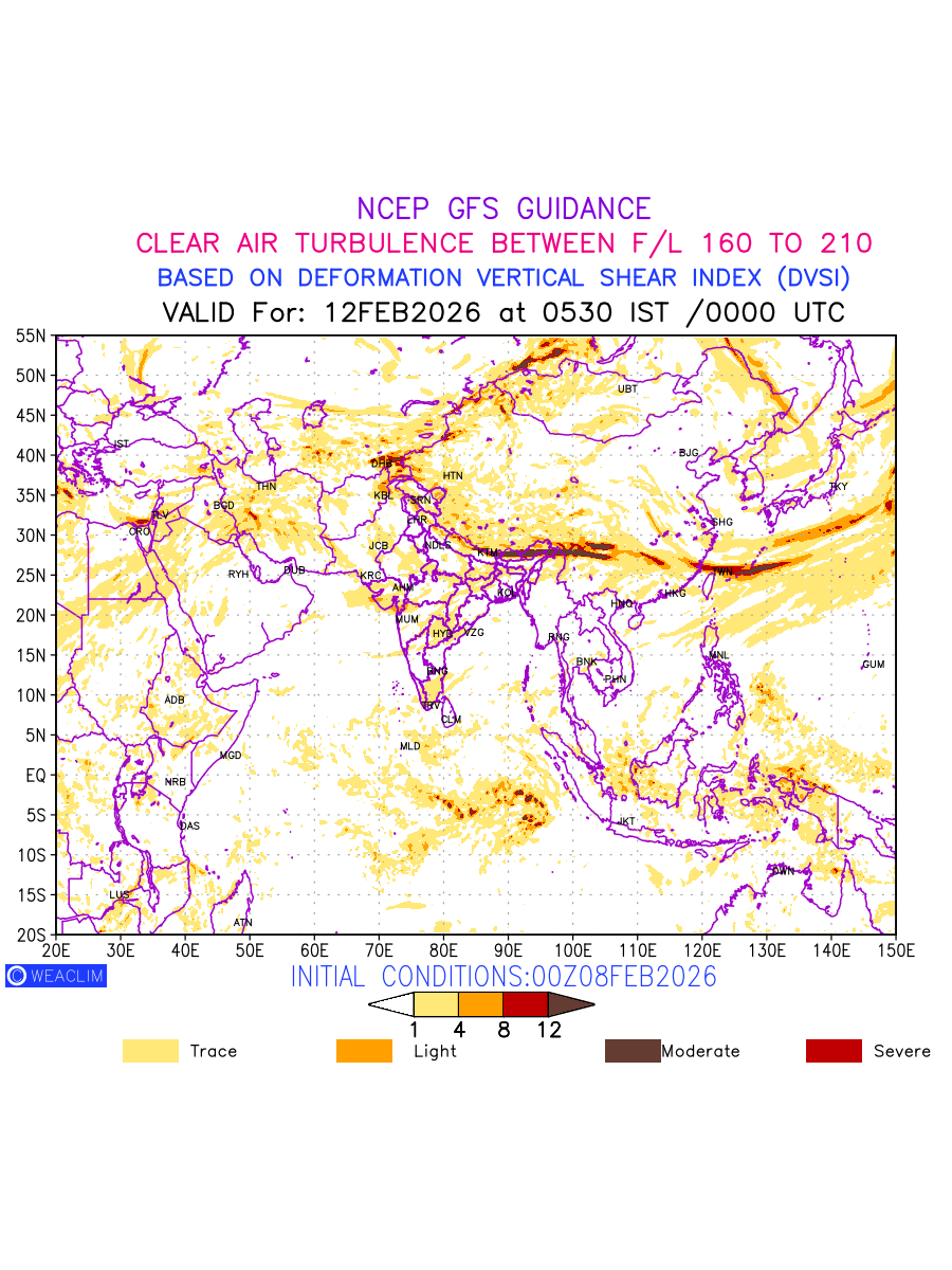 Clear Air Turbulence (CAT) is sudden severe turbulence occurring in cloudless regions that causes violent buffeting of aircraft. CAT is commonly applied to higher altitude turbulence associated with wind shear. It is caused by patches of air swirling chaotically within the world’s jet streams—strong air currents that circle the globe from west to east and that we see on weather maps as wide, wavy lines that bend around low- and high-pressure centre. It is prominent between 500hPa to 200hPa. Shown here are the CAT Conditions at 500hPa for the Eurasian Region for the next ten days.