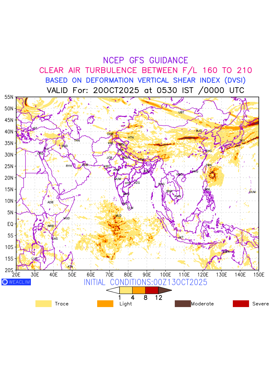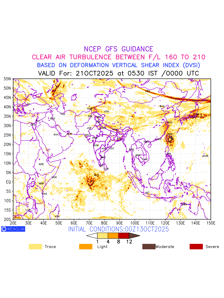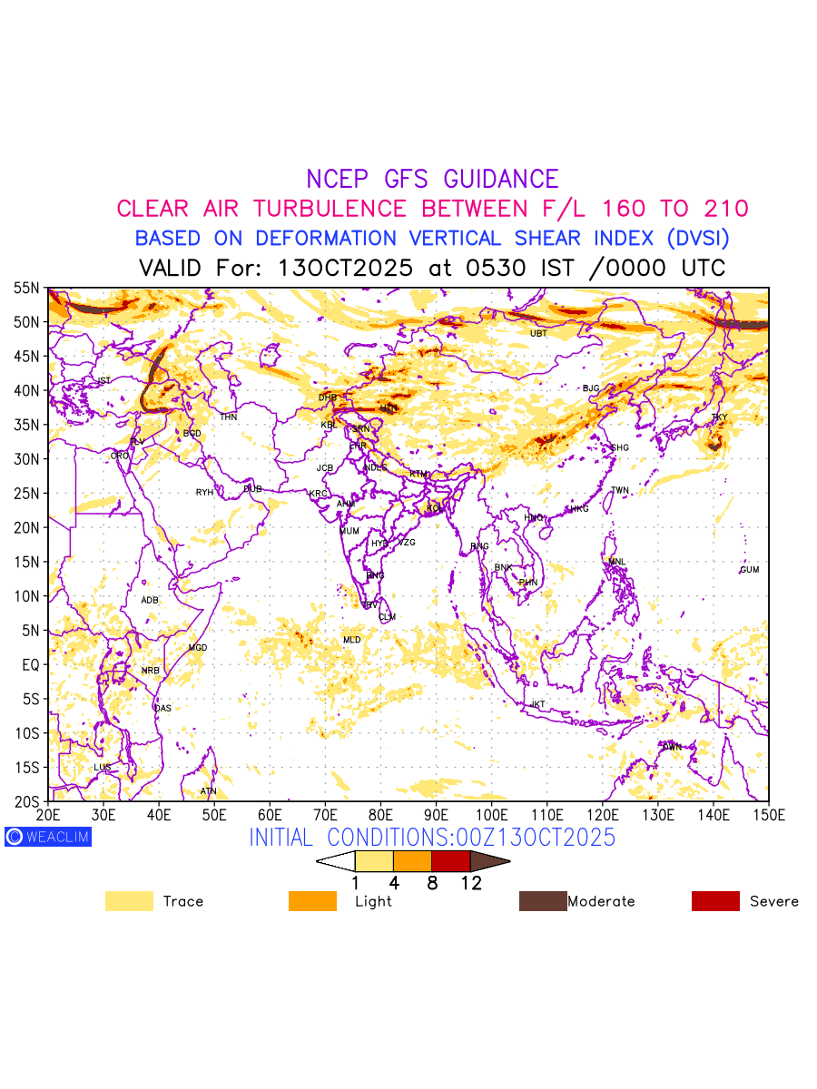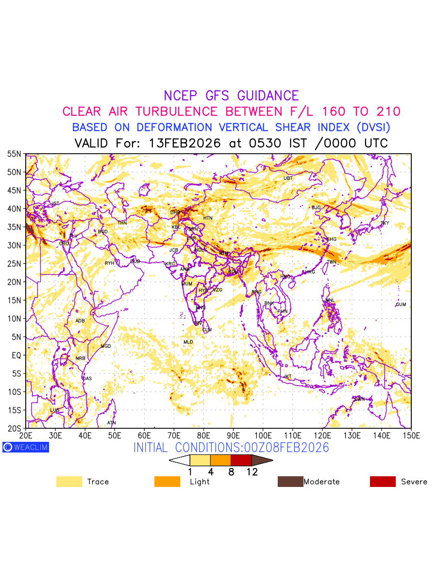 Clear Air Turbulence (CAT) is sudden severe turbulence occurring in cloudless regions that causes violent buffeting of aircraft. CAT is commonly applied to higher altitude turbulence associated with wind shear. It is caused by patches of air swirling chaotically within the world’s jet streams—strong air currents that circle the globe from west to east and that we see on weather maps as wide, wavy lines that bend around low- and high-pressure centre. It is prominent between 500hPa to 200hPa. Shown here are the CAT Conditions at 500hPa for the Eurasian Region for the next ten days.