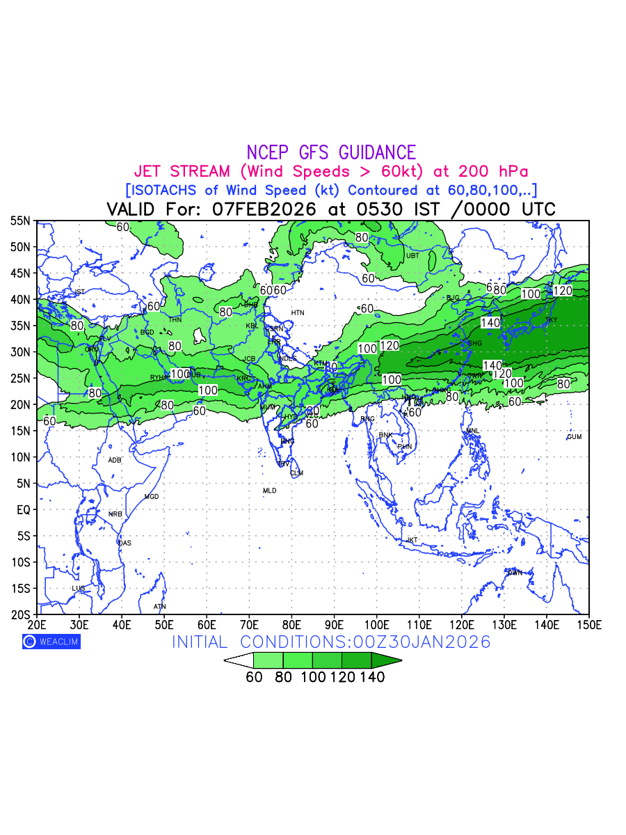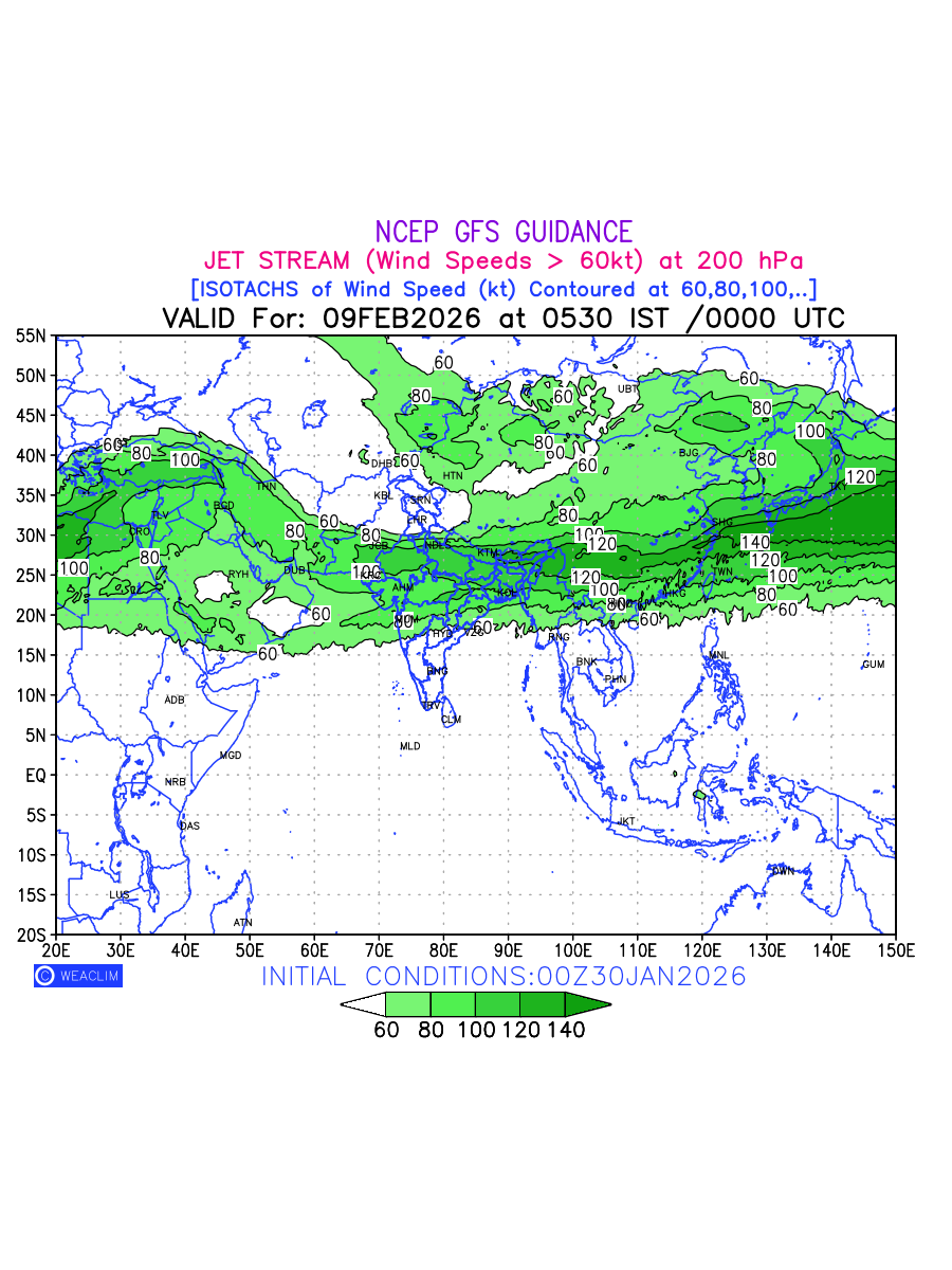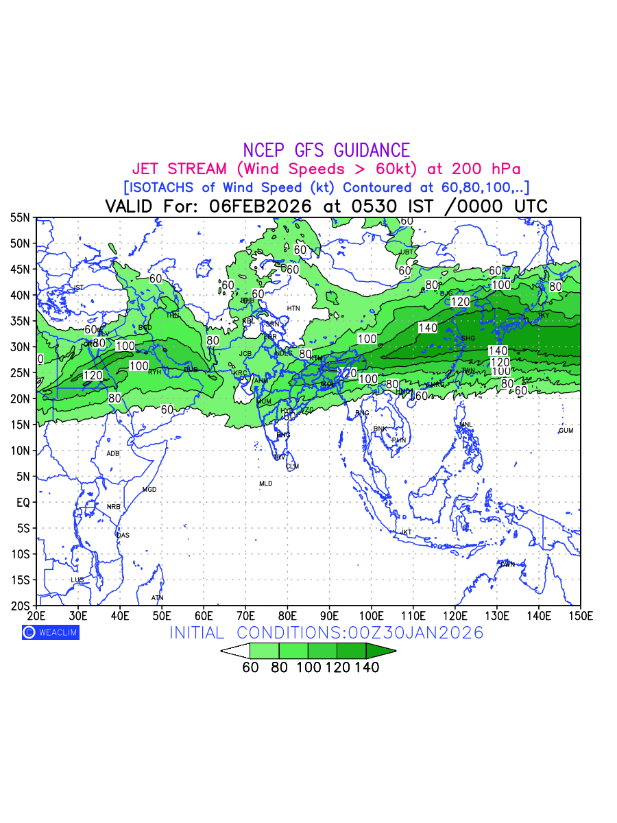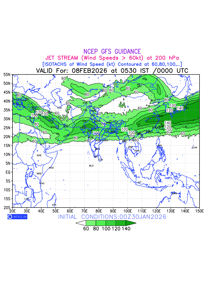 Three features that are significant for aviation are the Jet Stream in upper troposphere, Clear Air Turbulence (CAT) in upper troposphere and Icing in mid troposphere. Shown here is the Jet Stream at 200 hPa for the Eurasian Region for next ten days. Isotachs of winds speed of more than 60 kt are marked at 200 hPa to represent Jet Stream flow at 200 hPa for better appreciation.