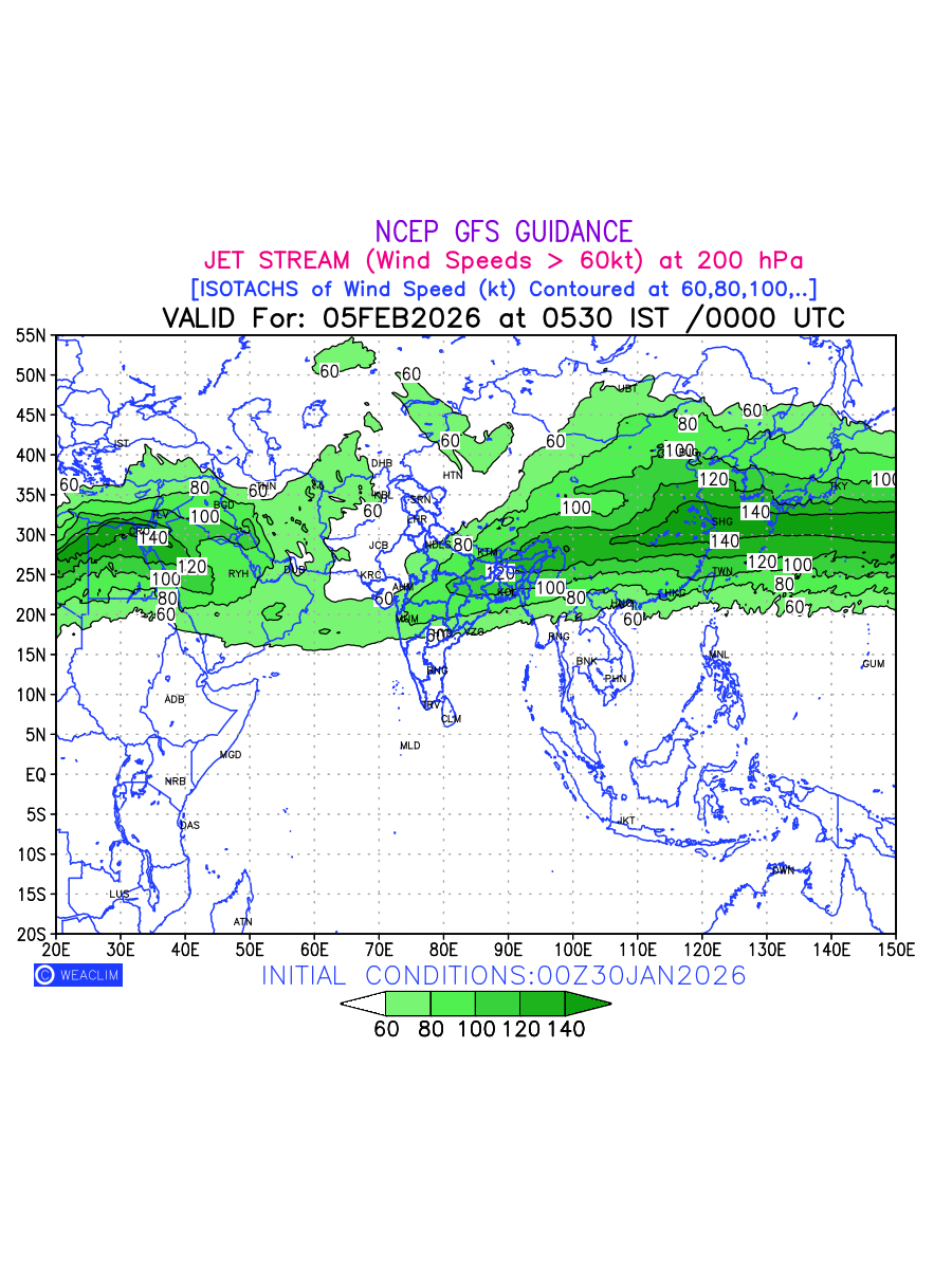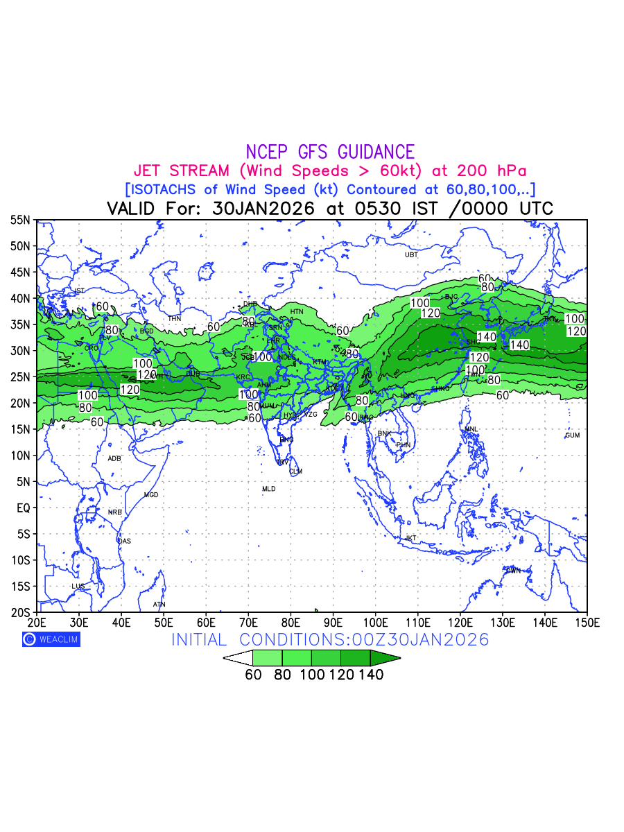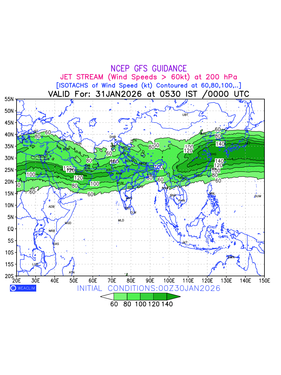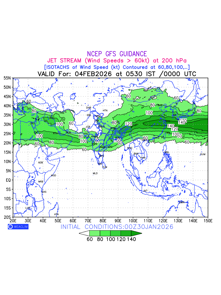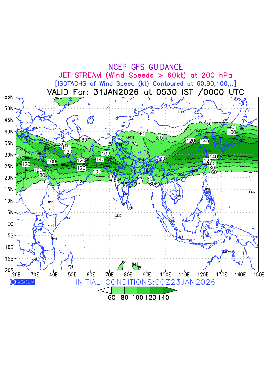 Three features that are significant for aviation are the Jet Stream in upper troposphere, Clear Air Turbulence (CAT) in upper troposphere and Icing in mid troposphere. Shown here is the Jet Stream at 200 hPa for the Eurasian Region for next ten days. Isotachs of winds speed of more than 60 kt are marked at 200 hPa to represent Jet Stream flow at 200 hPa for better appreciation.