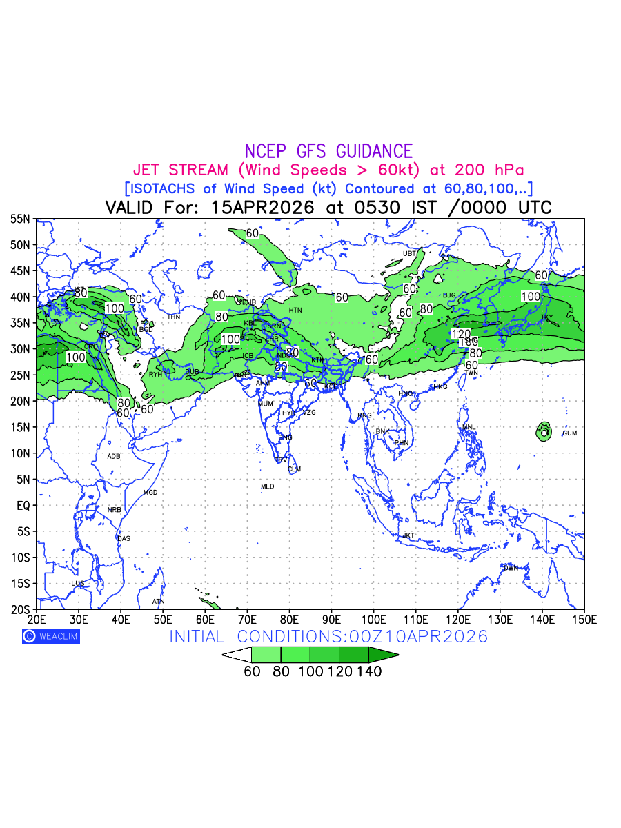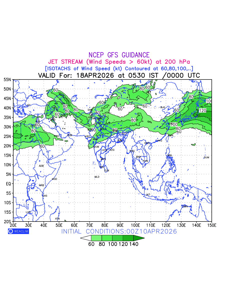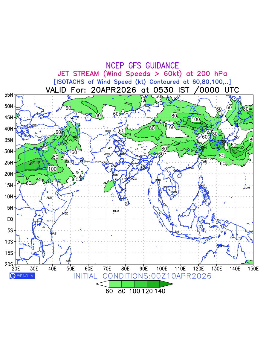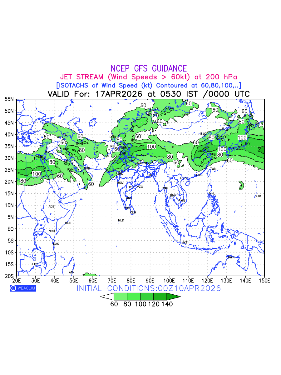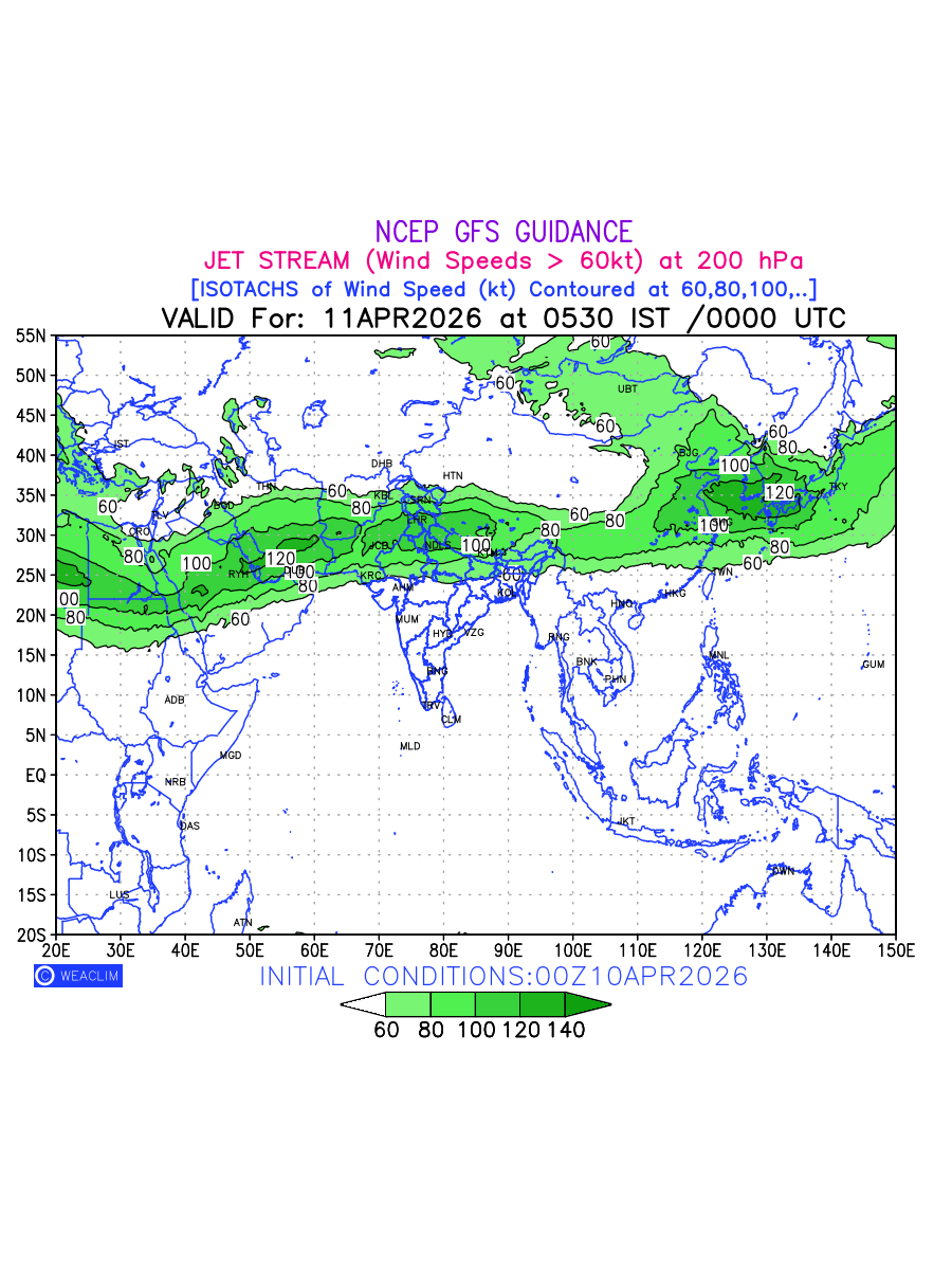 Three features that are significant for aviation are the Jet Stream in upper troposphere, Clear Air Turbulence (CAT) in upper troposphere and Icing in mid troposphere. Shown here is the Jet Stream at 200 hPa for the Eurasian Region for next ten days. Isotachs of winds speed of more than 60 kt are marked at 200 hPa to represent Jet Stream flow at 200 hPa for better appreciation.