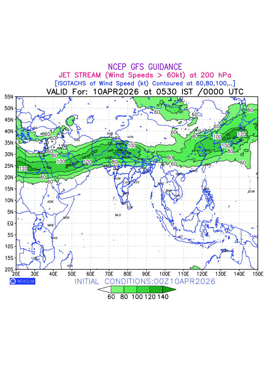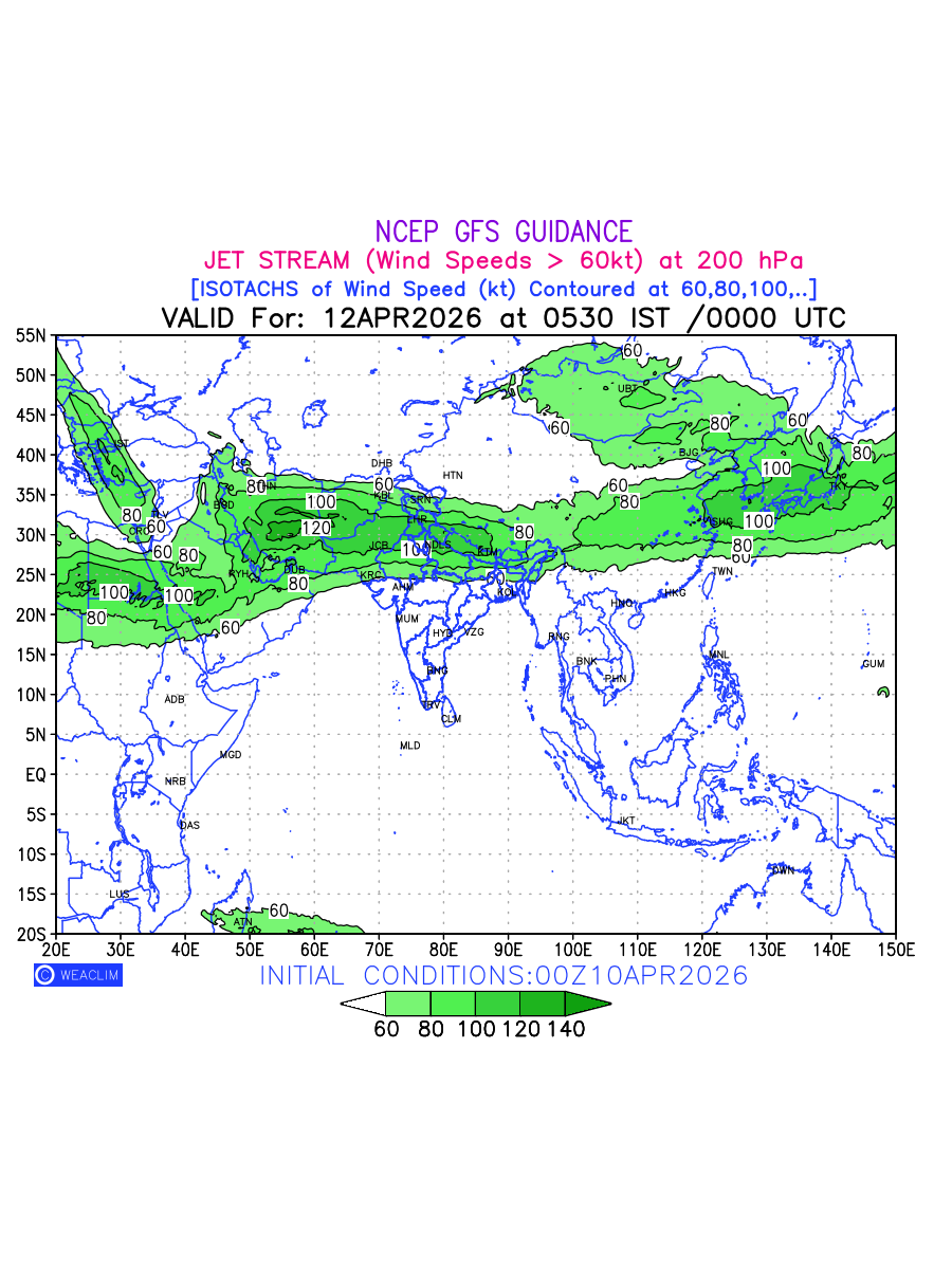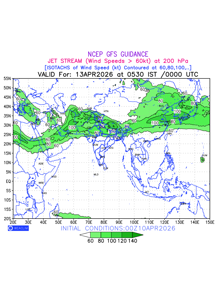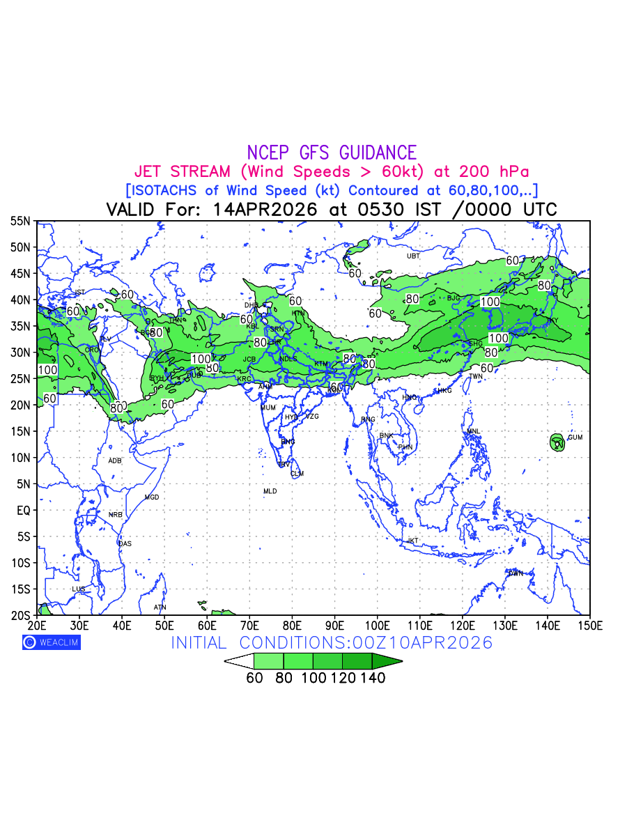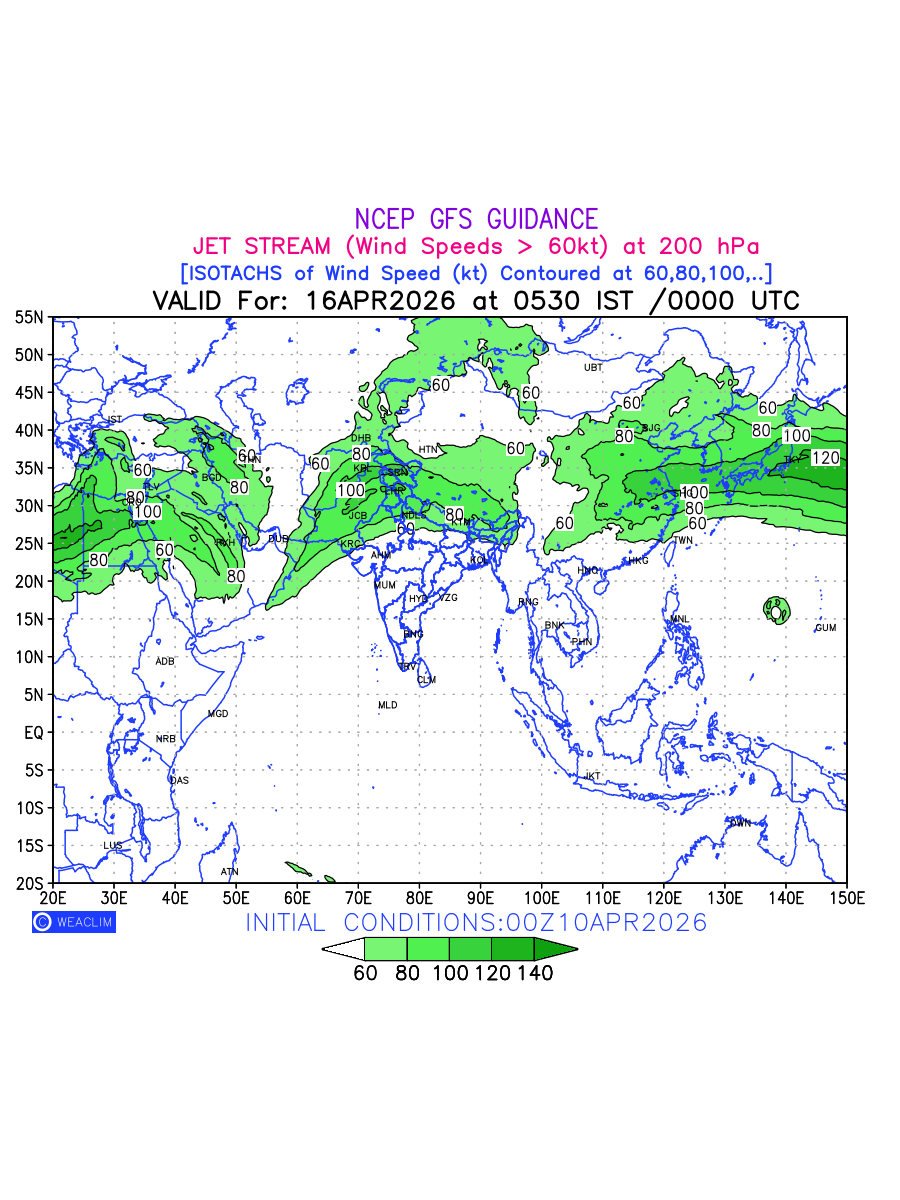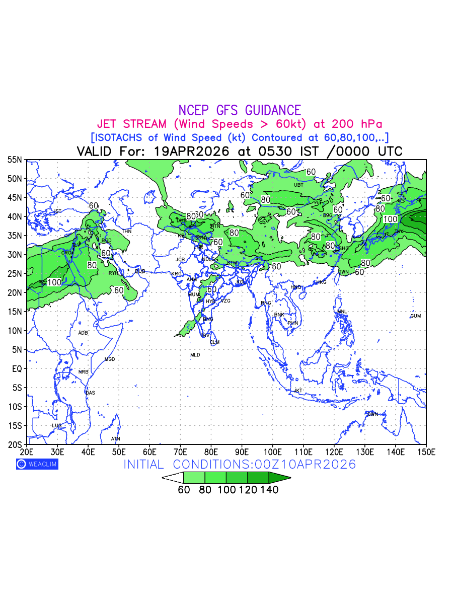 Three features that are significant for aviation are the Jet Stream in upper troposphere, Clear Air Turbulence (CAT) in upper troposphere and Icing in mid troposphere. Shown here is the Jet Stream at 200 hPa for the Eurasian Region for next ten days. Isotachs of winds speed of more than 60 kt are marked at 200 hPa to represent Jet Stream flow at 200 hPa for better appreciation.