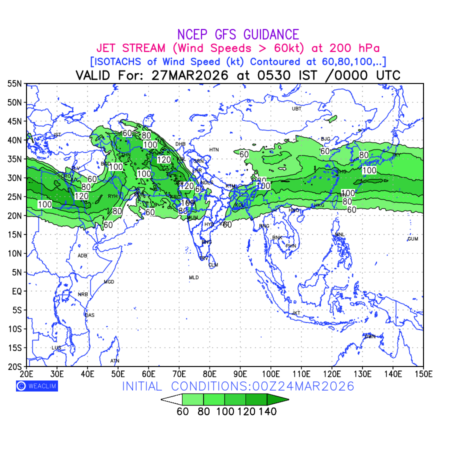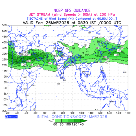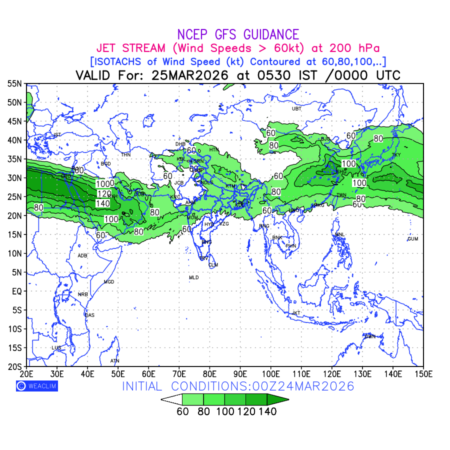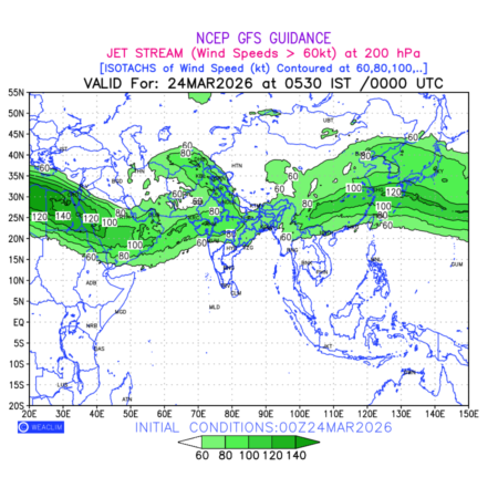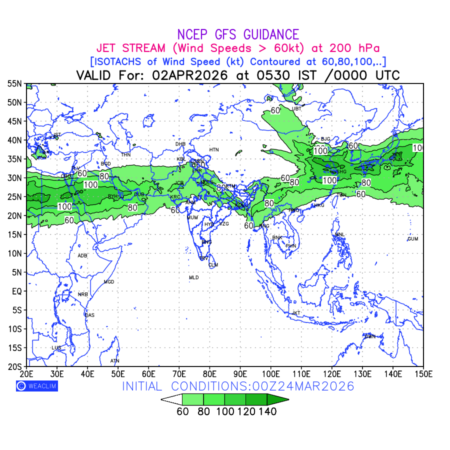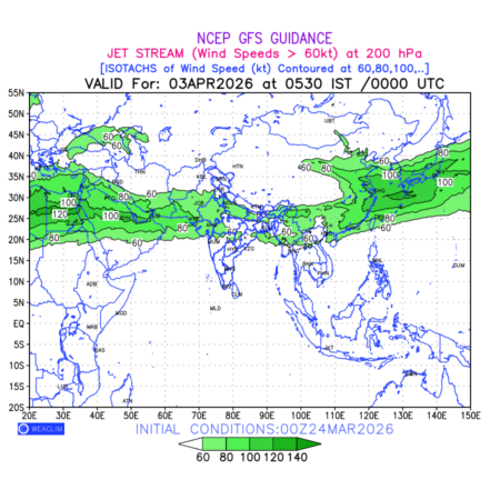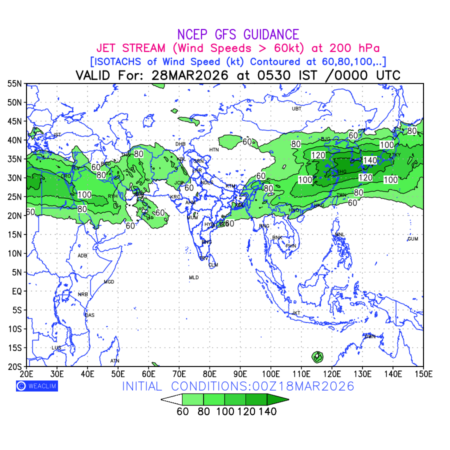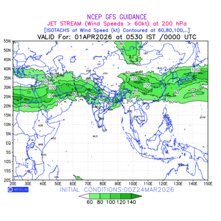Three features that are significant for aviation are the Jet Stream in upper troposphere, Clear Air Turbulence (CAT) in upper troposphere and Icing in mid troposphere. Shown here is the Jet Stream at 200 hPa for the Eurasian Region for next ten days. Isotachs of winds speed of more than 60 kt are marked at 200 hPa to represent Jet Stream flow at 200 hPa for better appreciation.