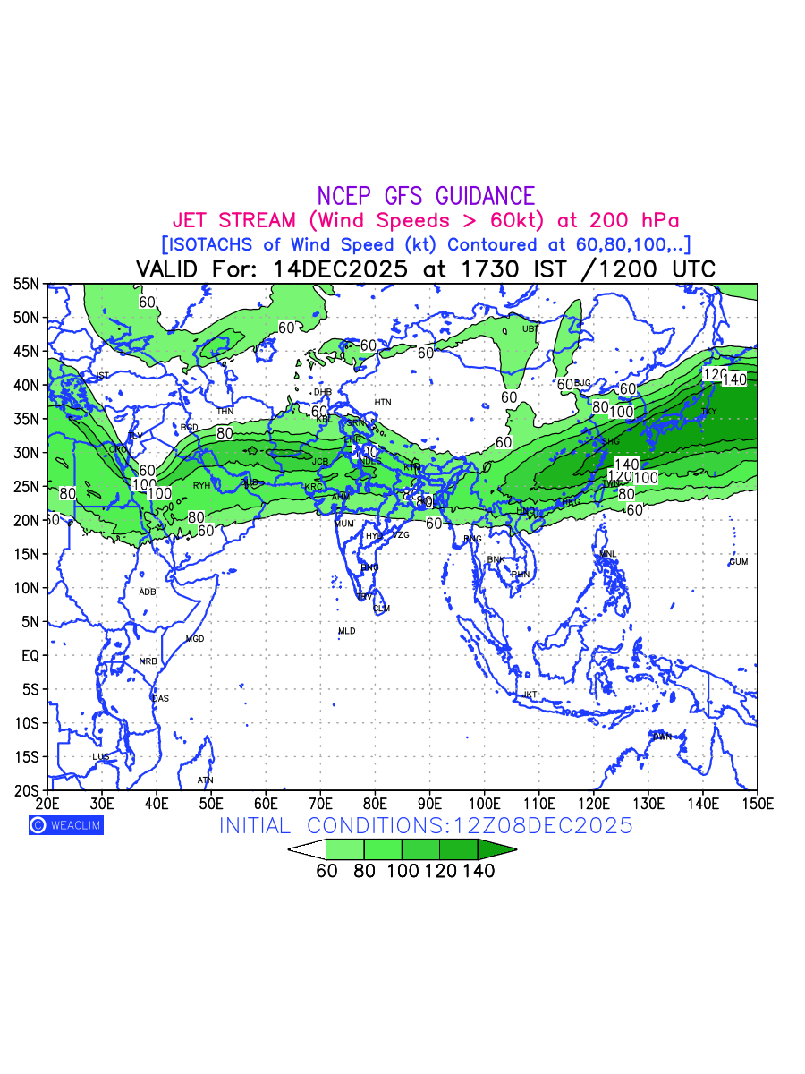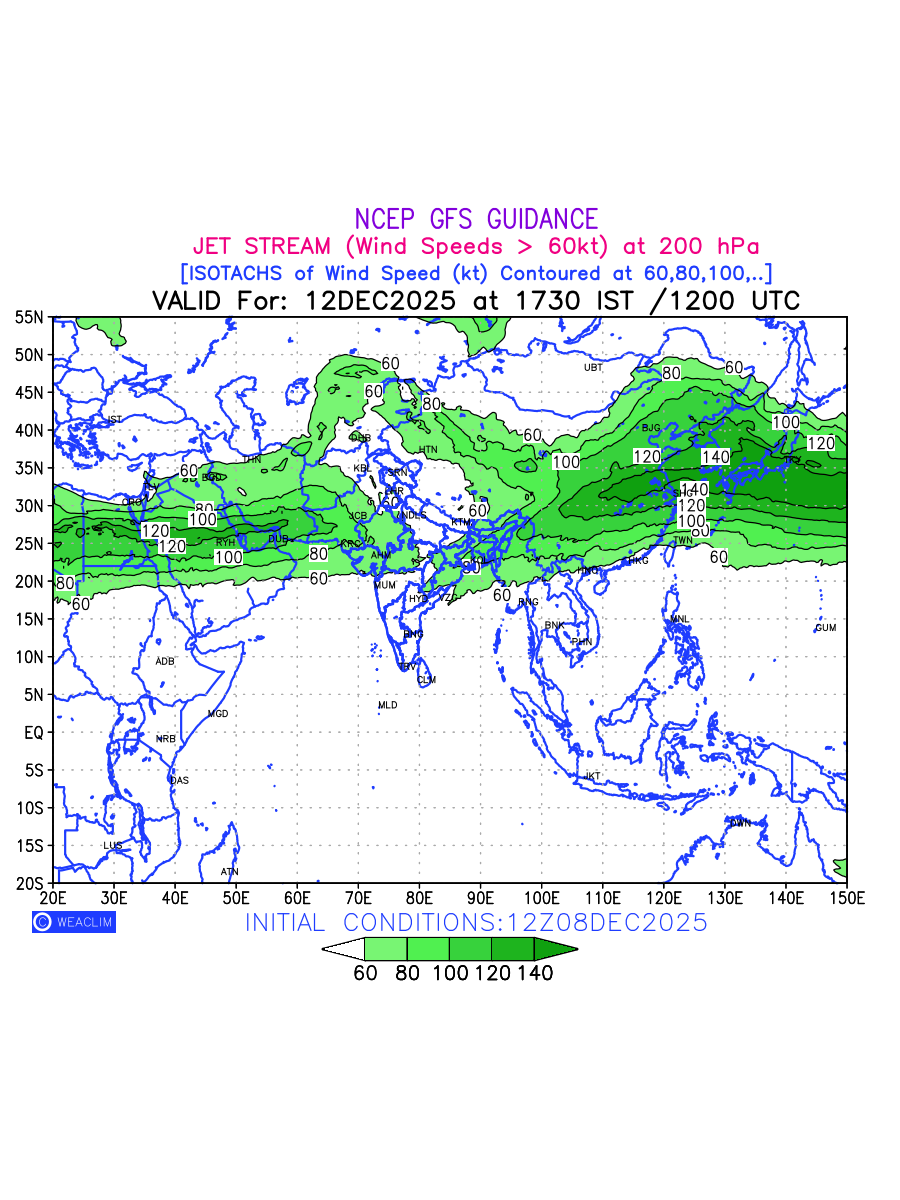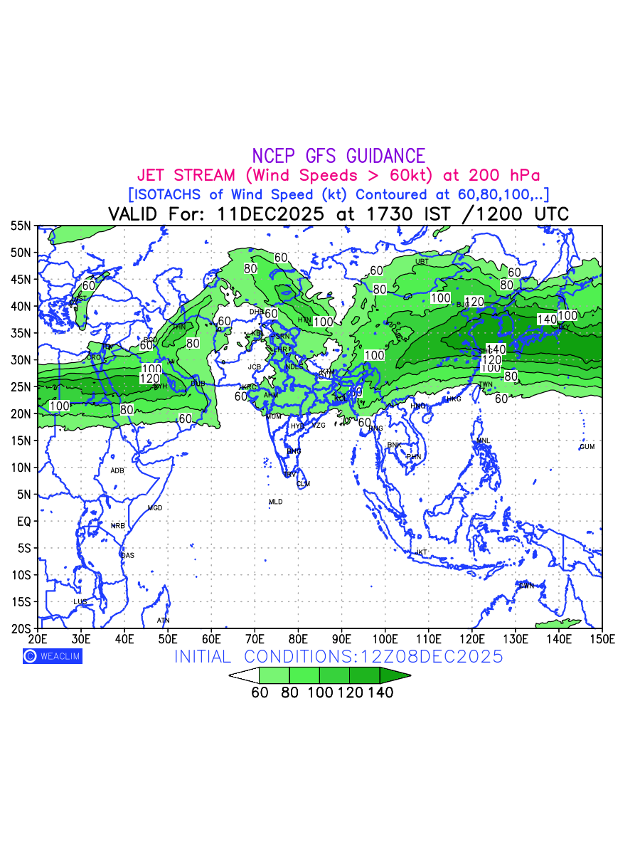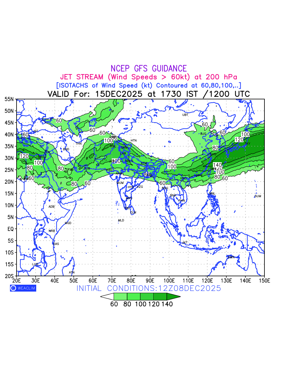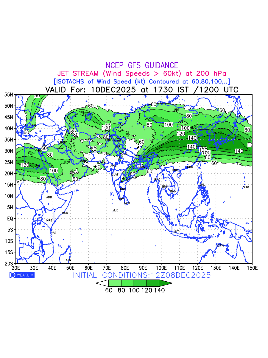 Three features that are significant for aviation are the Jet Stream in upper troposphere, Clear Air Turbulence (CAT) in upper troposphere and Icing in mid troposphere. Shown here is the Jet Stream at 200 hPa for the Eurasian Region for next ten days. Isotachs of winds speed of more than 60 kt are marked at 200 hPa to represent Jet Stream flow at 200 hPa for better appreciation.