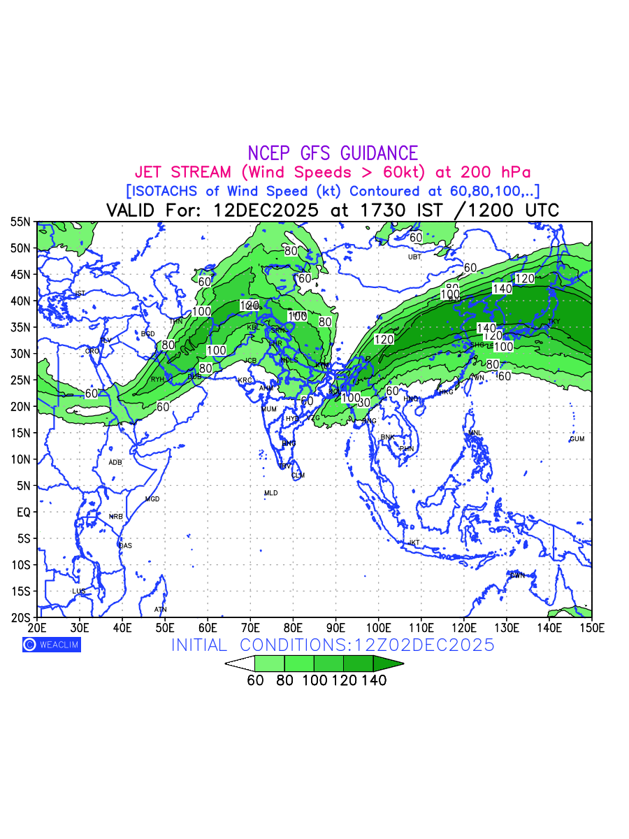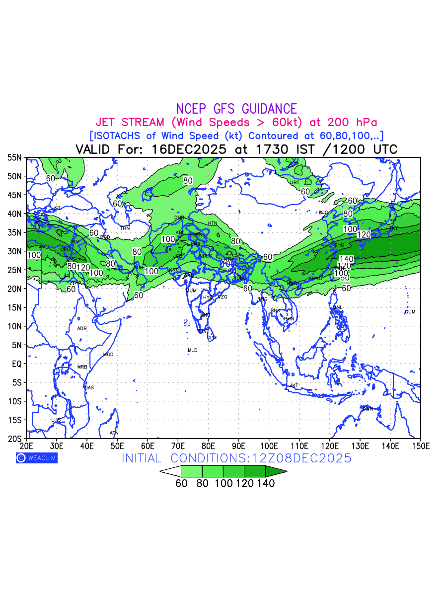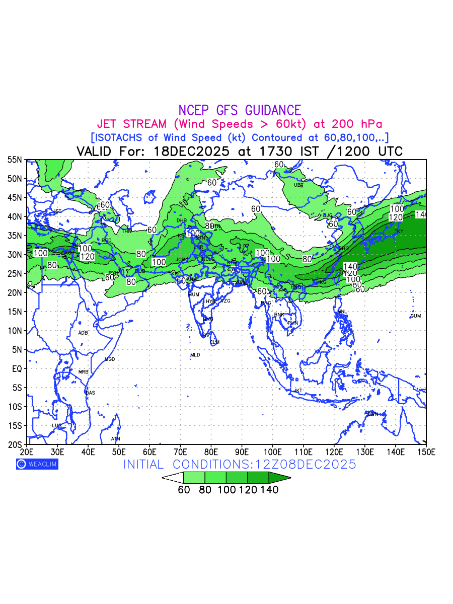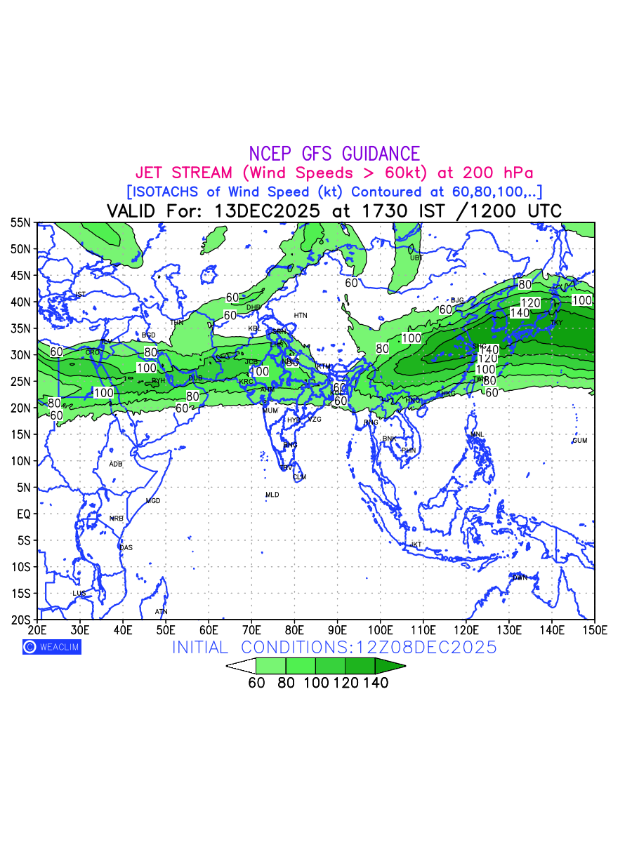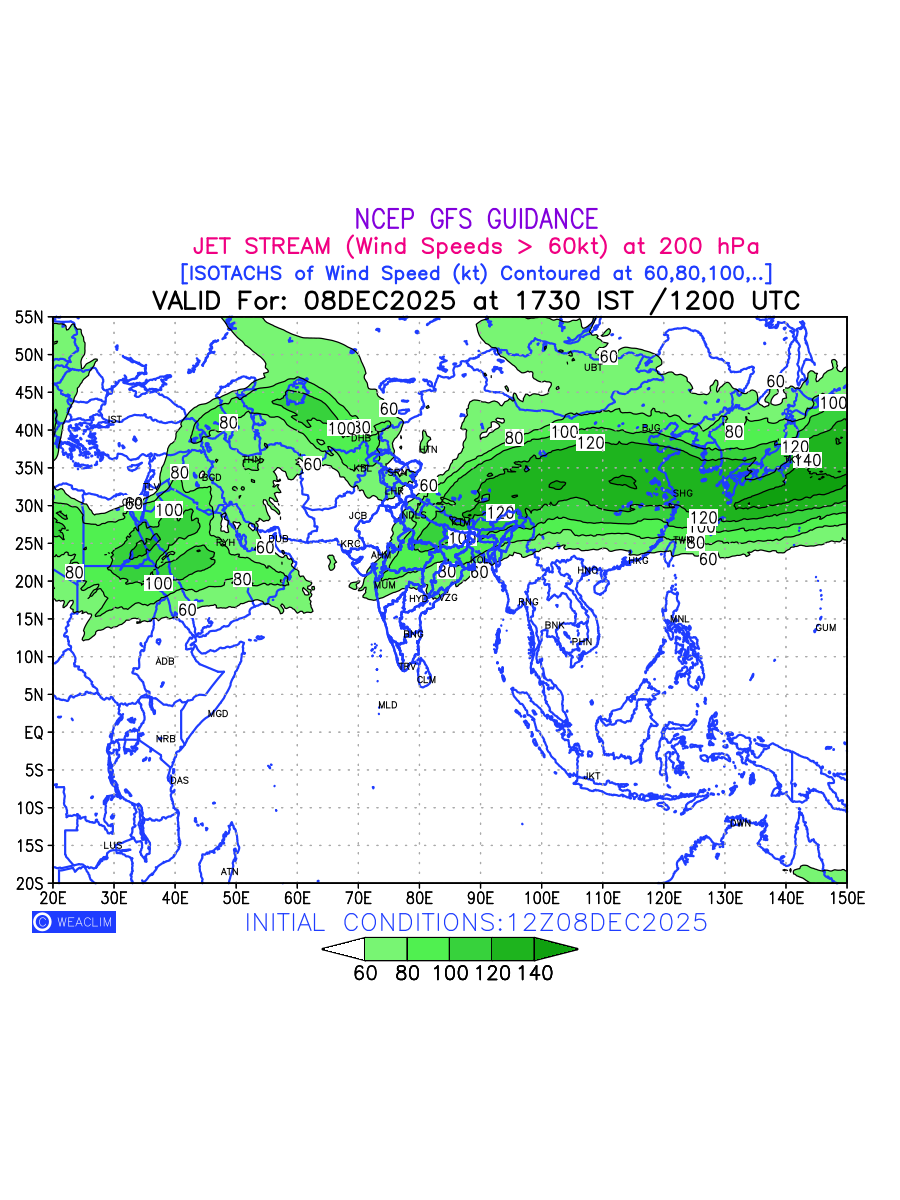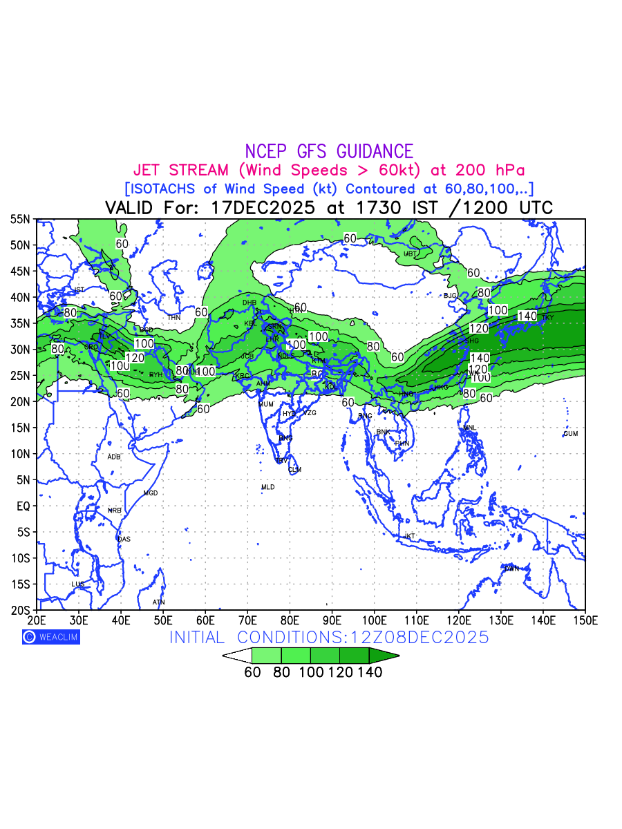 Three features that are significant for aviation are the Jet Stream in upper troposphere, Clear Air Turbulence (CAT) in upper troposphere and Icing in mid troposphere. Shown here is the Jet Stream at 200 hPa for the Eurasian Region for next ten days. Isotachs of winds speed of more than 60 kt are marked at 200 hPa to represent Jet Stream flow at 200 hPa for better appreciation.