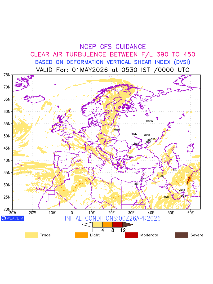 Clear Air Turbulence (CAT) is sudden severe turbulence occurring in cloudless regions that causes violent buffeting of aircraft. CAT is commonly applied to higher altitude turbulence associated with wind shear. It is caused by patches of air swirling chaotically within the world’s jet streams—strong air currents that circle the globe from west to east and that we see on weather maps as wide, wavy lines that bend around low- and high-pressure centre. It is prominent between 500hPa to 200hPa. Shown here are the CAT Conditions at 200hPa for the European Region for the next ten days.