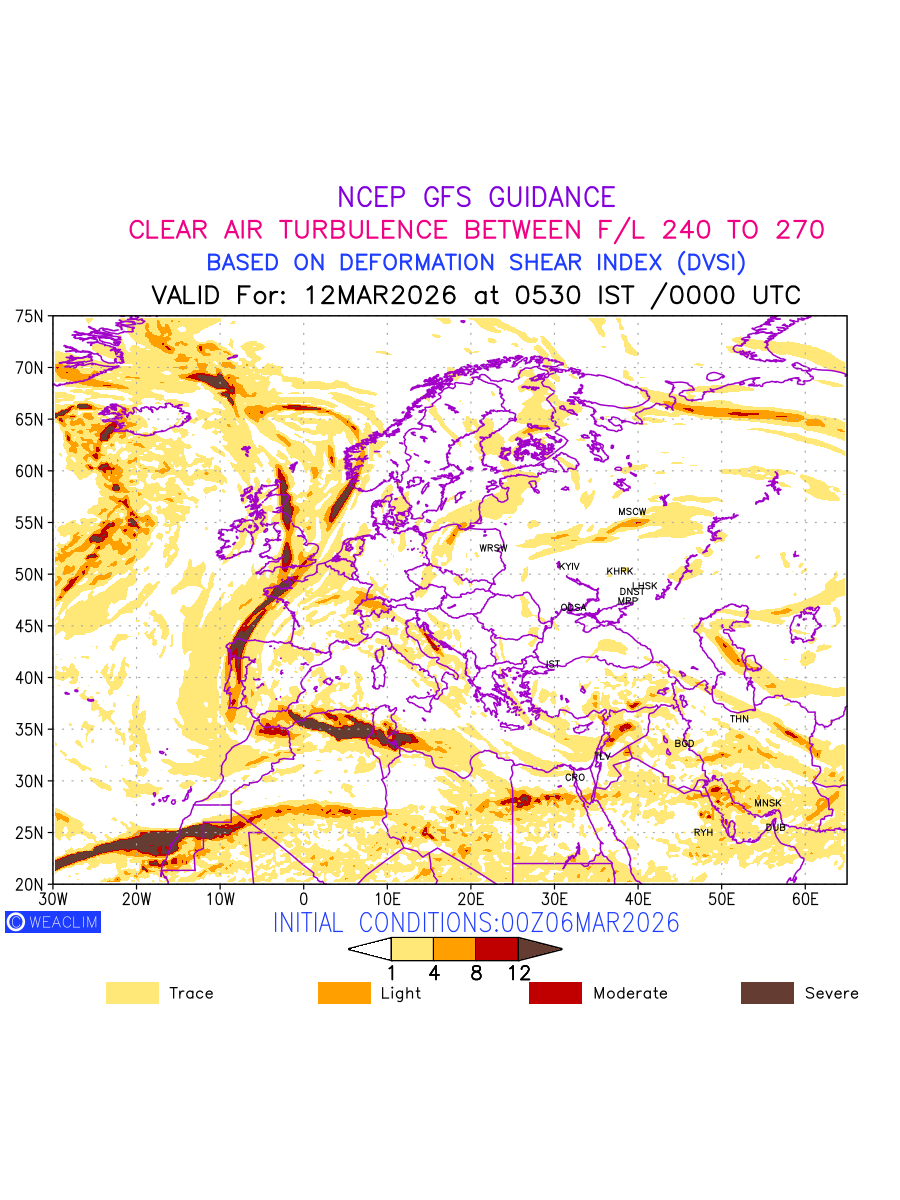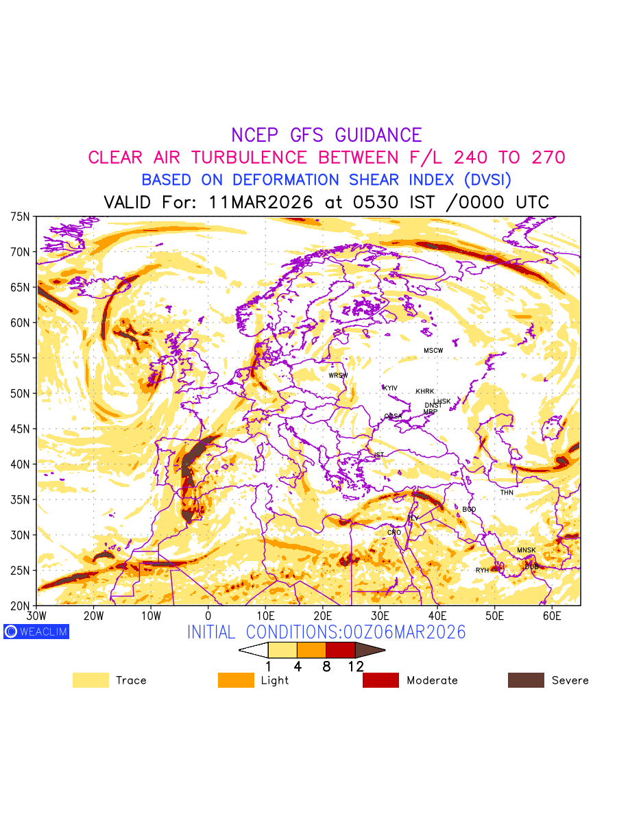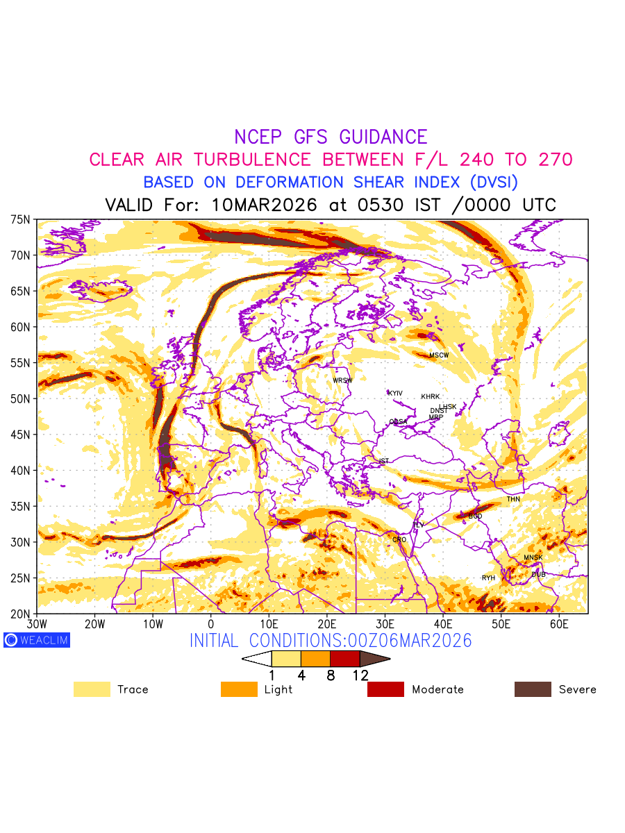 Clear Air Turbulence (CAT) is sudden severe turbulence occurring in cloudless regions that causes violent buffeting of aircraft. CAT is commonly applied to higher altitude turbulence associated with wind shear. It is caused by patches of air swirling chaotically within the world’s jet streams—strong air currents that circle the globe from west to east and that we see on weather maps as wide, wavy lines that bend around low- and high-pressure centre. It is prominent between 500hPa to 200hPa. Shown here are the CAT Conditions at 400hPa for the European Region for the next ten days.