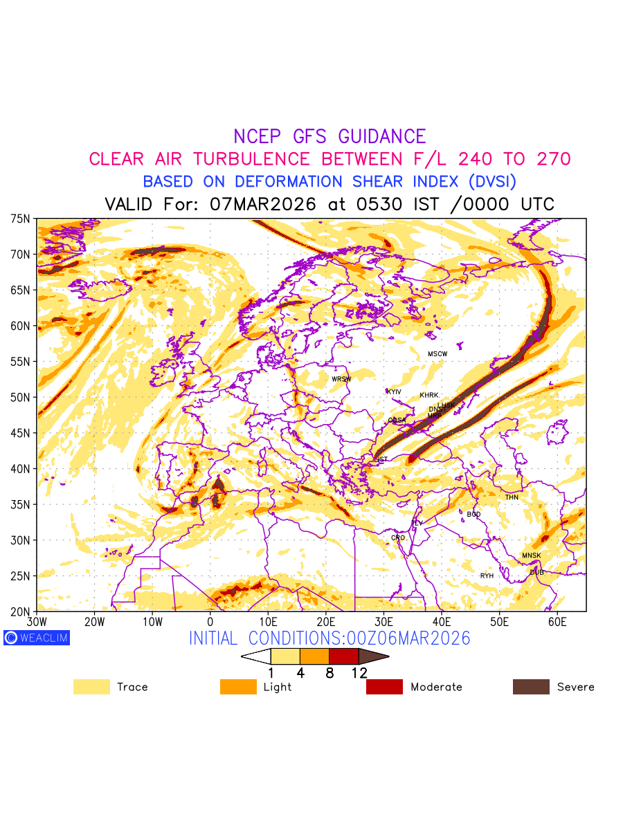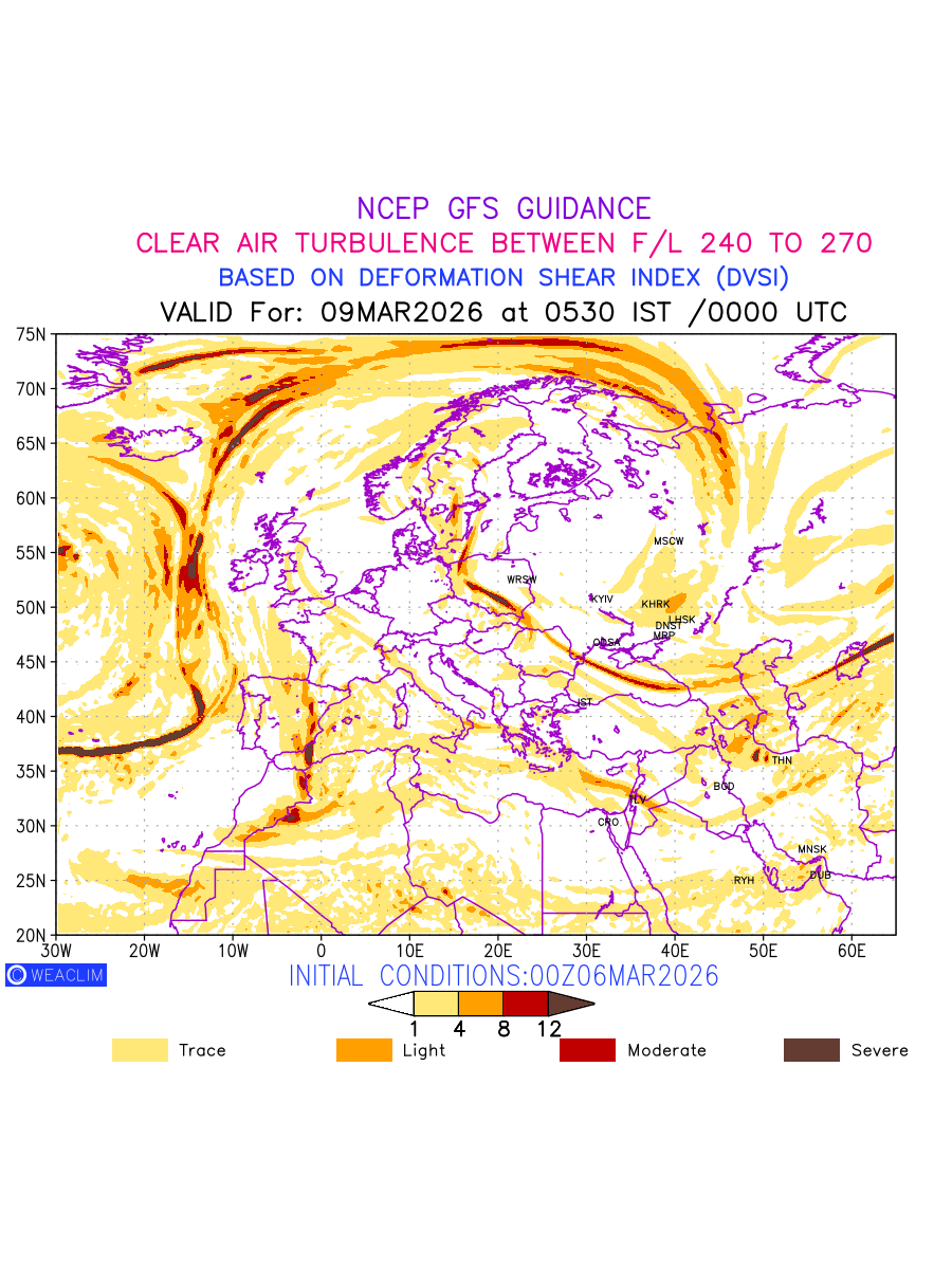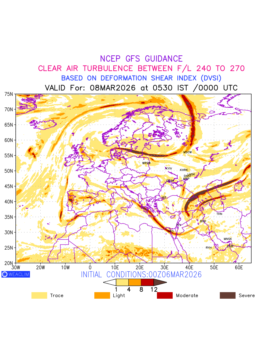 Clear Air Turbulence (CAT) is sudden severe turbulence occurring in cloudless regions that causes violent buffeting of aircraft. CAT is commonly applied to higher altitude turbulence associated with wind shear. It is caused by patches of air swirling chaotically within the world’s jet streams—strong air currents that circle the globe from west to east and that we see on weather maps as wide, wavy lines that bend around low- and high-pressure centre. It is prominent between 500hPa to 200hPa. Shown here are the CAT Conditions at 400hPa for the European Region for the next ten days.