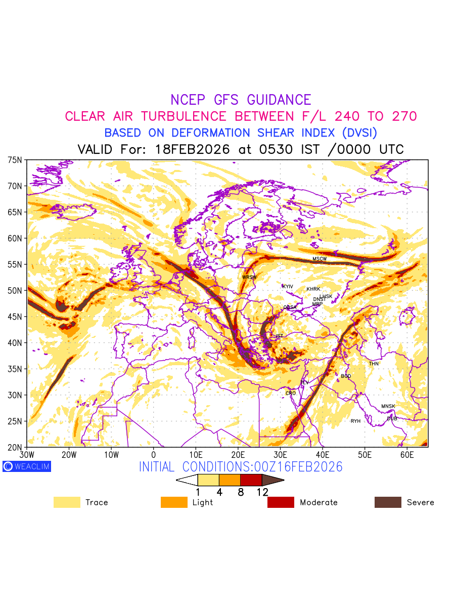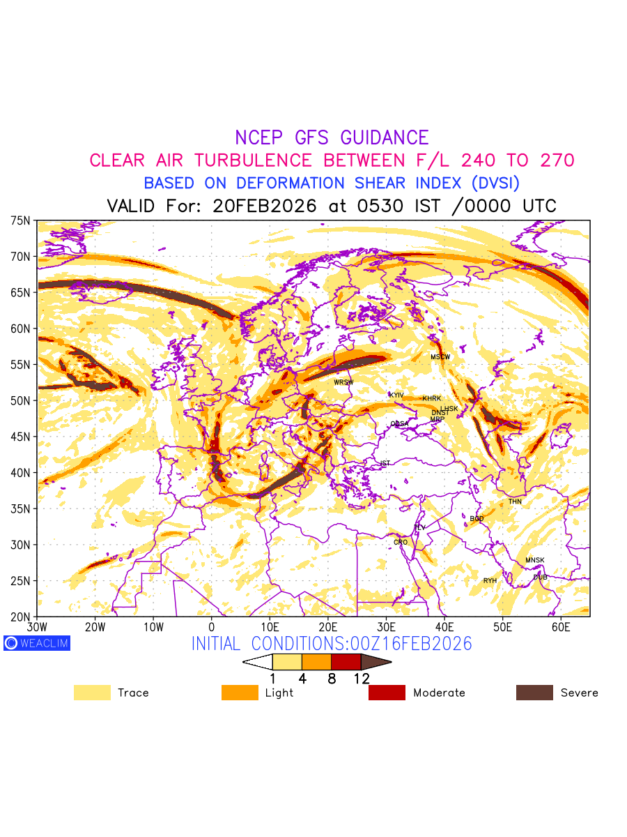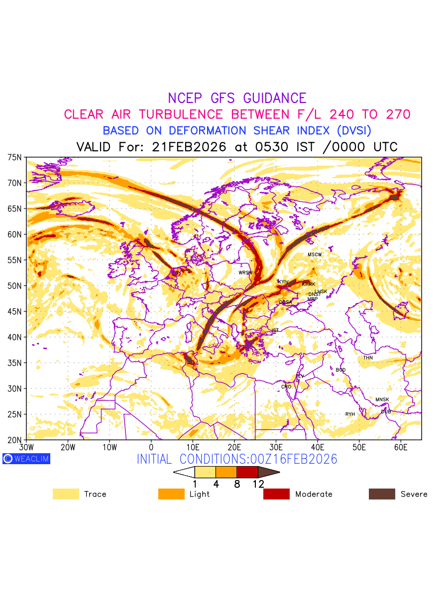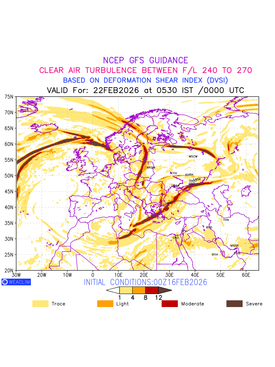 Clear Air Turbulence (CAT) is sudden severe turbulence occurring in cloudless regions that causes violent buffeting of aircraft. CAT is commonly applied to higher altitude turbulence associated with wind shear. It is caused by patches of air swirling chaotically within the world’s jet streams—strong air currents that circle the globe from west to east and that we see on weather maps as wide, wavy lines that bend around low- and high-pressure centre. It is prominent between 500hPa to 200hPa. Shown here are the CAT Conditions at 400hPa for the European Region for the next ten days.