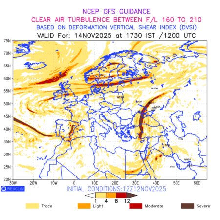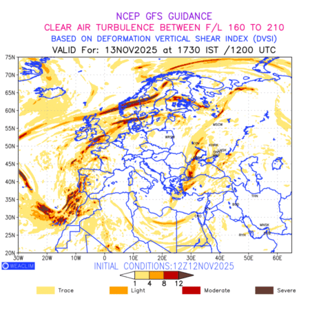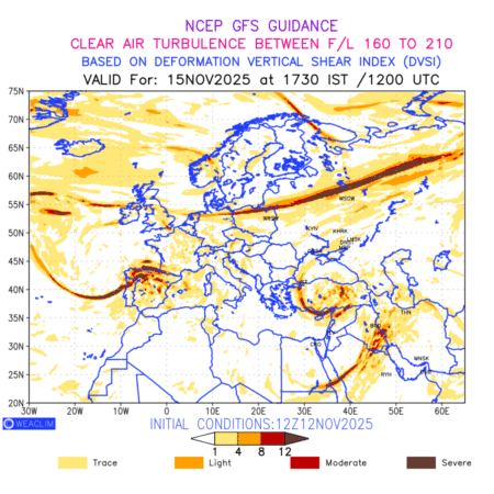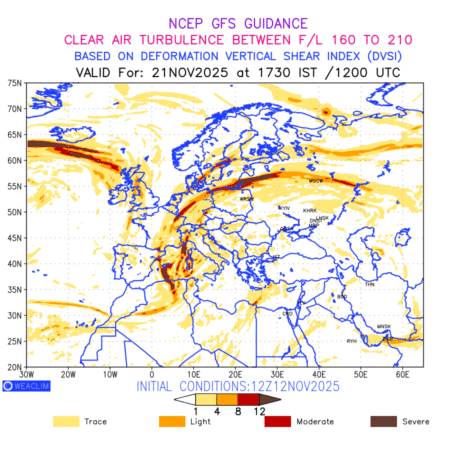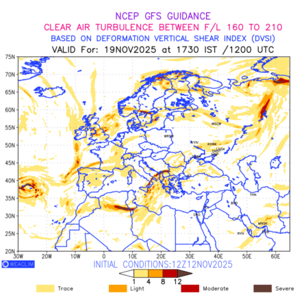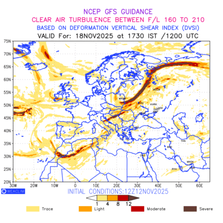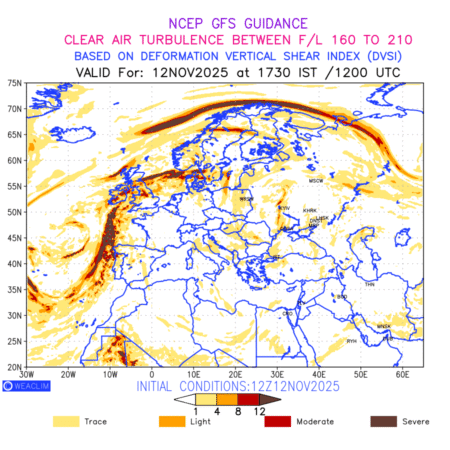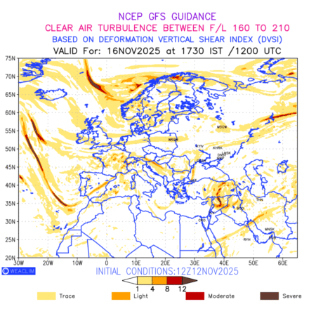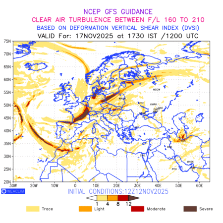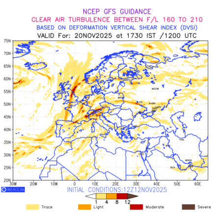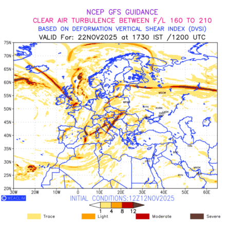 Clear Air Turbulence (CAT) is sudden severe turbulence occurring in cloudless regions that causes violent buffeting of aircraft. CAT is commonly applied to higher altitude turbulence associated with wind shear. It is caused by patches of air swirling chaotically within the world’s jet streams—strong air currents that circle the globe from west to east and that we see on weather maps as wide, wavy lines that bend around low- and high-pressure centre. It is prominent between 500hPa to 200hPa. Shown here are the CAT Conditions at 500hPa for the European Region for the next ten days.