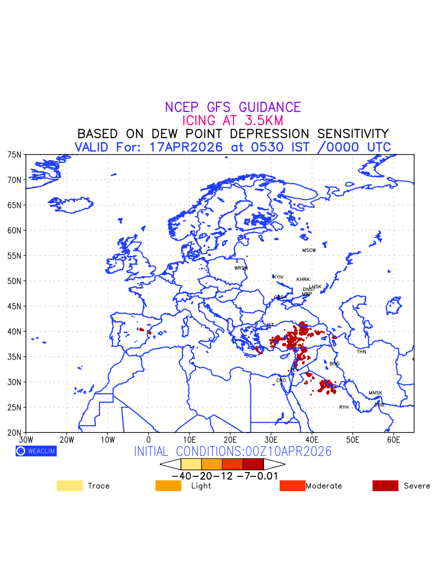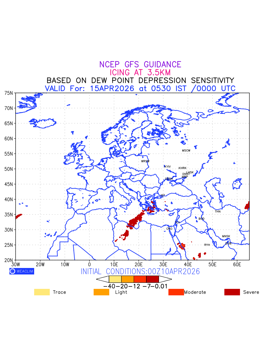 Known icing conditions exist when visible moisture or high relative humidity combines with temperatures near or below freezing. Icing conditions are only present in temperatures between 0ºC and -40ºC, with the highest risk occurring between 0ºC and -15ºC. The size and temperature of the supercooled water droplets that impact on the aircraft determine the category of ice that is formed. Icing is prominent between 600hPa to 700hPa level. Shown here is the icing condition at 700hPa level for the Eurapean Region for the next ten days.