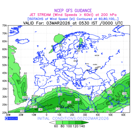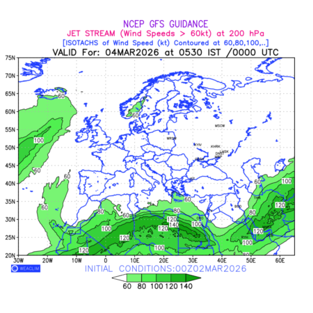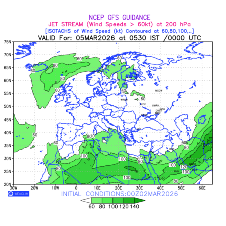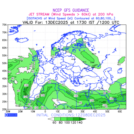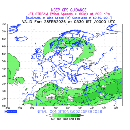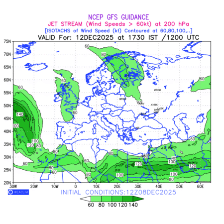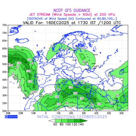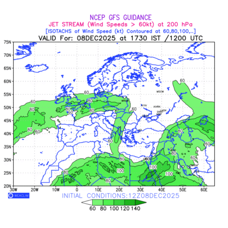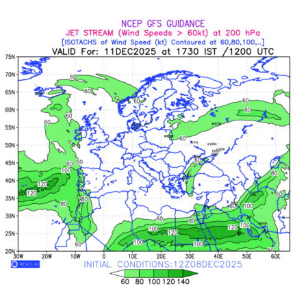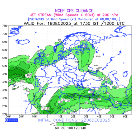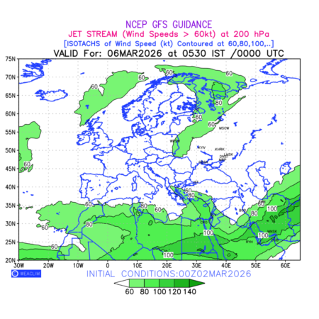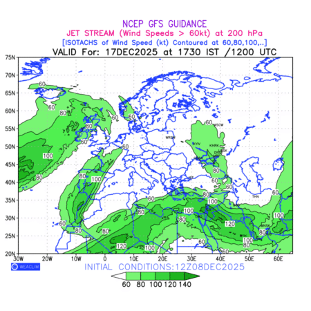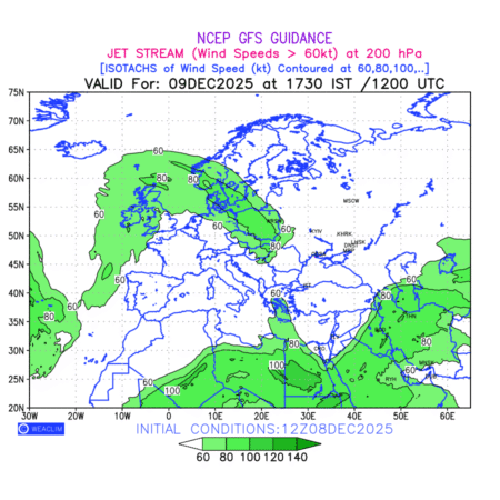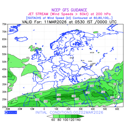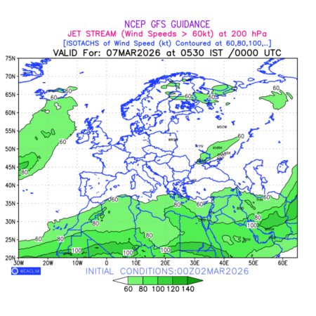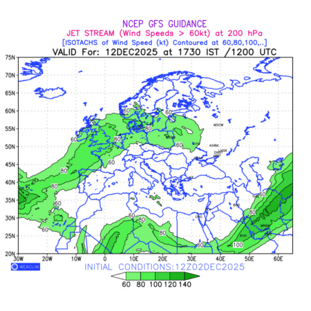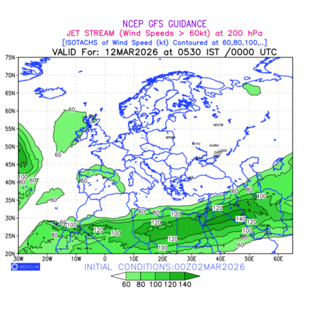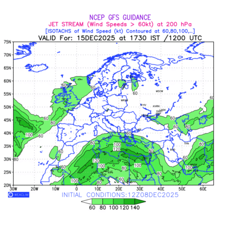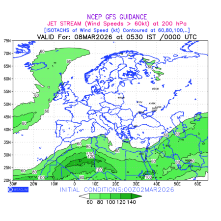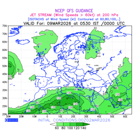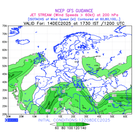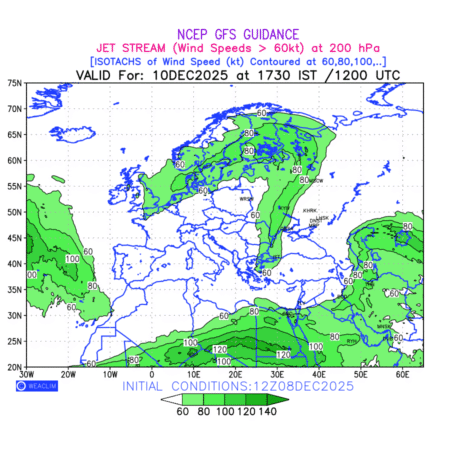 Three features that are significant for aviation are the Jet Stream in upper troposphere, Clear Air Turbulence (CAT) in upper troposphere and Icing in mid troposphere. Shown here is the Jet Stream at 200 hPa for the Europian Region for next ten days. Isotachs of winds speed of more than 60 kt are marked at 200 hPa to represent Jet Stream flow at 200 hPa for better appreciation.