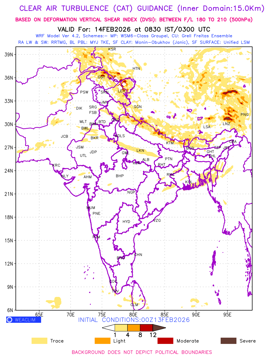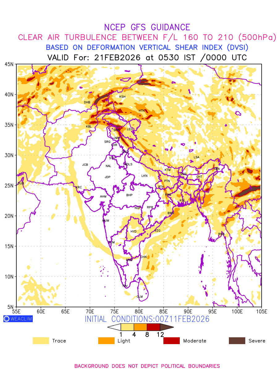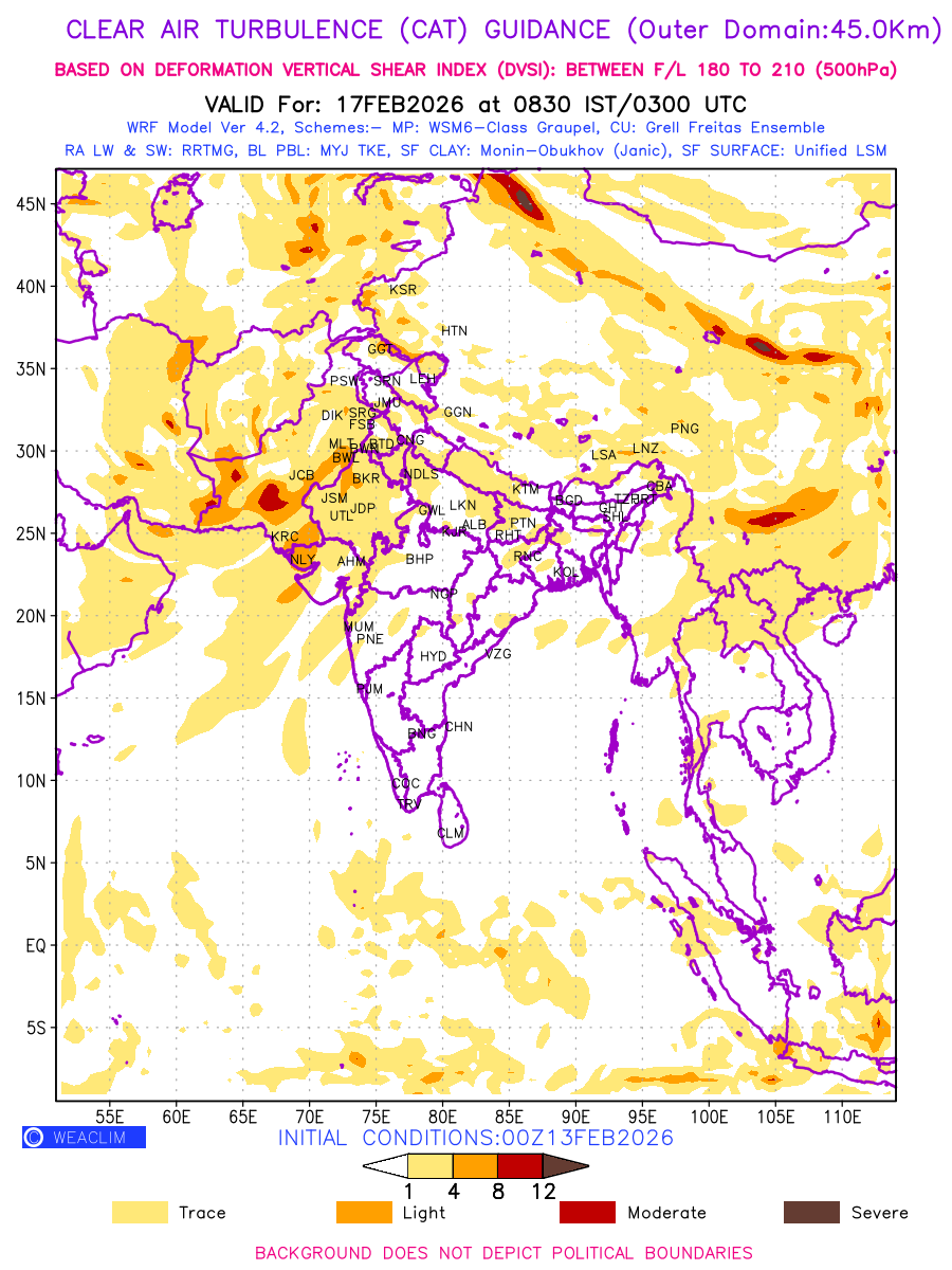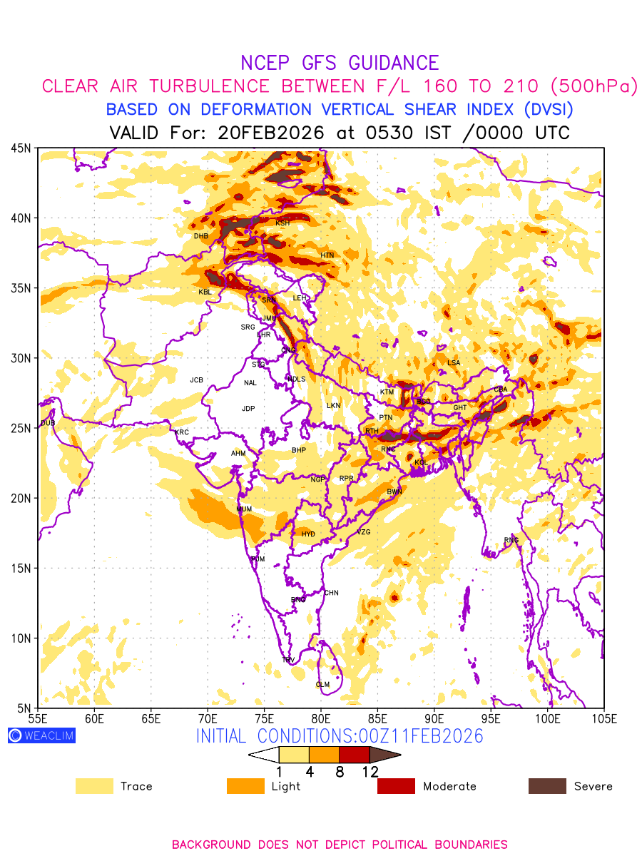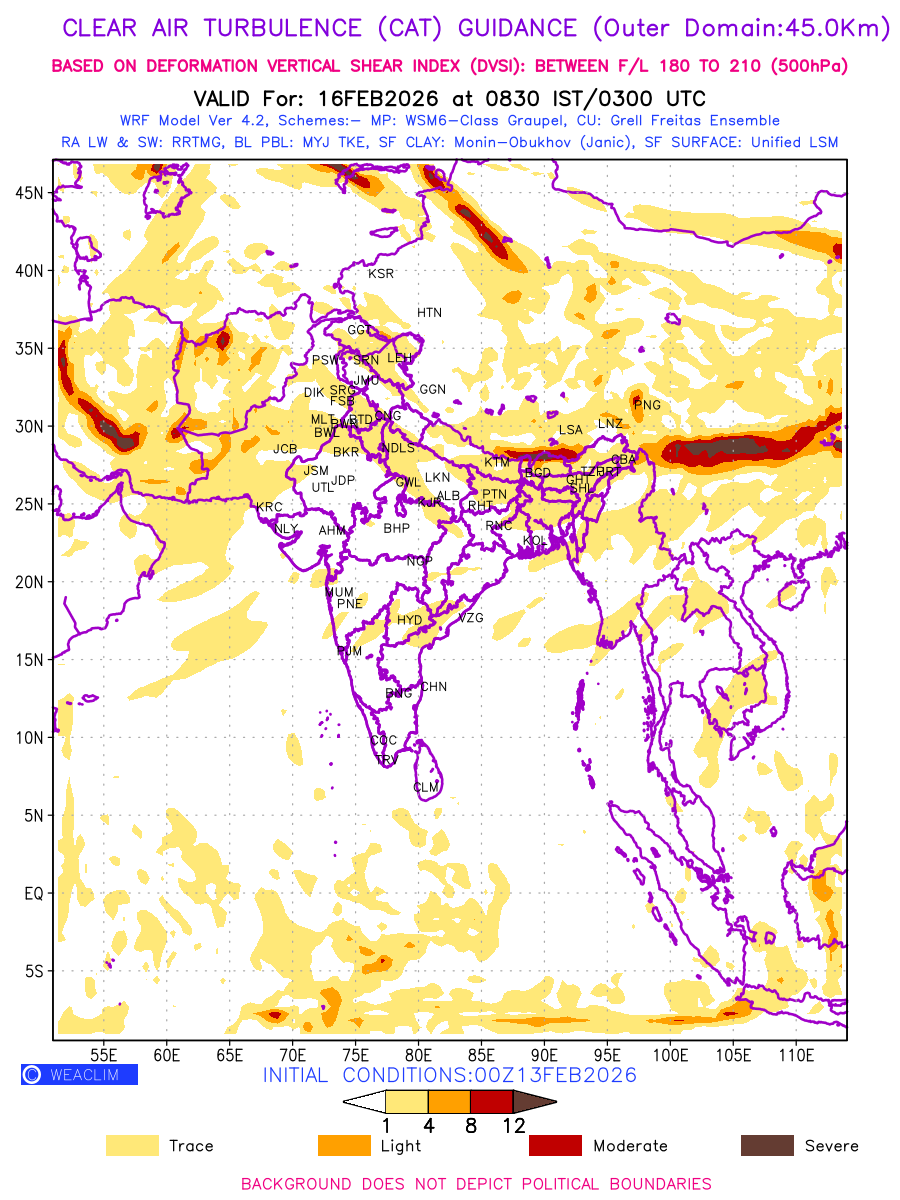 Clear Air Turbulence (CAT) is sudden severe turbulence occurring in cloudless regions that causes violent buffeting of aircraft. CAT is commonly applied to higher altitude turbulence associated with wind shear. It is caused by patches of air swirling chaotically within the world’s jet streams—strong air currents that circle the globe from west to east and that we see on weather maps as wide, wavy lines that bend around low- and high-pressure centre. It is prominent between 500hPa to 200hPa. Shown here are the CAT Conditions at 500hPa for the Indian Region for the next ten days.