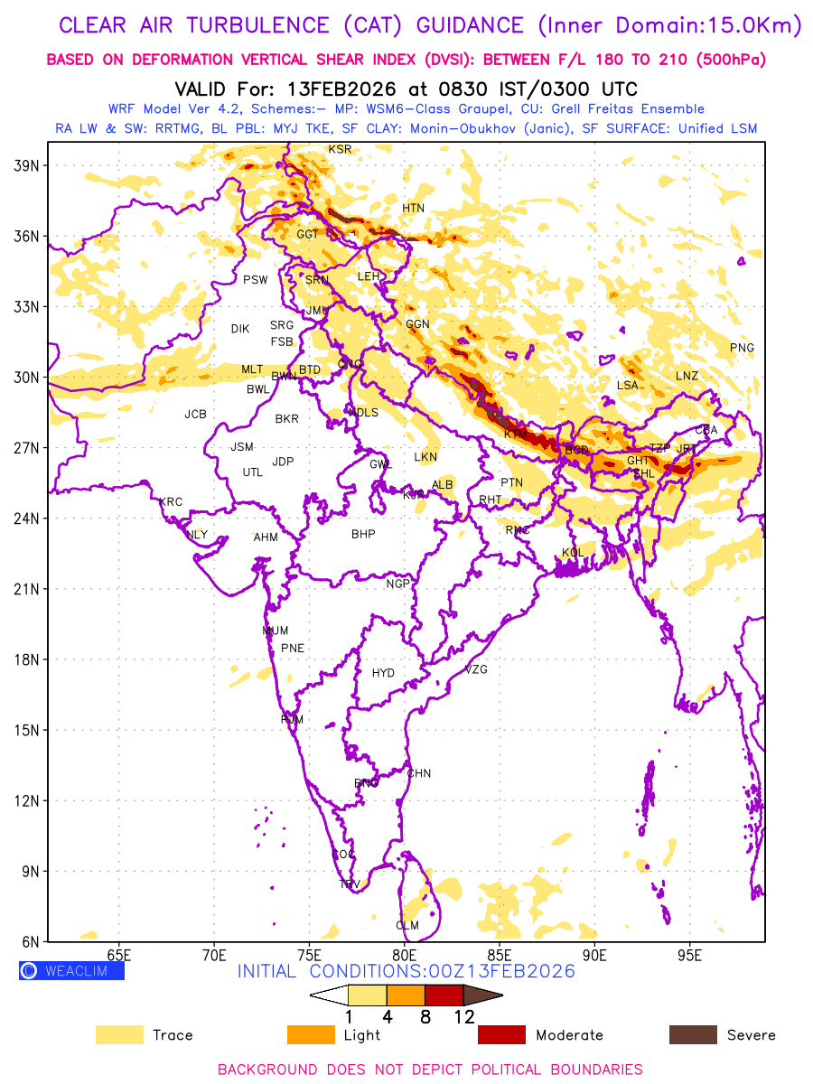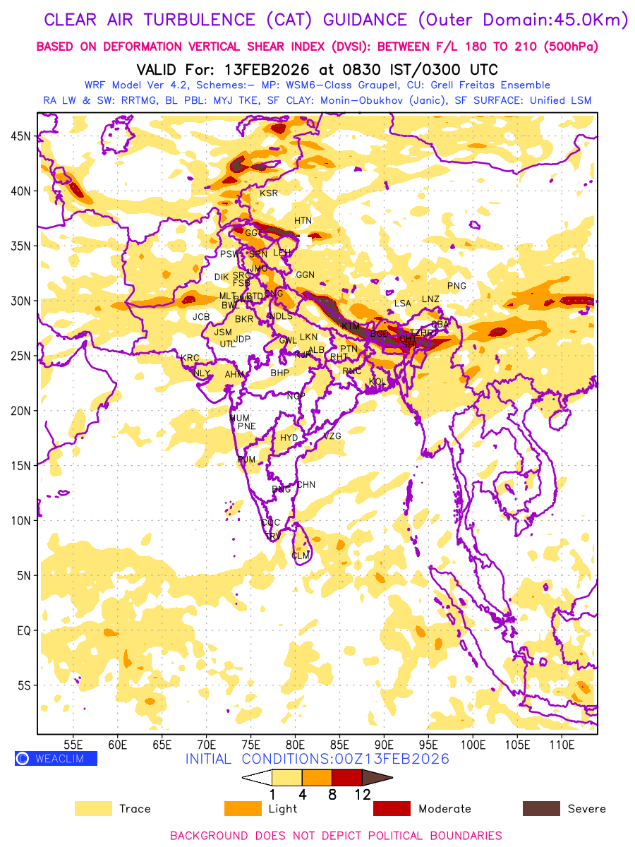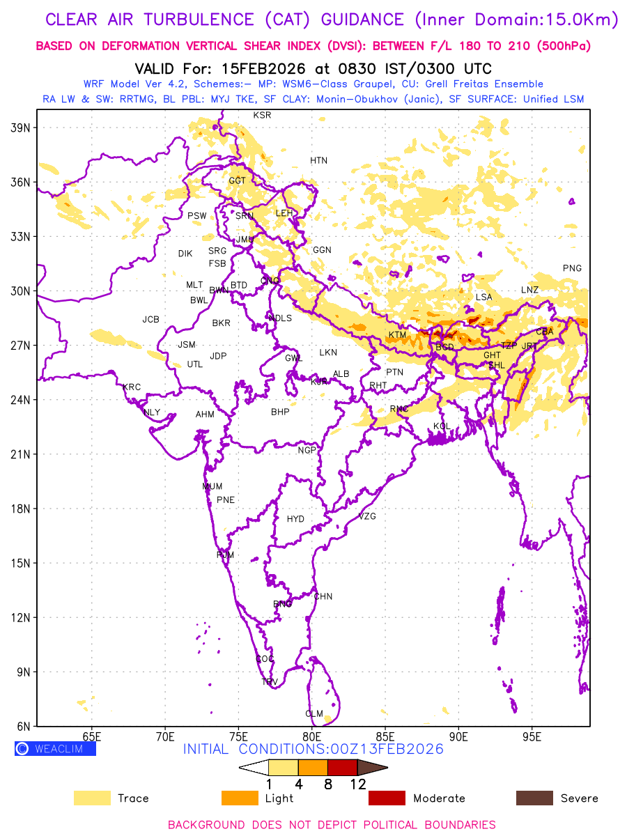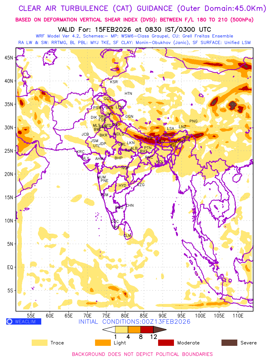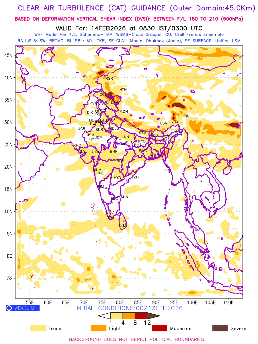 Clear Air Turbulence (CAT) is sudden severe turbulence occurring in cloudless regions that causes violent buffeting of aircraft. CAT is commonly applied to higher altitude turbulence associated with wind shear. It is caused by patches of air swirling chaotically within the world’s jet streams—strong air currents that circle the globe from west to east and that we see on weather maps as wide, wavy lines that bend around low- and high-pressure centre. It is prominent between 500hPa to 200hPa. Shown here are the CAT Conditions at 500hPa for the Indian Region for the next ten days.