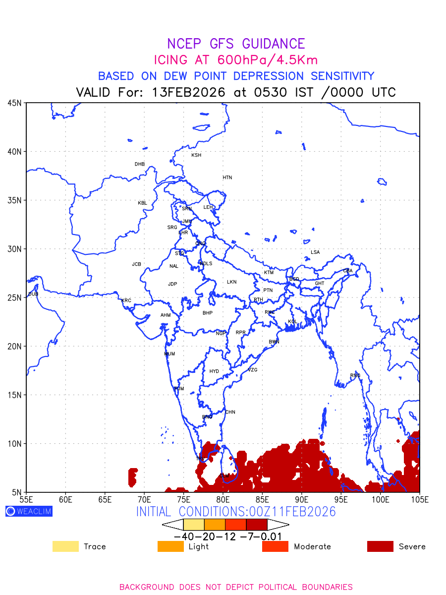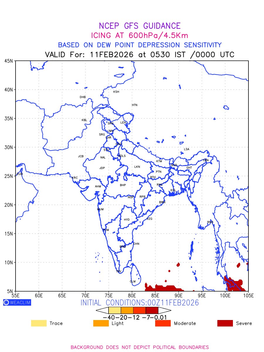 Known icing conditions exist when visible moisture or high relative humidity combines with temperatures near or below freezing. Icing conditions are only present in temperatures between 0ºC and -40ºC, with the highest risk occurring between 0ºC and -15ºC. The size and temperature of the supercooled water droplets that impact on the aircraft determine the category of ice that is formed. Icing is prominent between 600hPa to 700hPa level. Shown here is the icing condition at 600hPa level for the Indian Region for the next ten days.