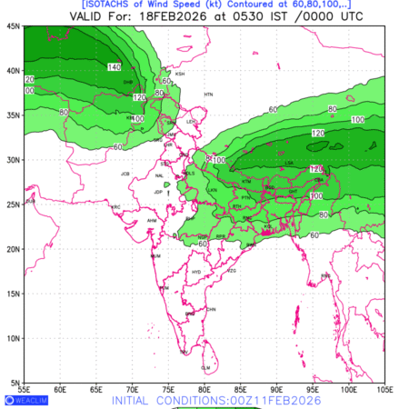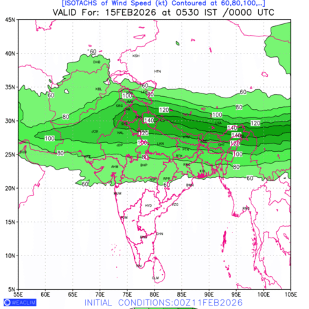 Three features that are significant for aviation are the Jet Stream in upper troposphere, Clear Air Turbulence (CAT) in upper troposphere and Icing in mid troposphere. Shown here is the Jet Stream at 200 hPa for the Indian Region for next ten days. Isotachs of winds speed of more than 60 kt are marked at 200 hPa to represent Jet Stream flow at 200 hPa for better appreciation.
