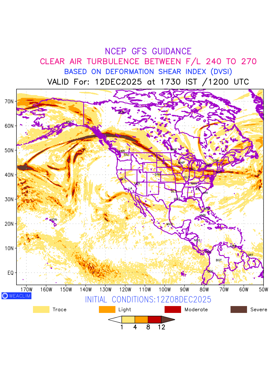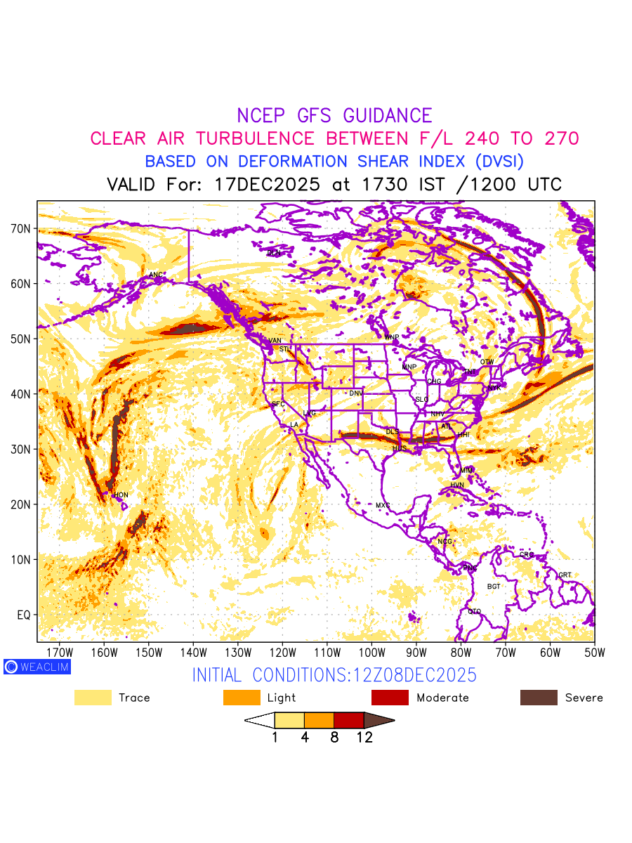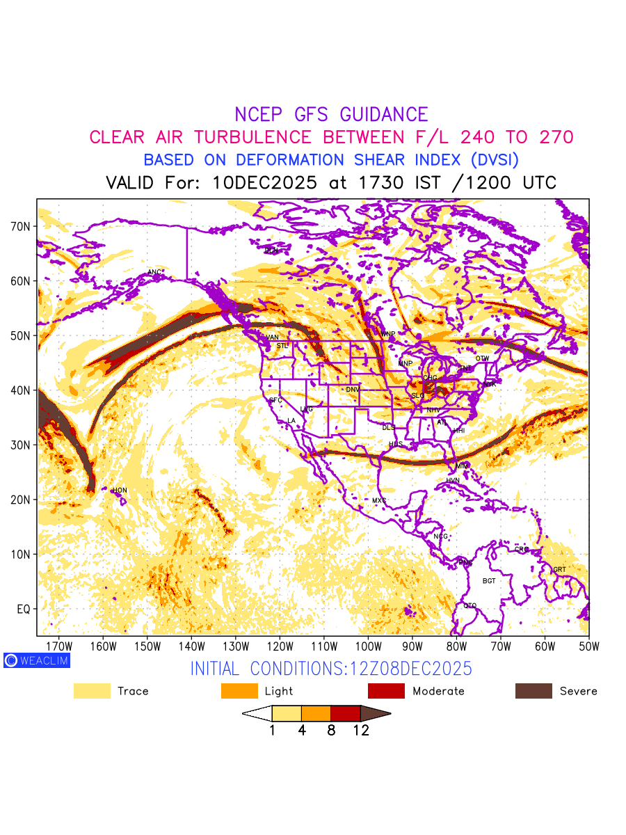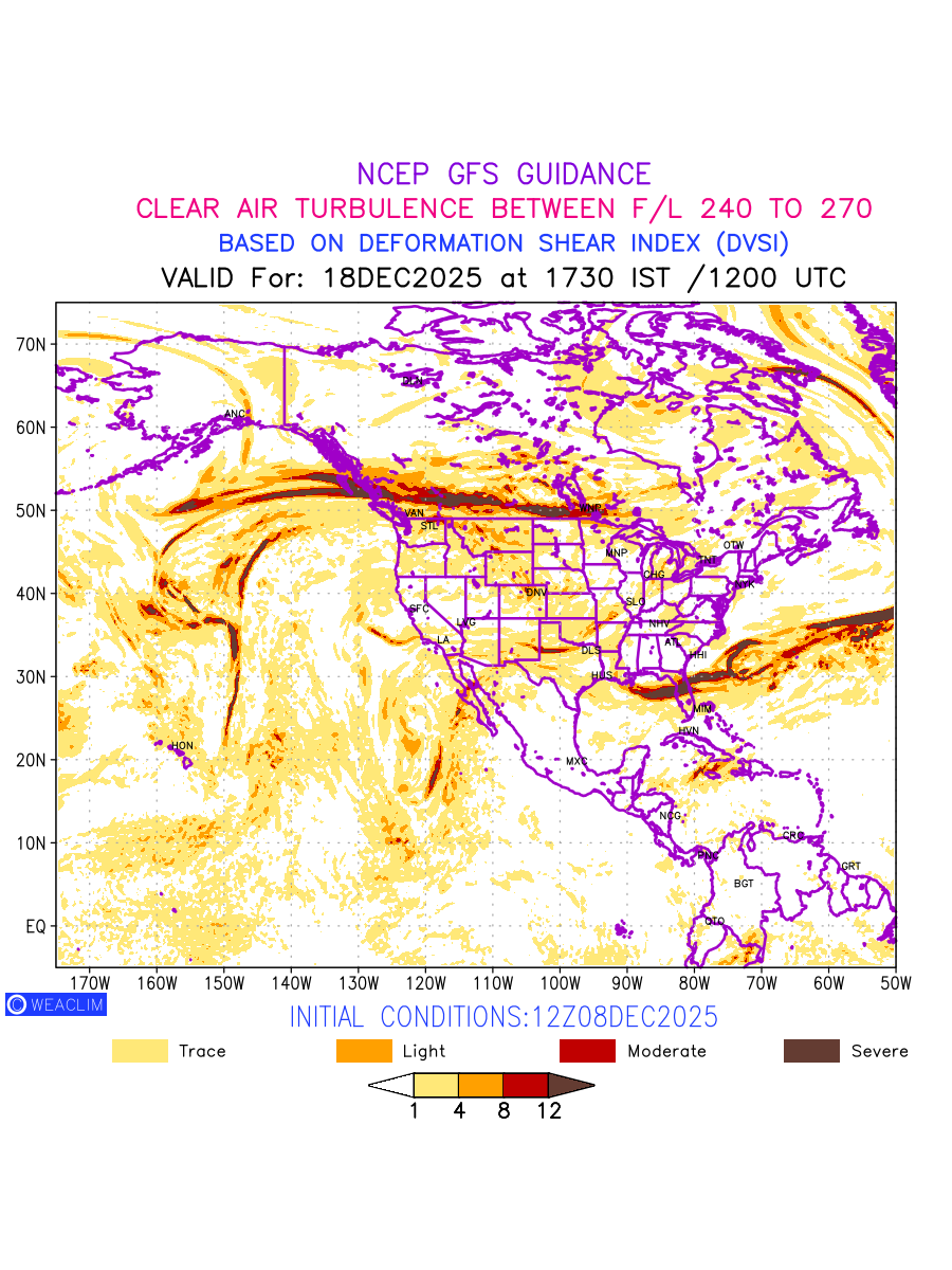Clear Air Turbulence (CAT) is sudden severe turbulence occurring in cloudless regions that causes violent buffeting of aircraft. CAT is commonly applied to higher altitude turbulence associated with wind shear. It is caused by patches of air swirling chaotically within the world’s jet streams—strong air currents that circle the globe from west to east and that we see on weather maps as wide, wavy lines that bend around low- and high-pressure centre. It is prominent between 500hPa to 200hPa. Shown here are the CAT Conditions at 400hPa for the North American Region for the next ten days.