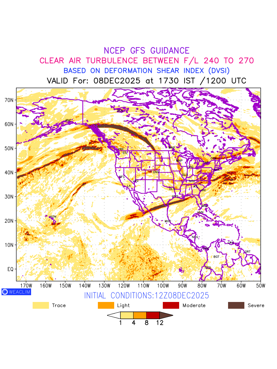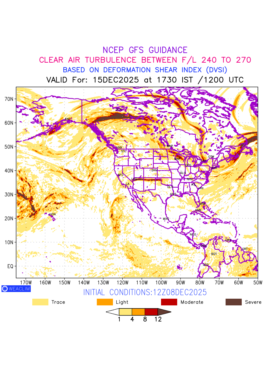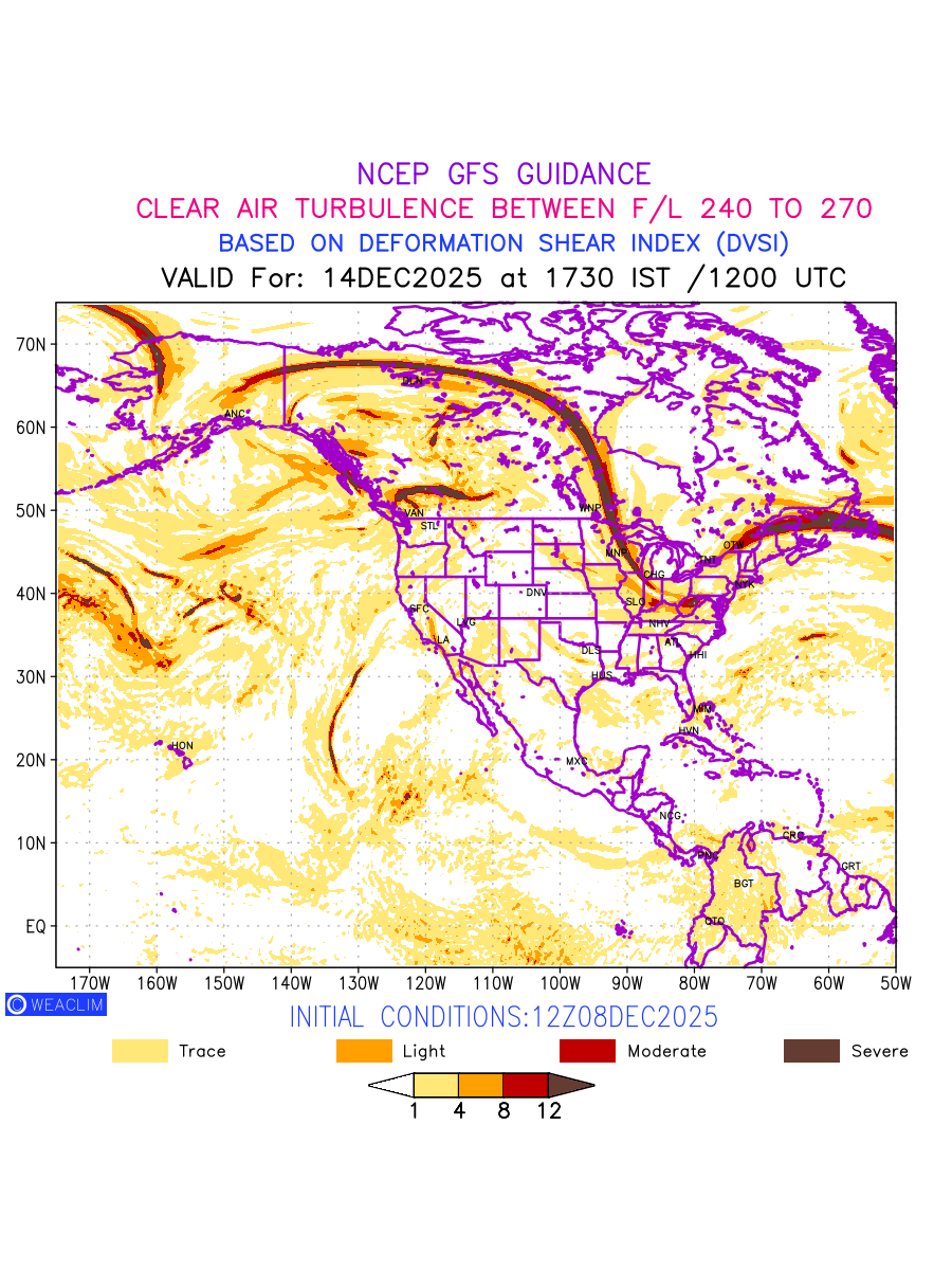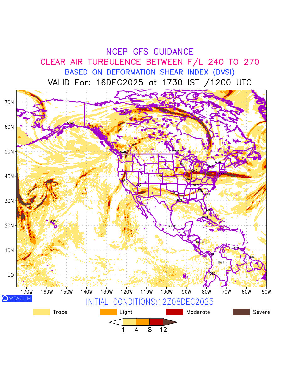 Clear Air Turbulence (CAT) is sudden severe turbulence occurring in cloudless regions that causes violent buffeting of aircraft. CAT is commonly applied to higher altitude turbulence associated with wind shear. It is caused by patches of air swirling chaotically within the world’s jet streams—strong air currents that circle the globe from west to east and that we see on weather maps as wide, wavy lines that bend around low- and high-pressure centre. It is prominent between 500hPa to 200hPa. Shown here are the CAT Conditions at 400hPa for the North American Region for the next ten days.