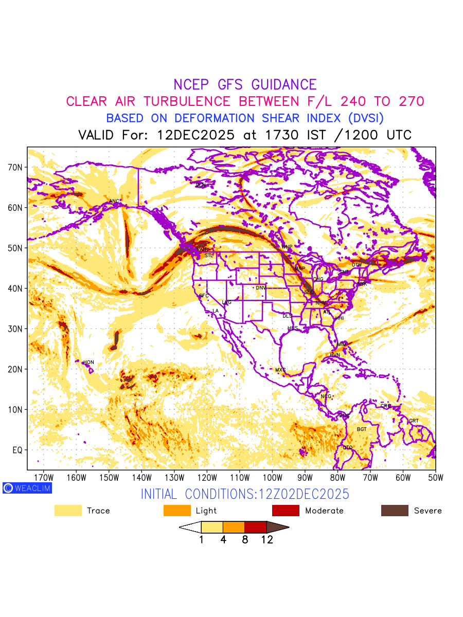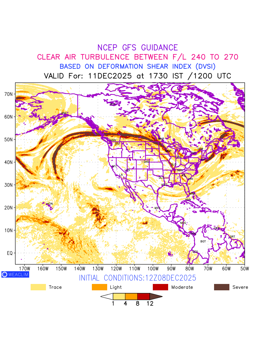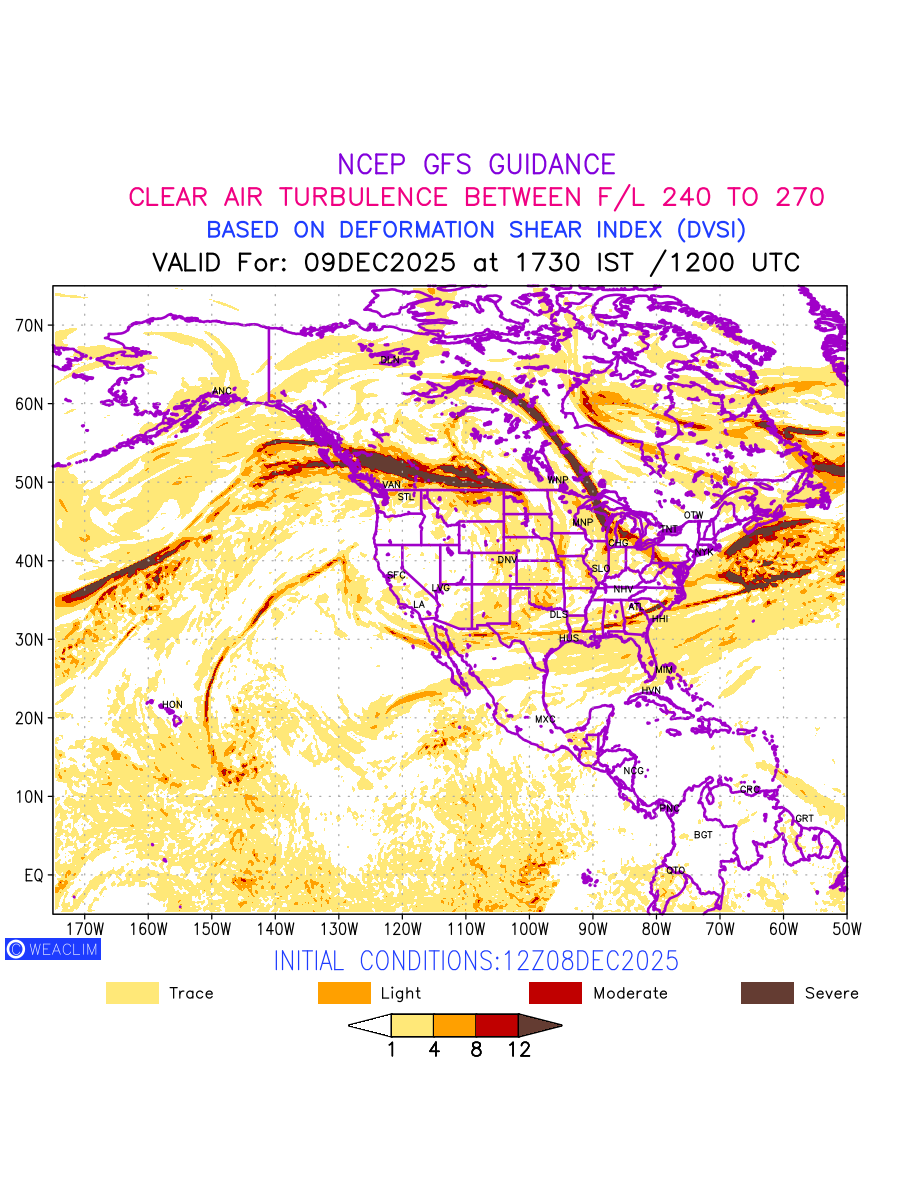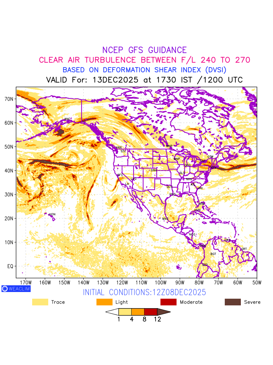 Clear Air Turbulence (CAT) is sudden severe turbulence occurring in cloudless regions that causes violent buffeting of aircraft. CAT is commonly applied to higher altitude turbulence associated with wind shear. It is caused by patches of air swirling chaotically within the world’s jet streams—strong air currents that circle the globe from west to east and that we see on weather maps as wide, wavy lines that bend around low- and high-pressure centre. It is prominent between 500hPa to 200hPa. Shown here are the CAT Conditions at 400hPa for the North American Region for the next ten days.