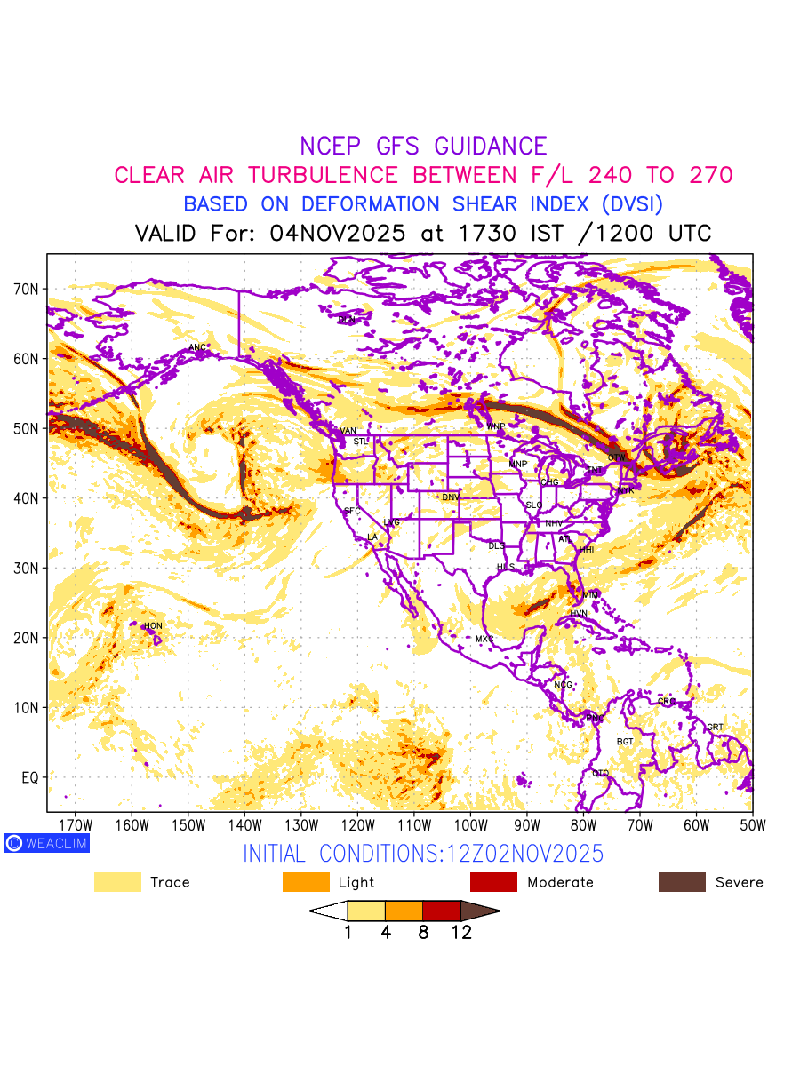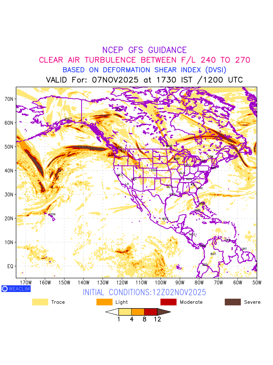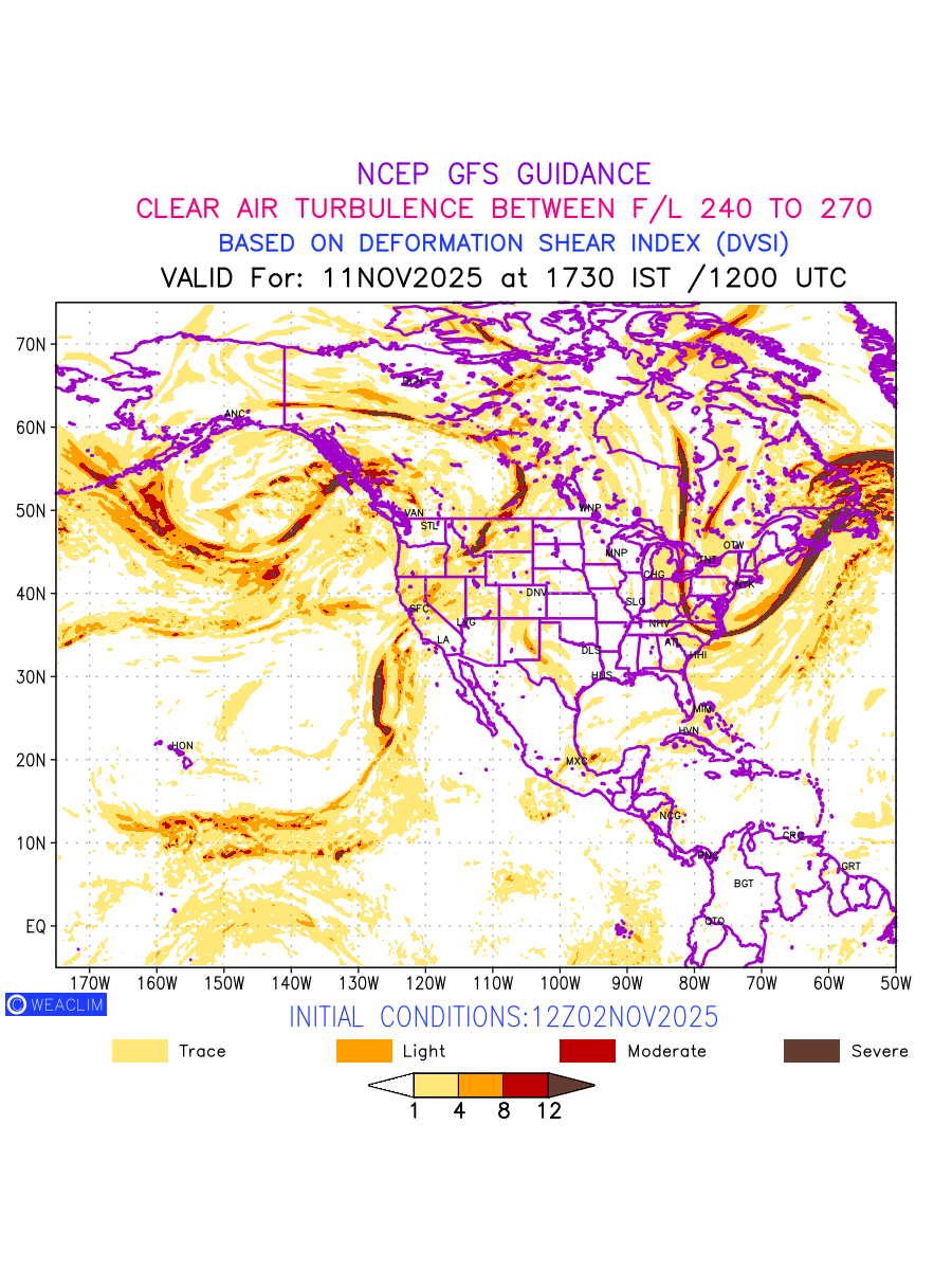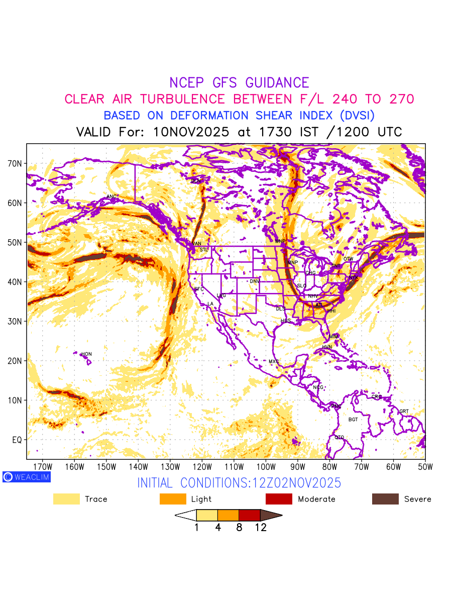 Clear Air Turbulence (CAT) is sudden severe turbulence occurring in cloudless regions that causes violent buffeting of aircraft. CAT is commonly applied to higher altitude turbulence associated with wind shear. It is caused by patches of air swirling chaotically within the world’s jet streams—strong air currents that circle the globe from west to east and that we see on weather maps as wide, wavy lines that bend around low- and high-pressure centre. It is prominent between 500hPa to 200hPa. Shown here are the CAT Conditions at 400hPa for the North American Region for the next ten days.