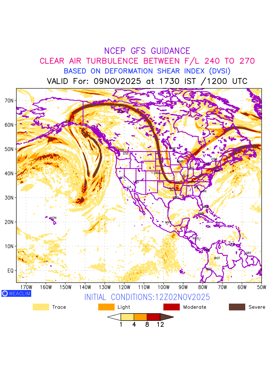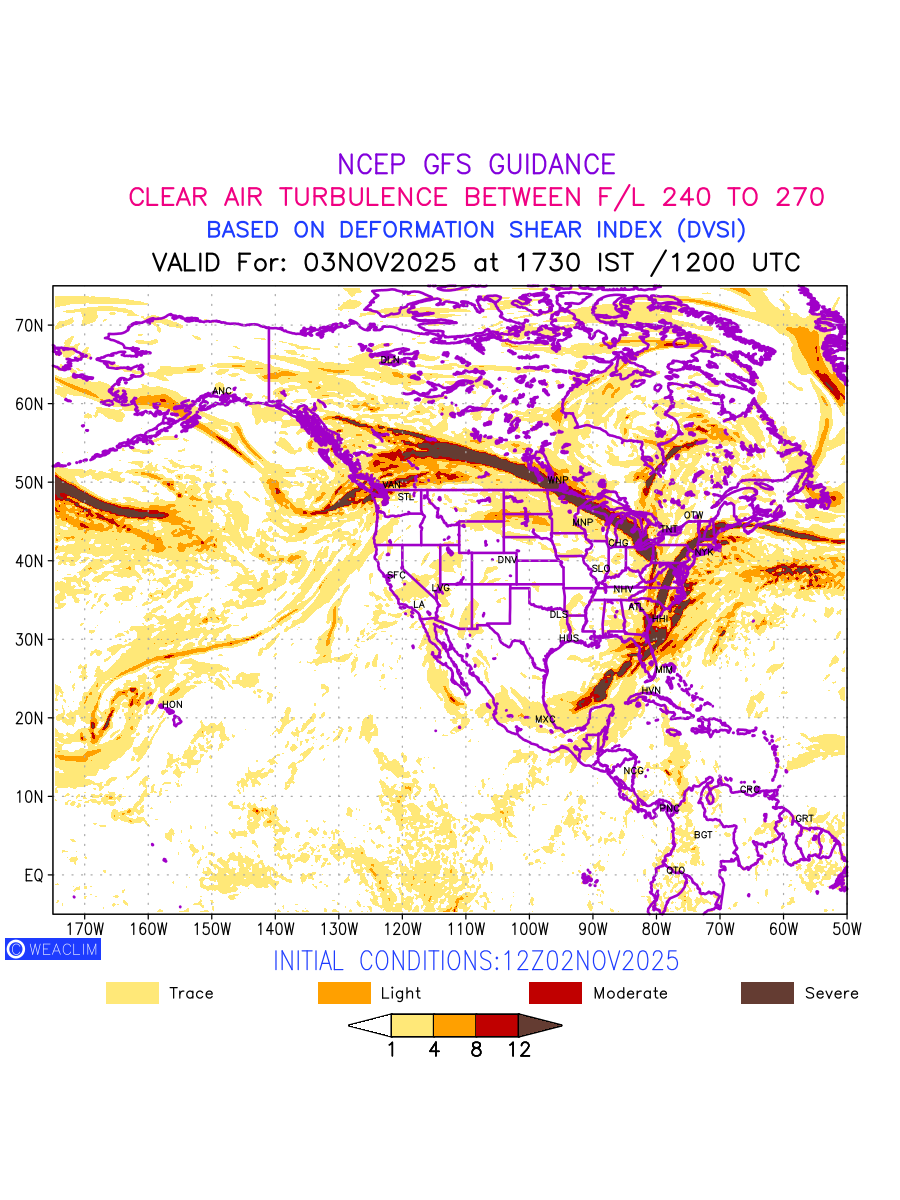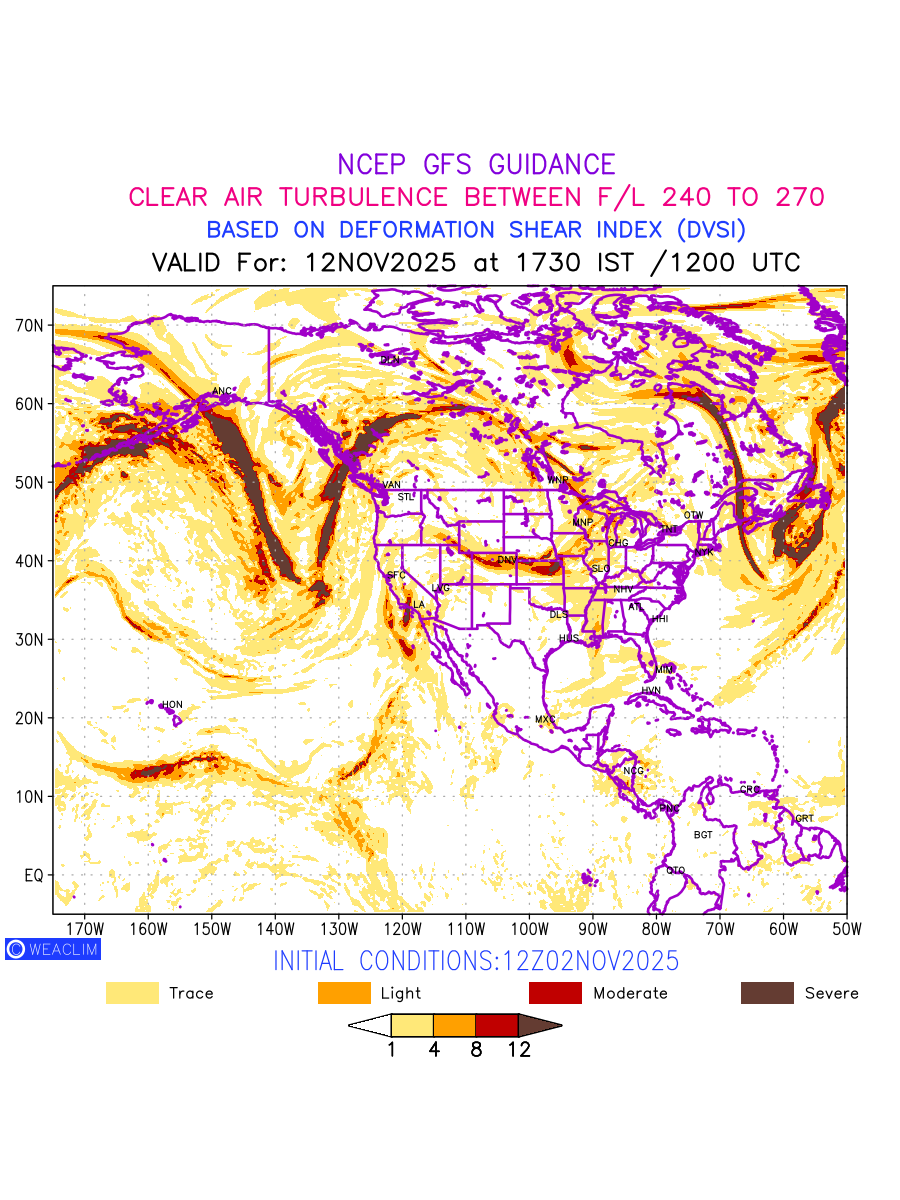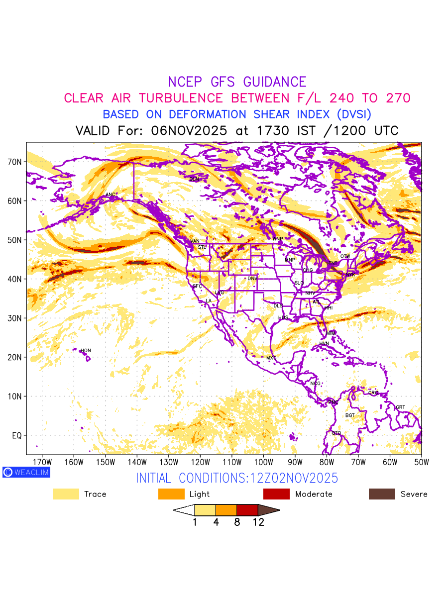 Clear Air Turbulence (CAT) is sudden severe turbulence occurring in cloudless regions that causes violent buffeting of aircraft. CAT is commonly applied to higher altitude turbulence associated with wind shear. It is caused by patches of air swirling chaotically within the world’s jet streams—strong air currents that circle the globe from west to east and that we see on weather maps as wide, wavy lines that bend around low- and high-pressure centre. It is prominent between 500hPa to 200hPa. Shown here are the CAT Conditions at 400hPa for the North American Region for the next ten days.